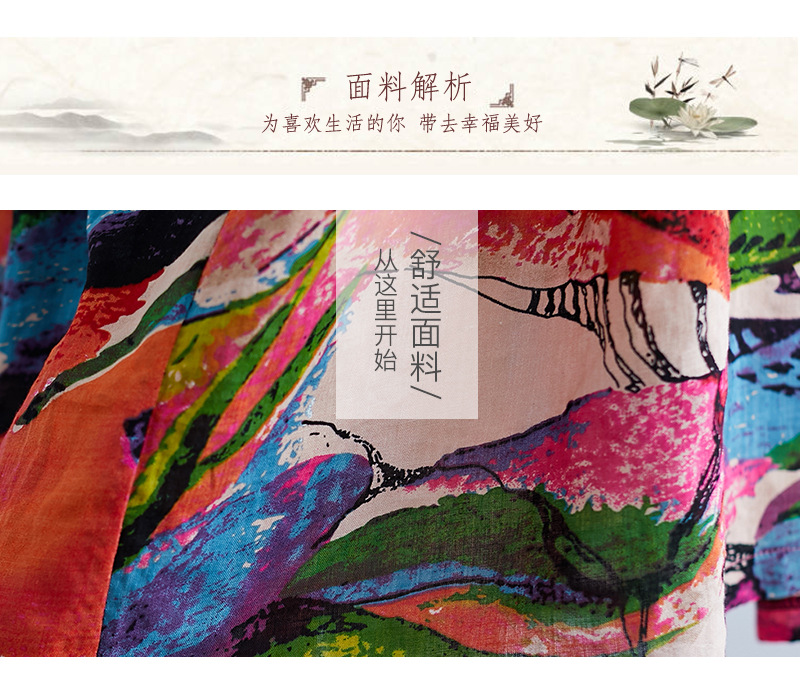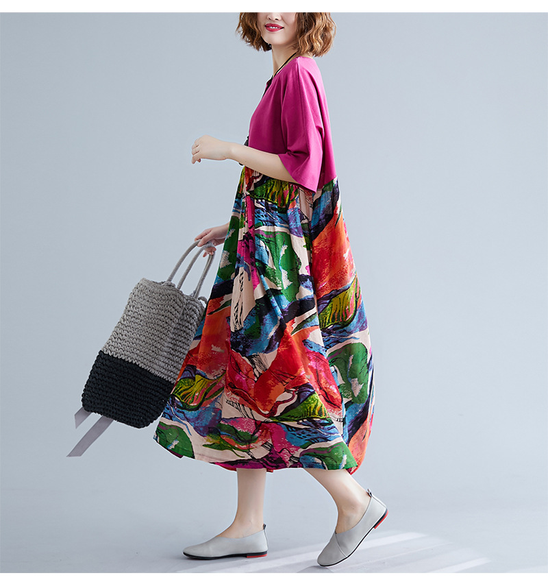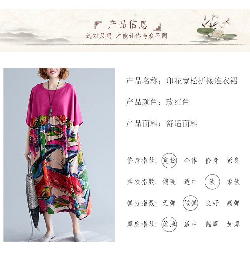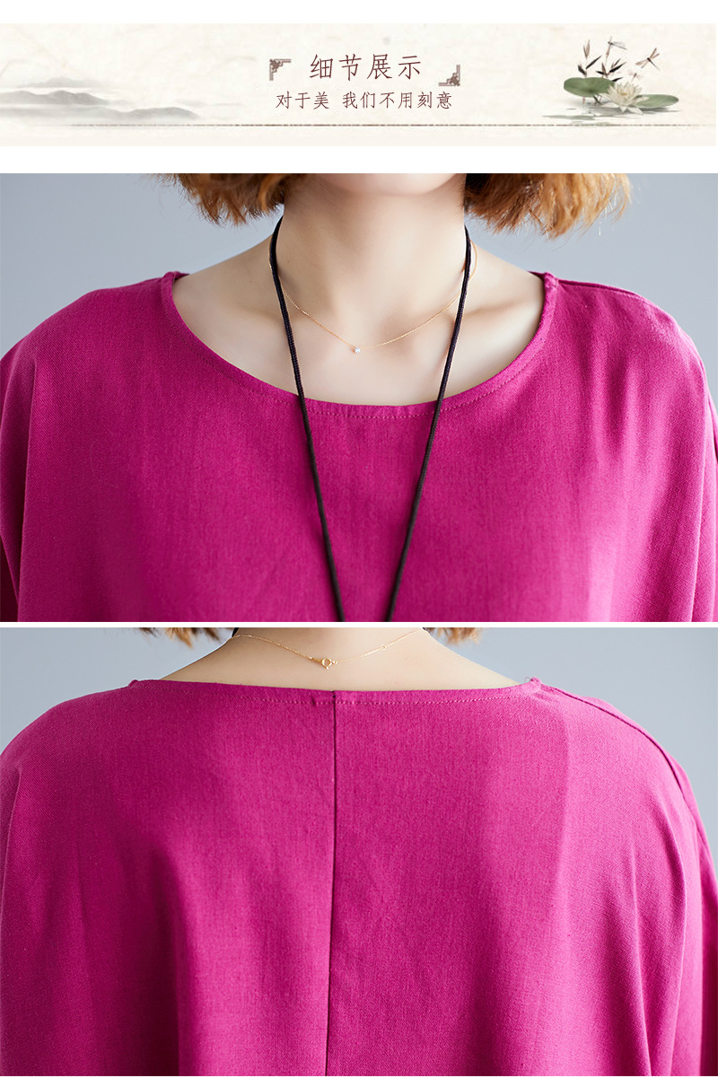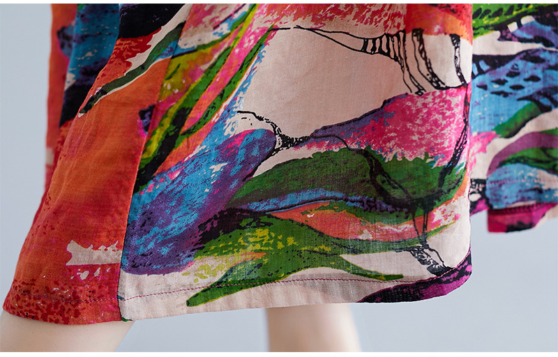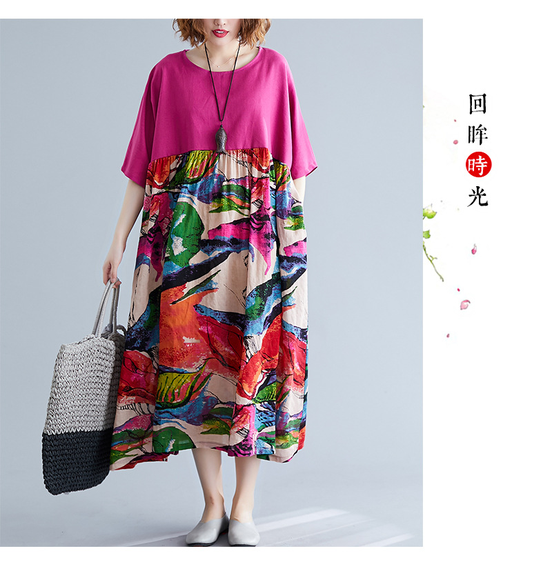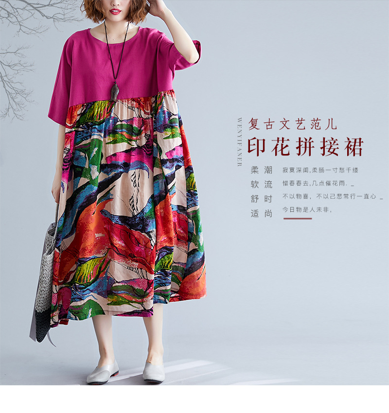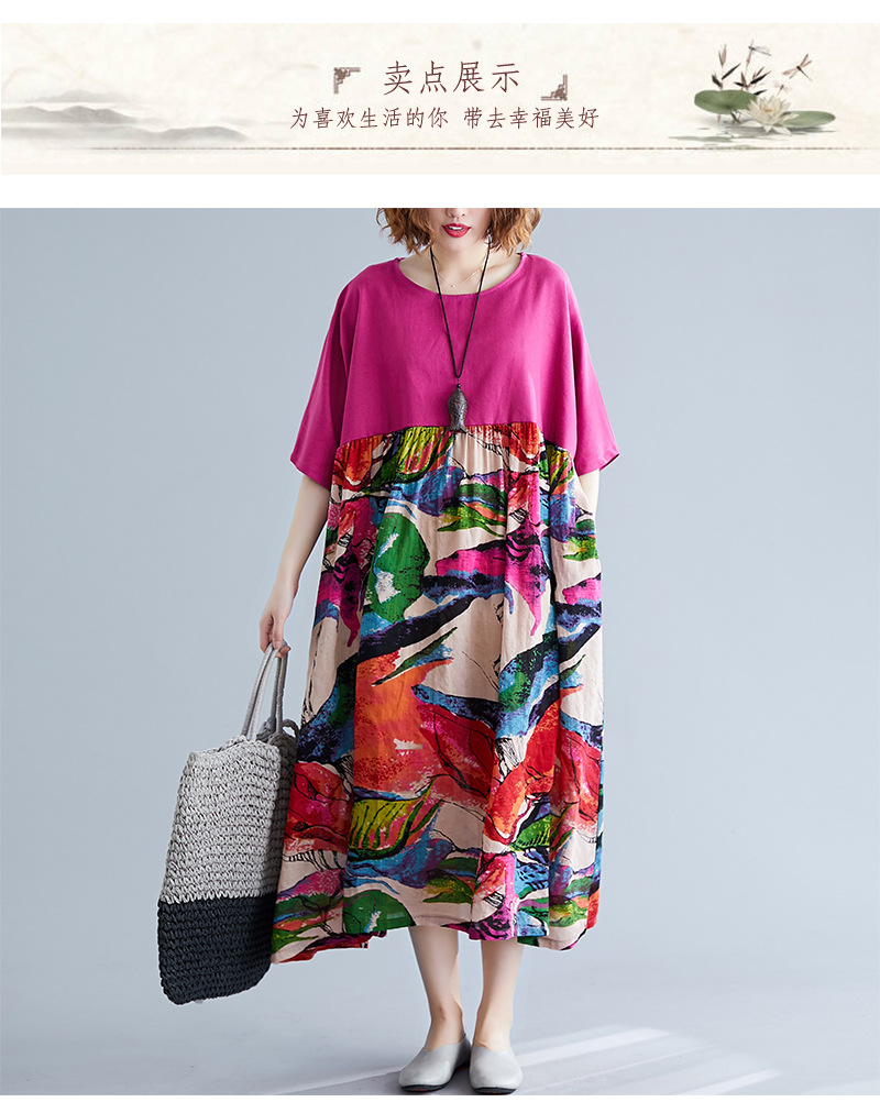 Real shot 2024 summer new literary large size loose cotton and linen printing crew neck short-sleeved dress women's clothing 0038 #