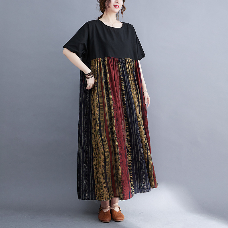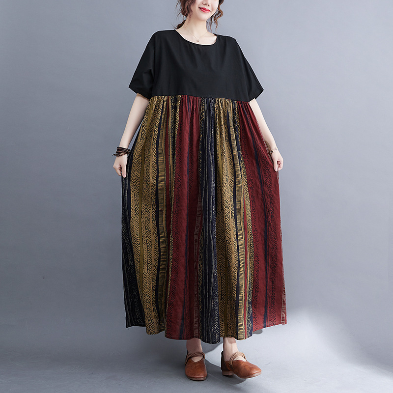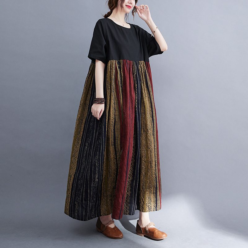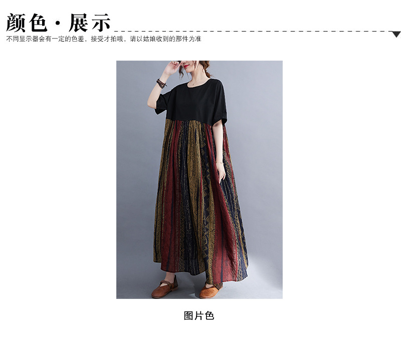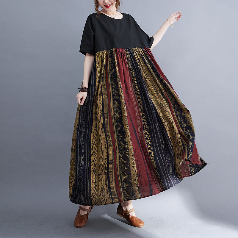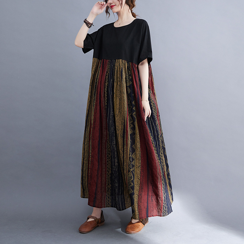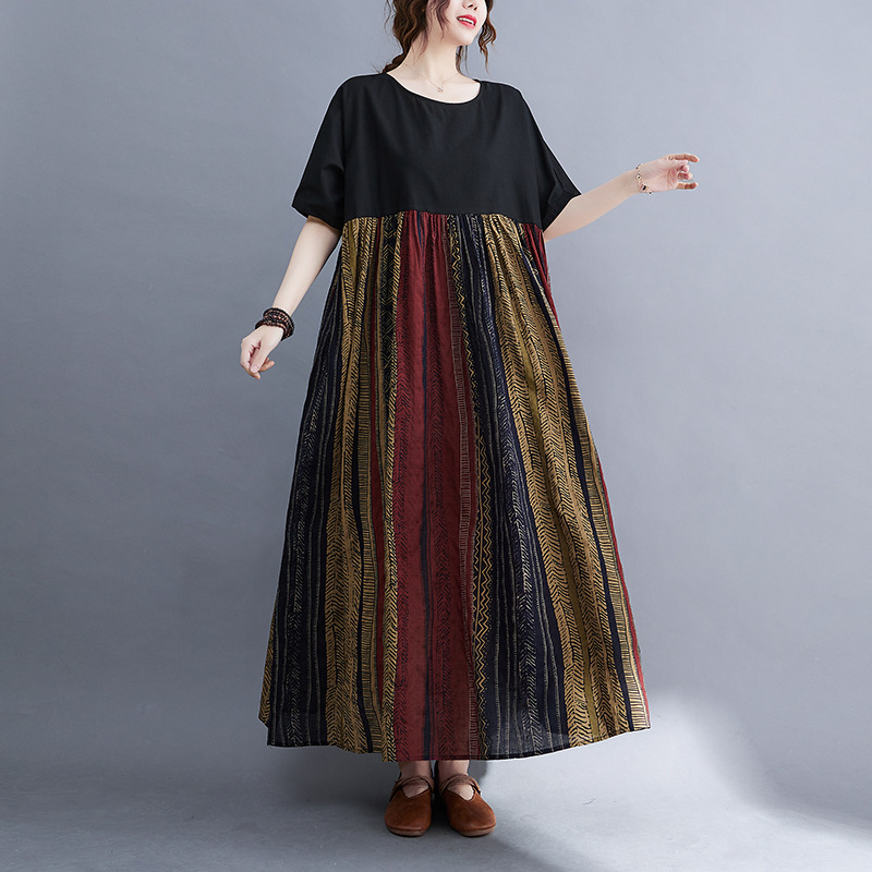 Real shot 2024 summer new literary large size loose cotton and linen printing short-sleeved dress women's long dress 9107 #