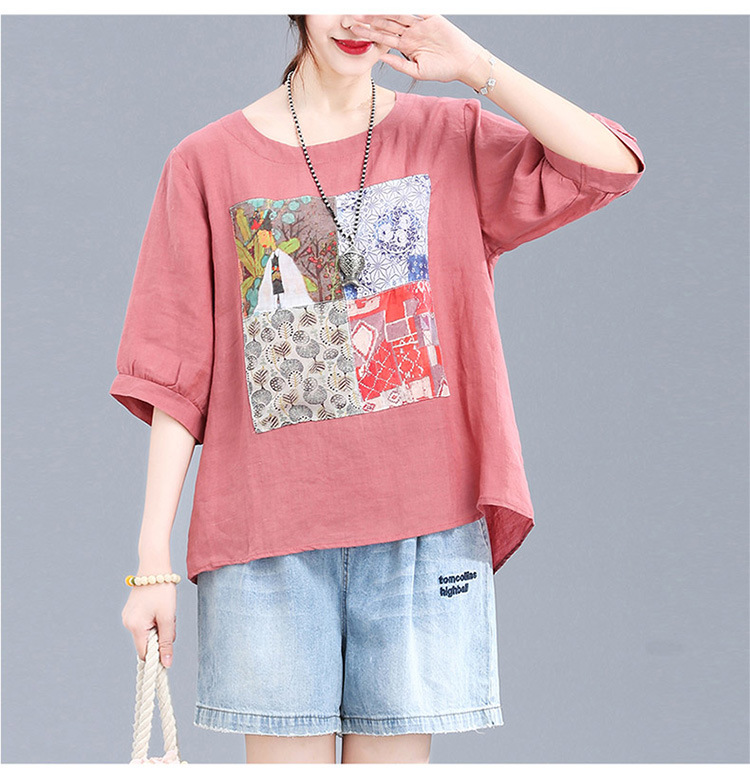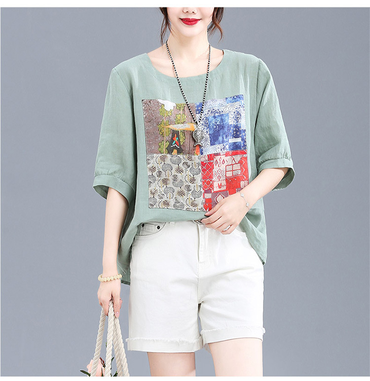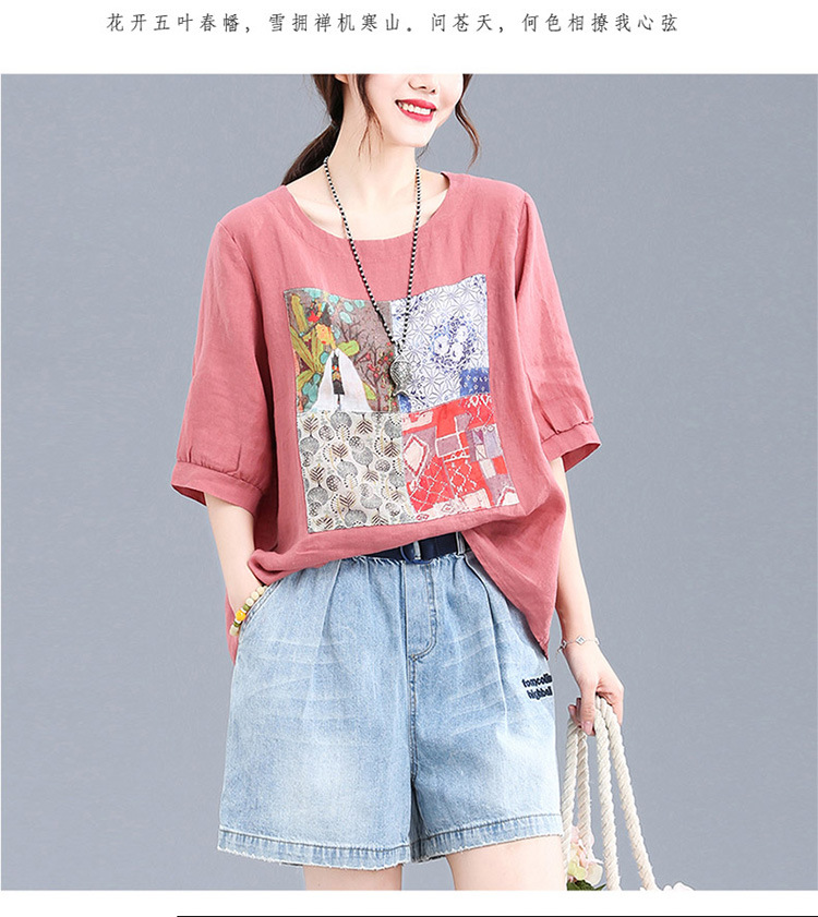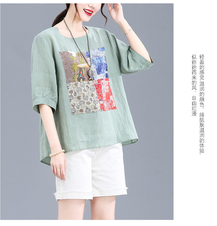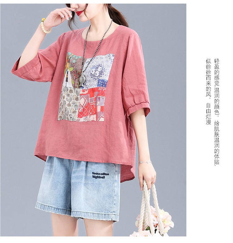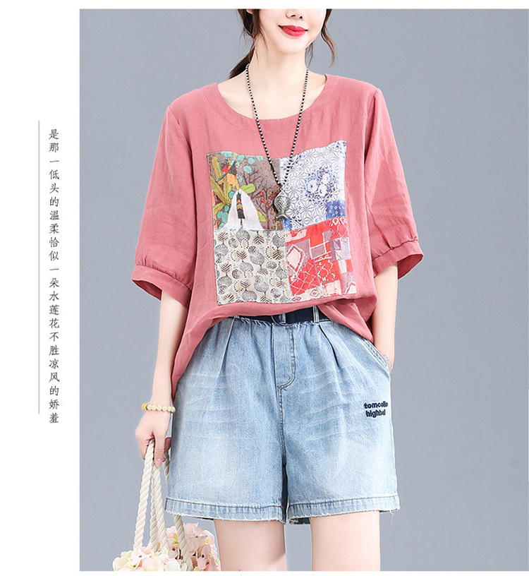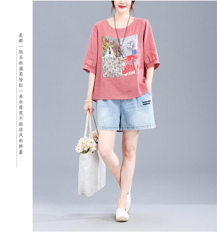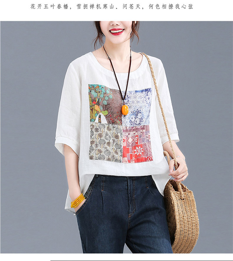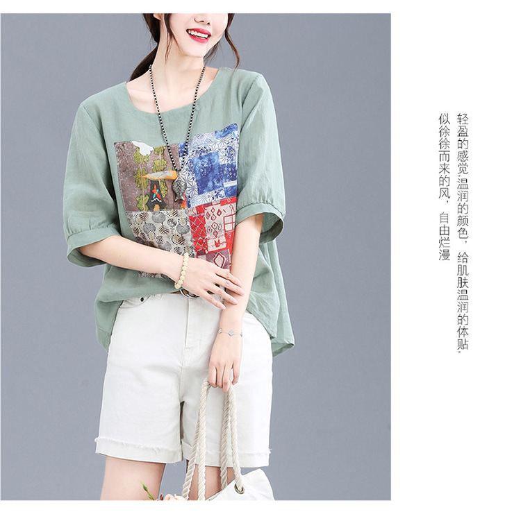 Real shot 2024 summer new literary loose collage cotton and linen printing crew neck short-sleeved top T-shirt women's clothing 9961 #