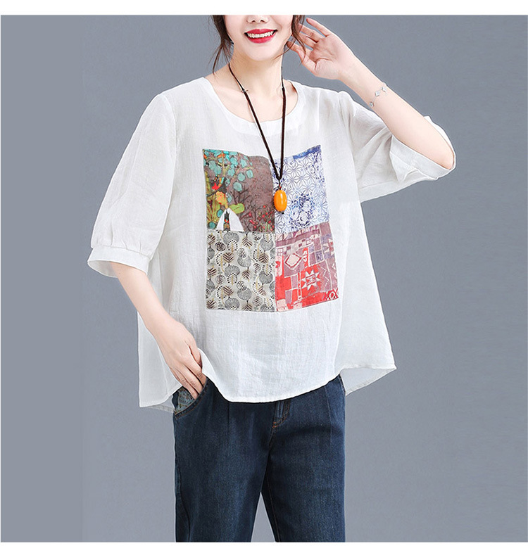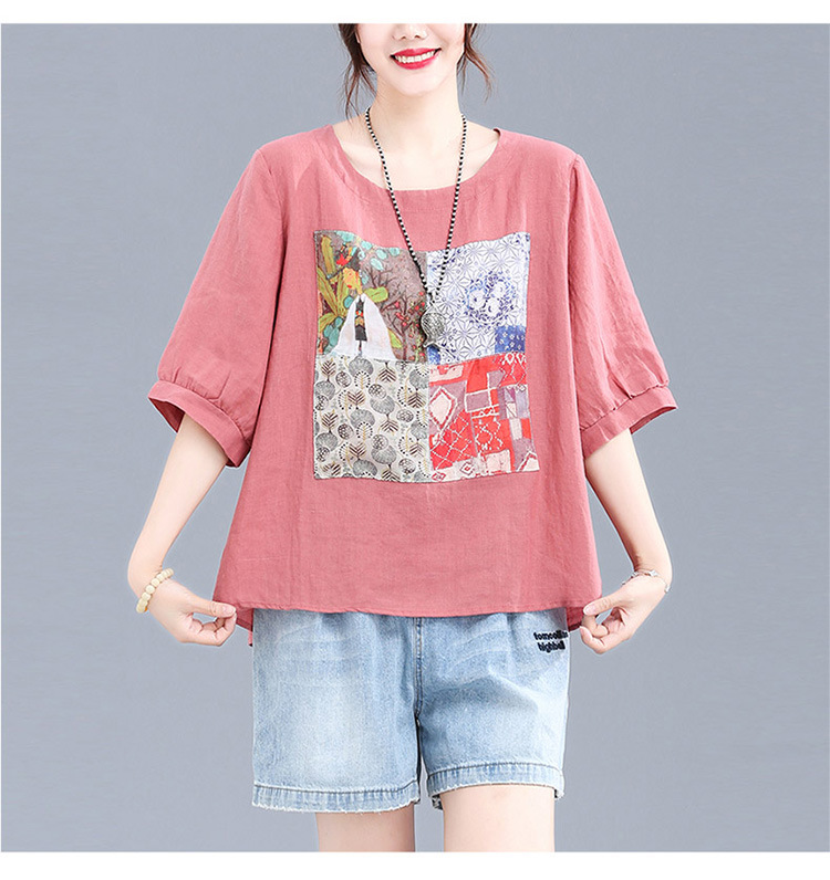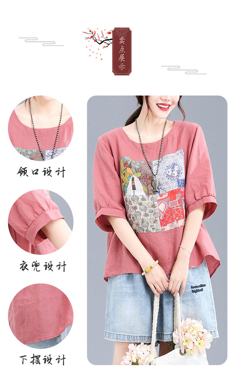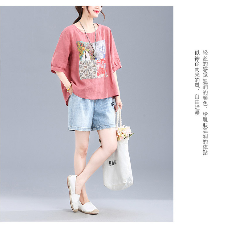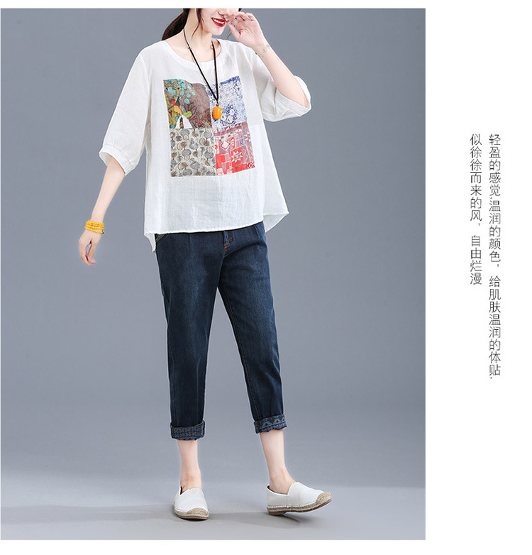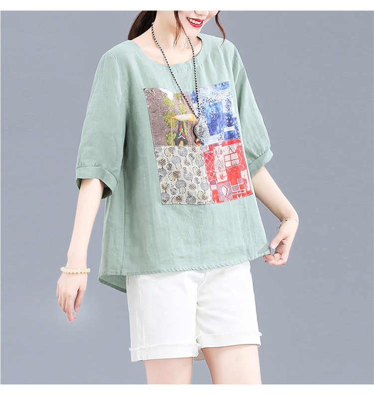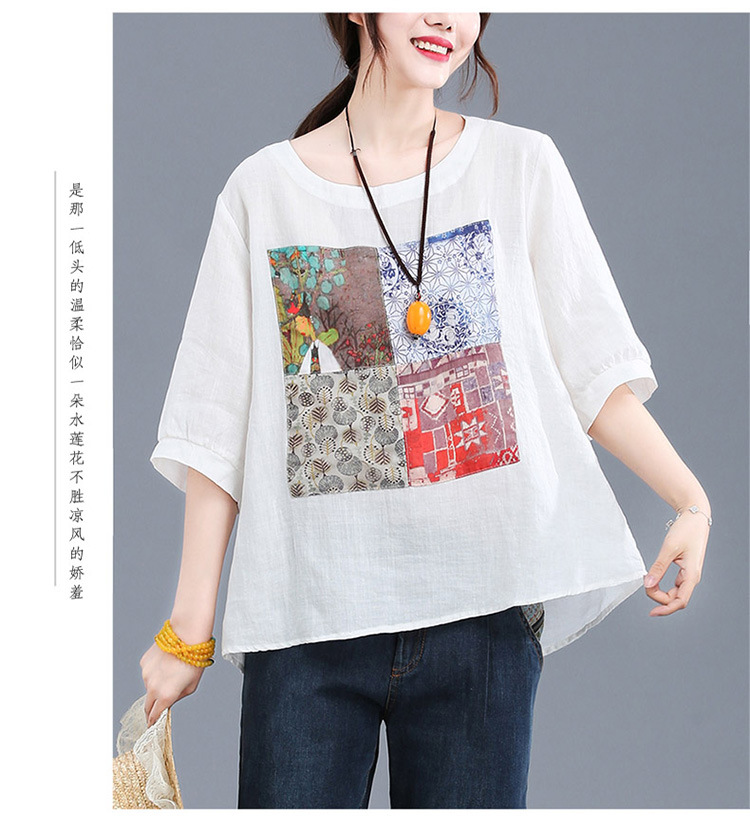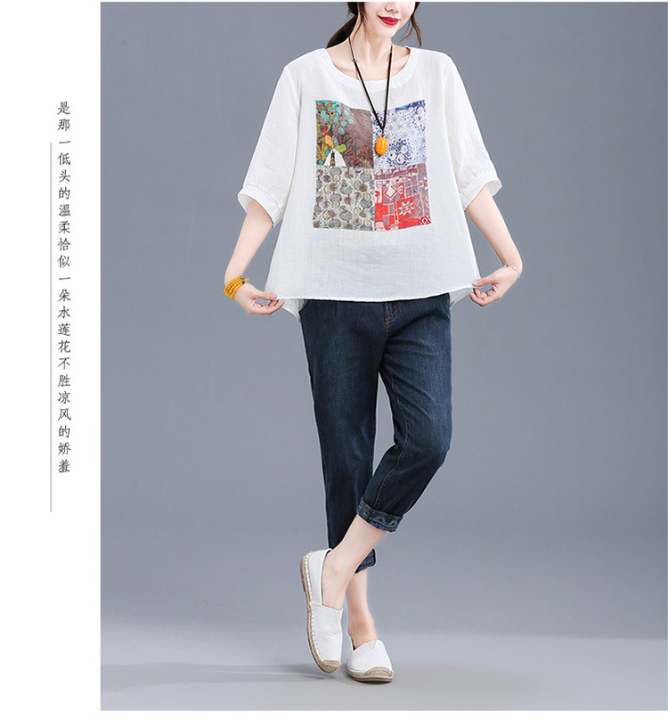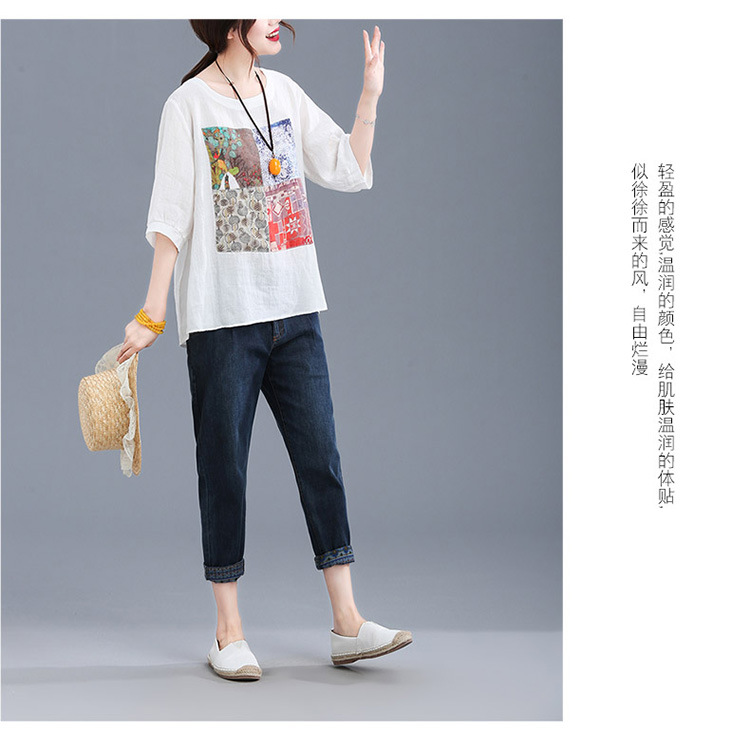 Real shot 2024 summer new literary loose collage cotton and linen printing crew neck short-sleeved top T-shirt women's clothing 9961 #