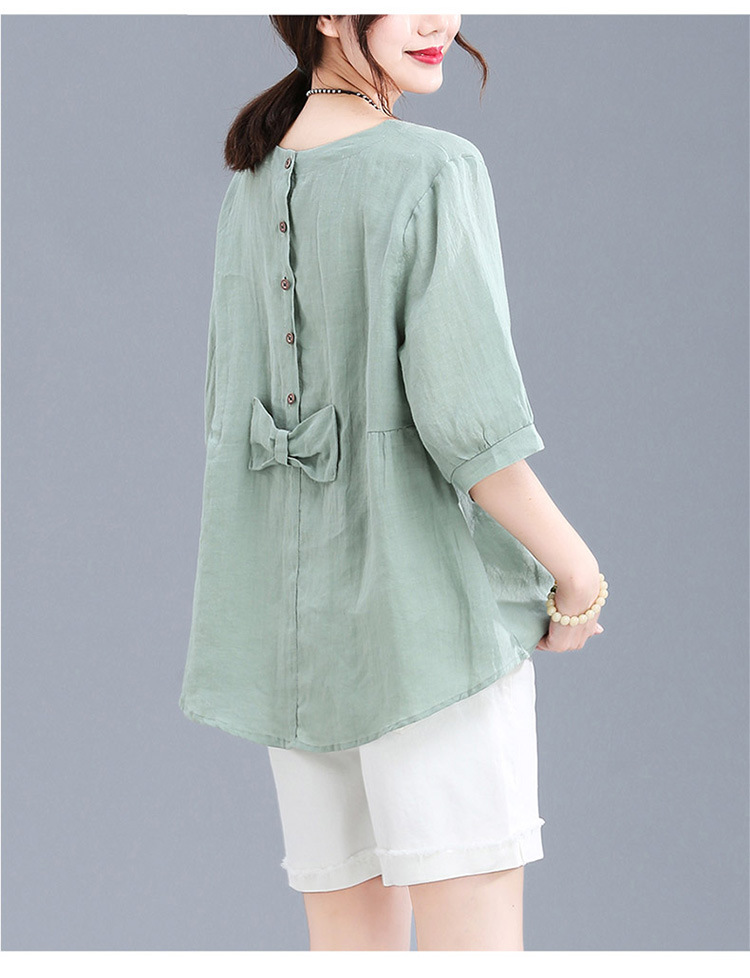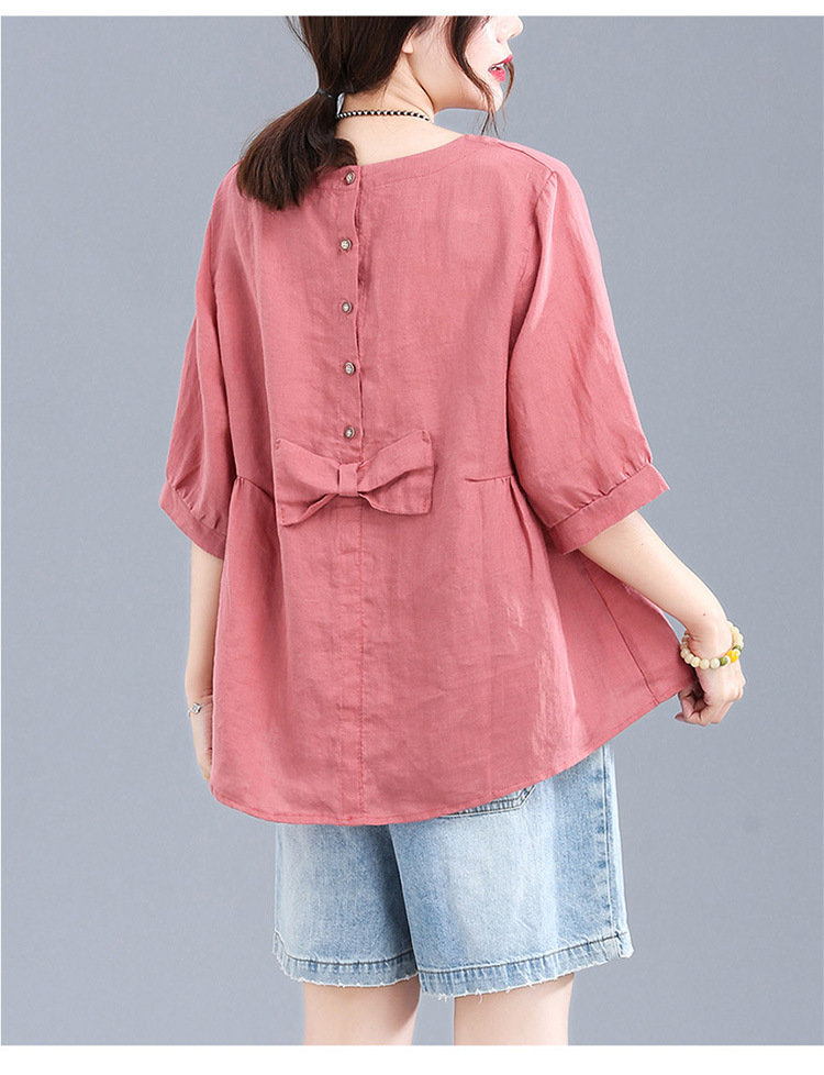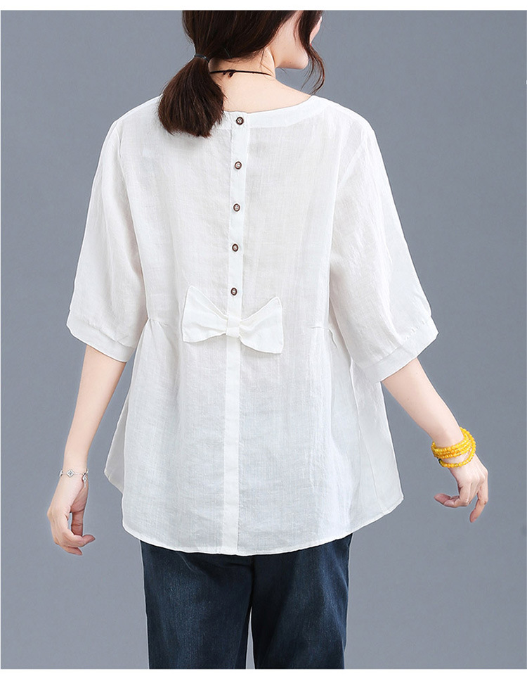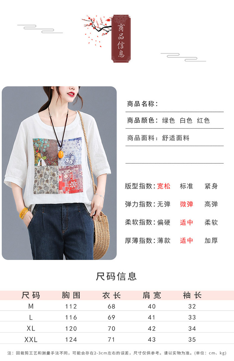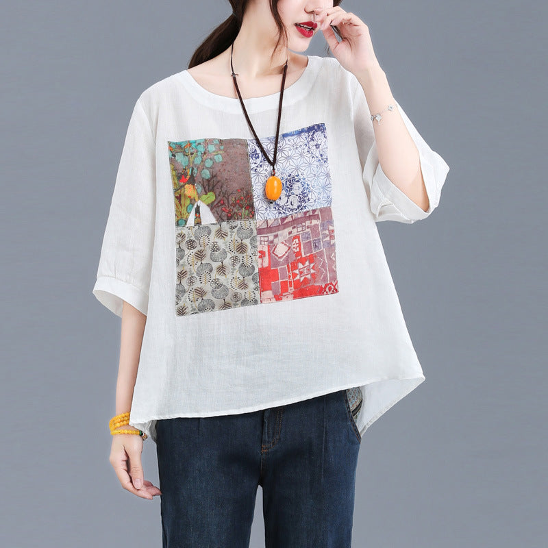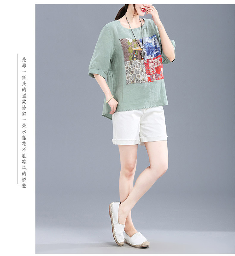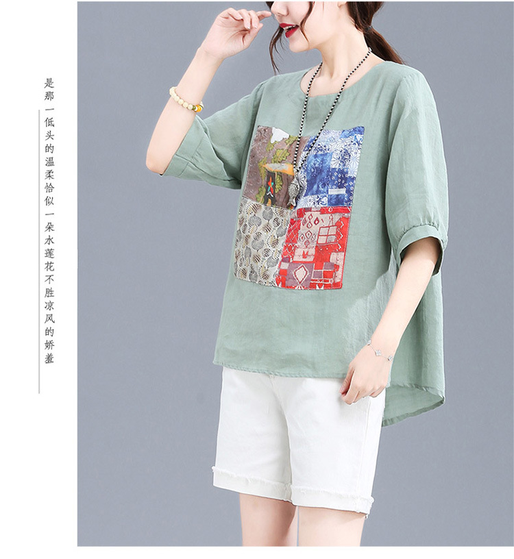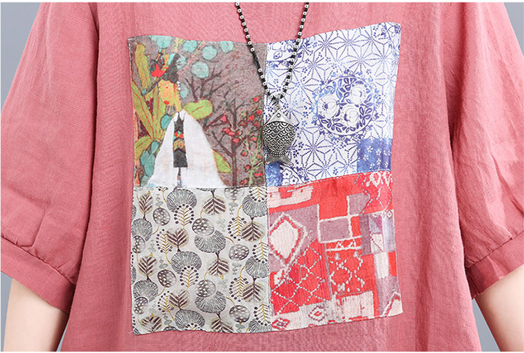 Real shot 2024 summer new literary loose collage cotton and linen printing crew neck short-sleeved top T-shirt women's clothing 9961 #