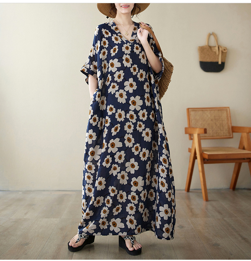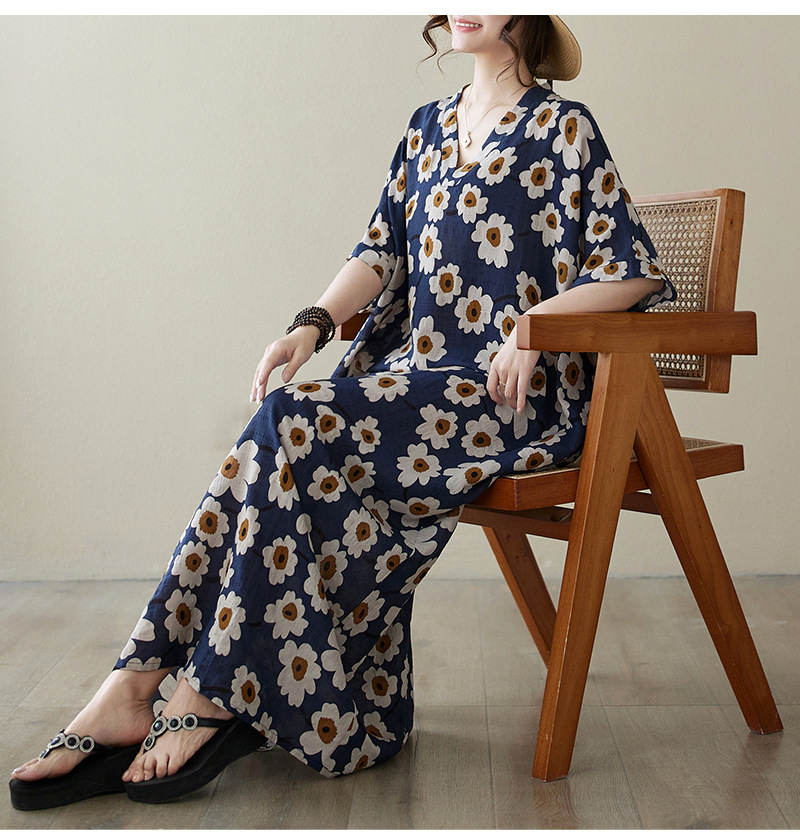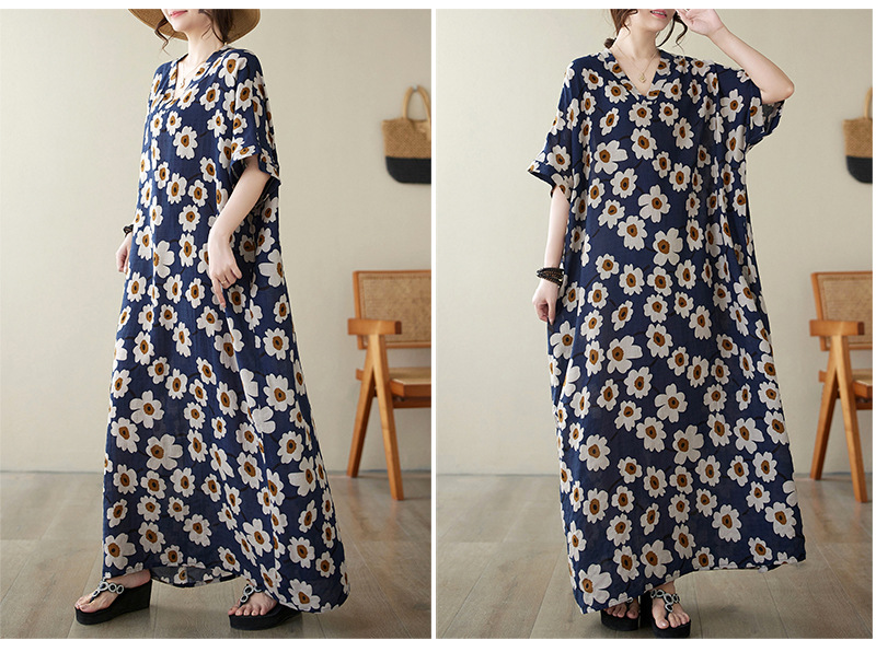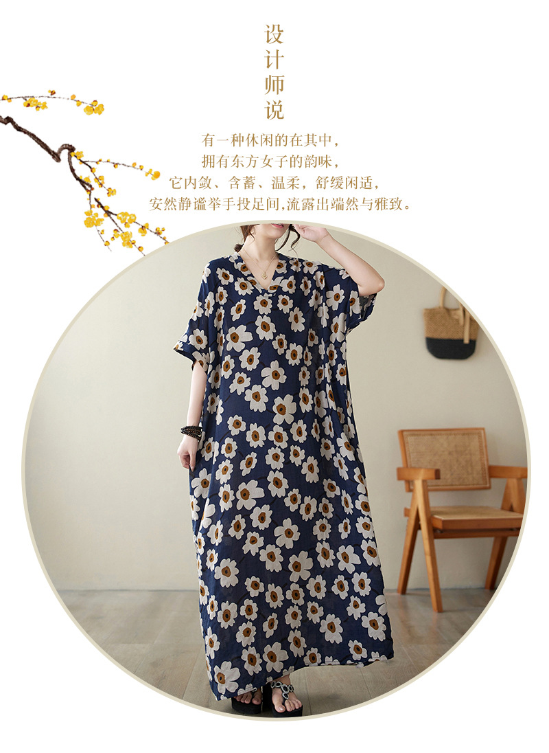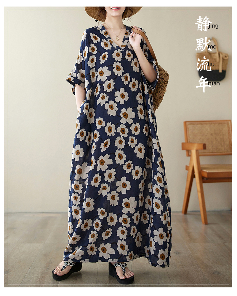 Real shot 2024 summer new V-neck cotton and linen large size loose literary holiday style medium and long beach dress women