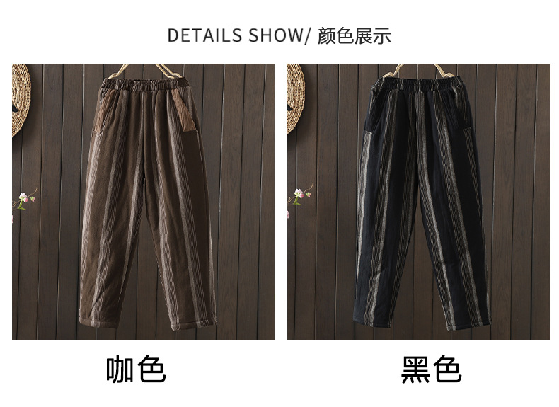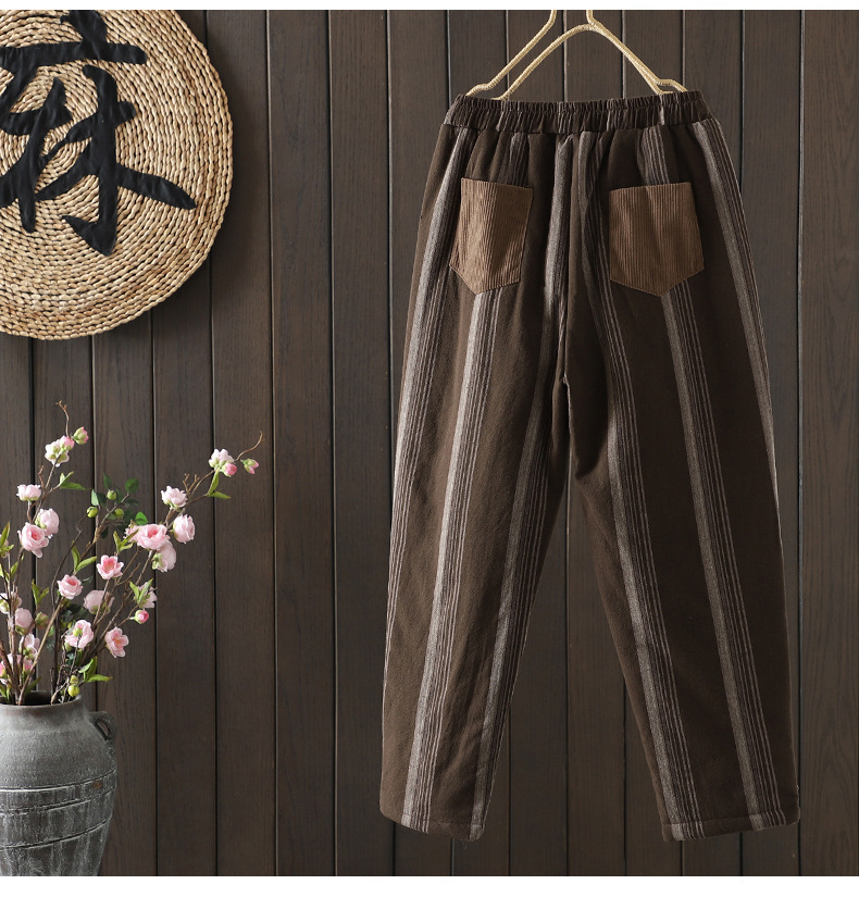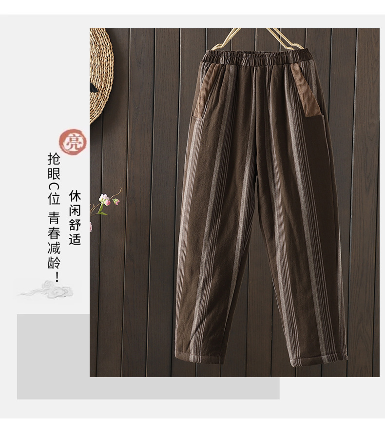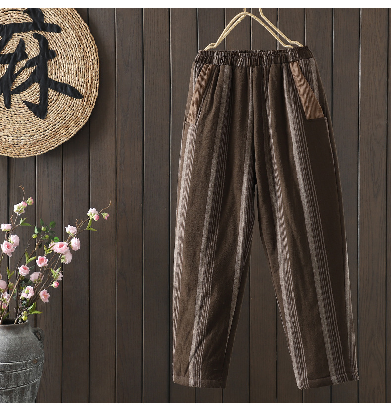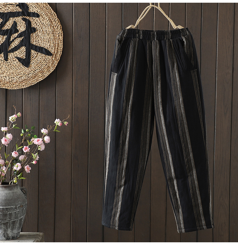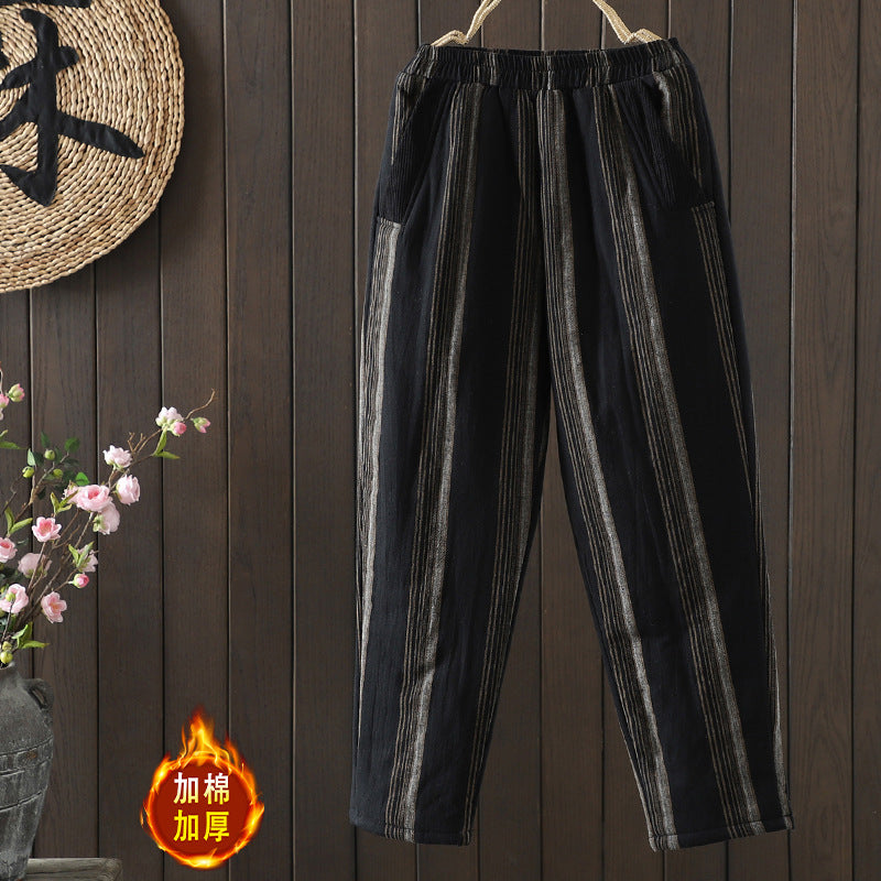 Real shot 2025 autumn and winter new literary loose vertical stripe casual padded cotton warm Harlan pants cotton pants outer wear