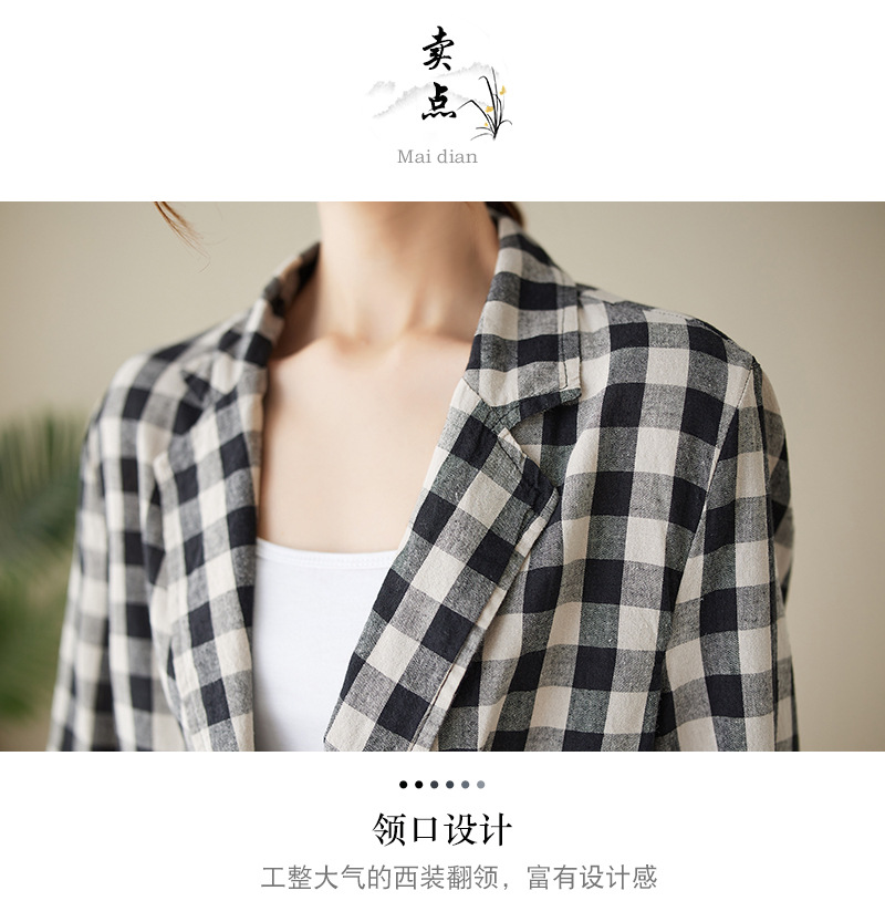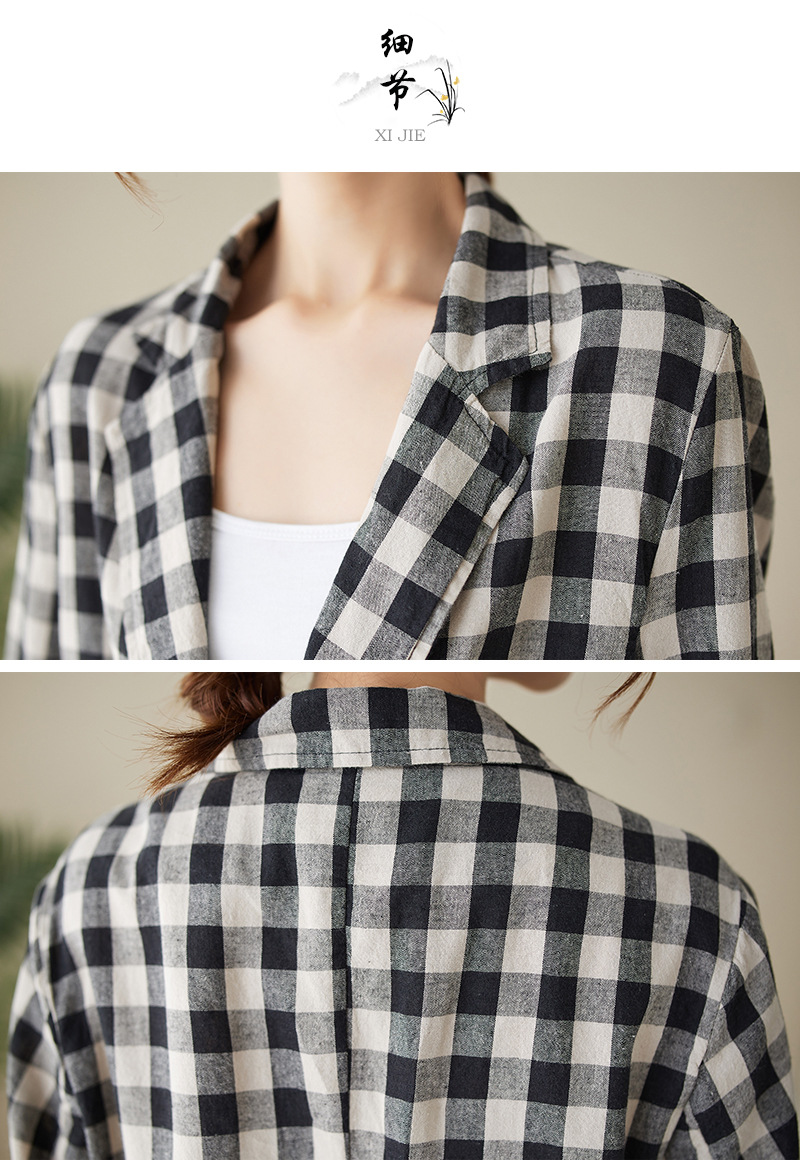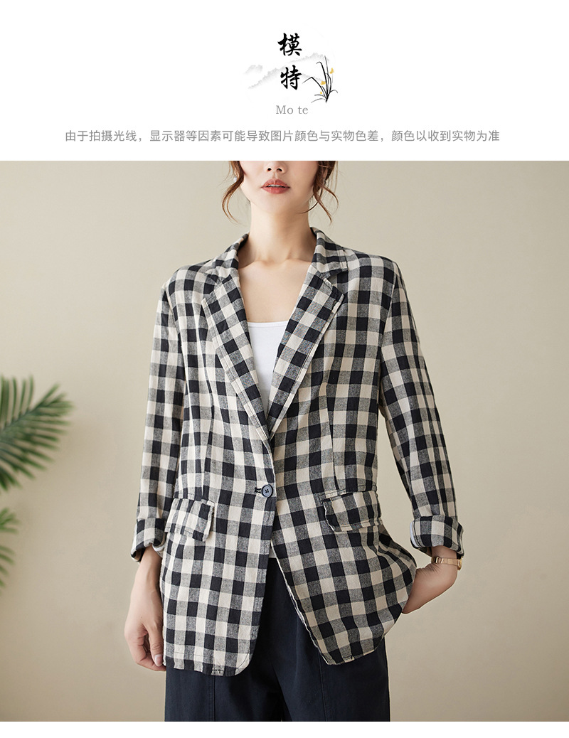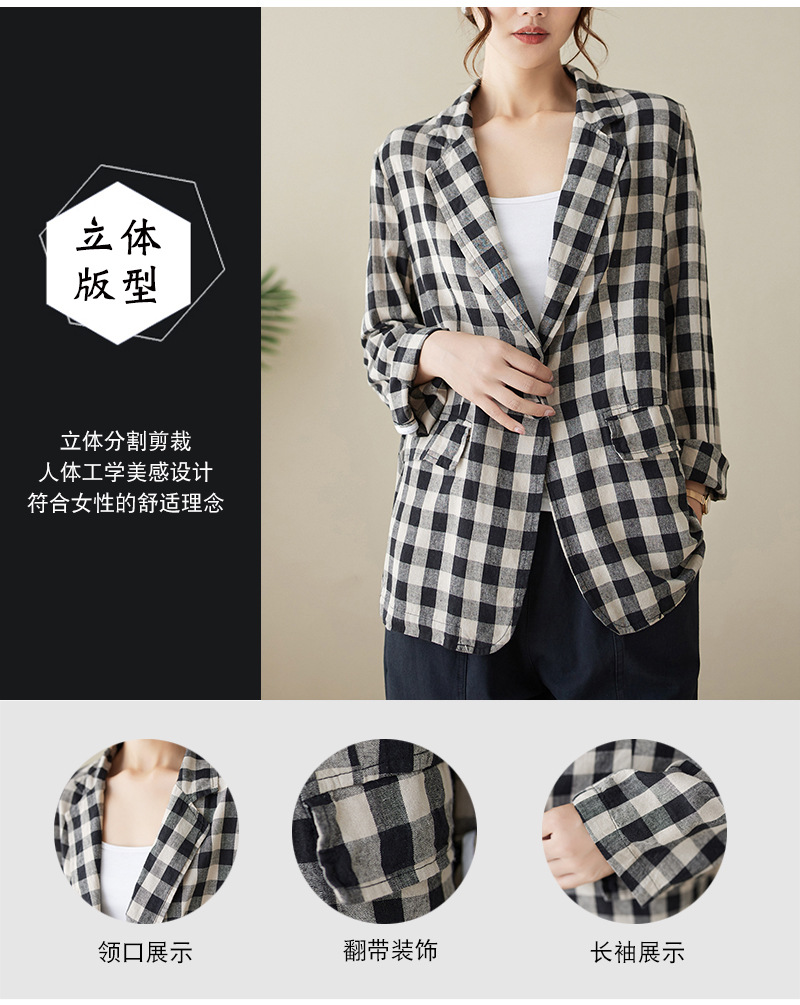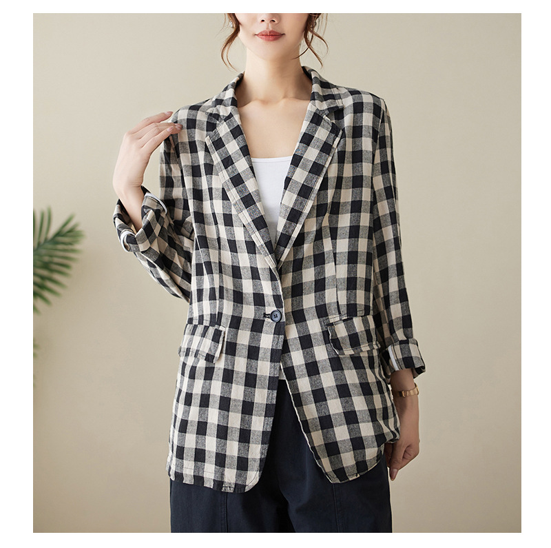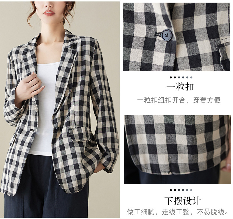Real shot 2025 autumn literary and retro cotton and linen plaid jacket women's thin casual suit short top