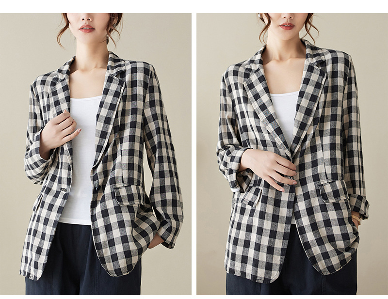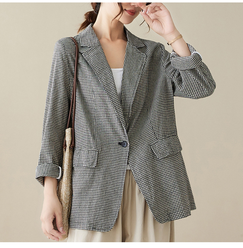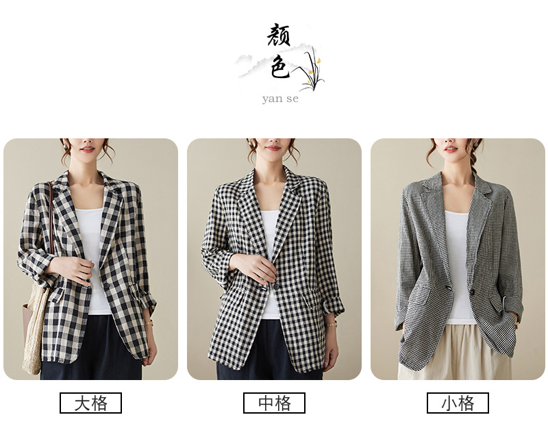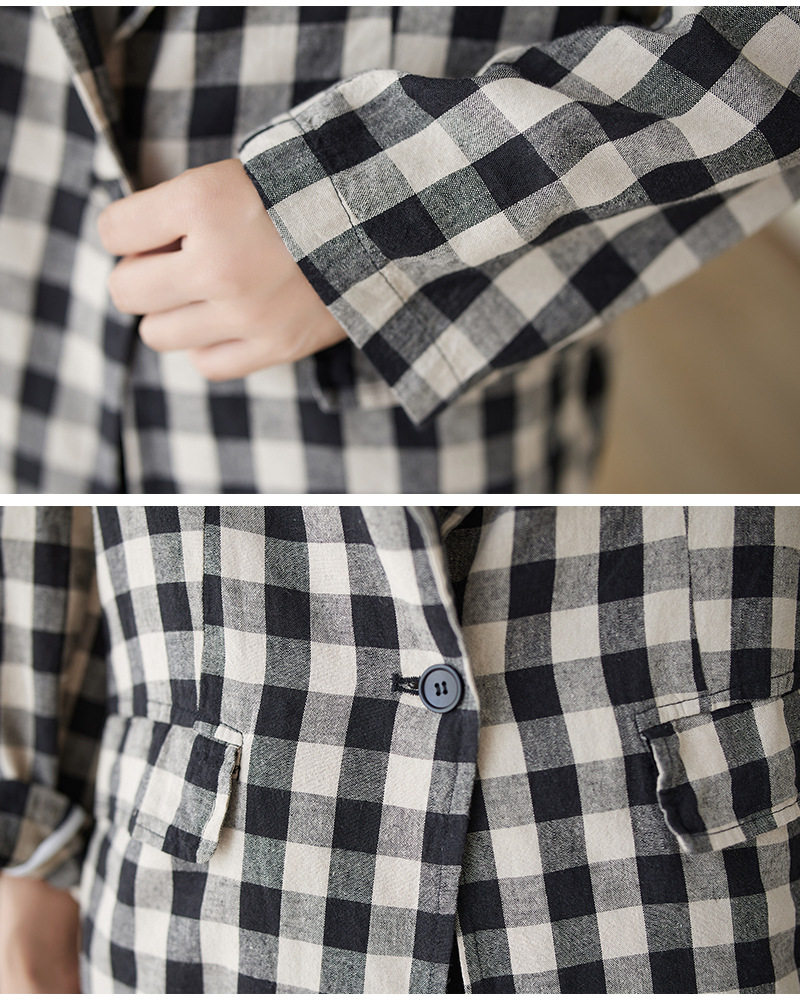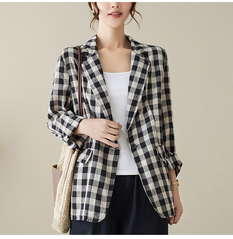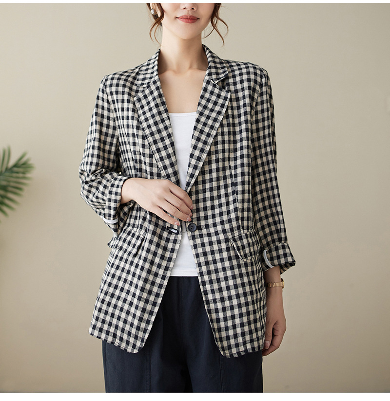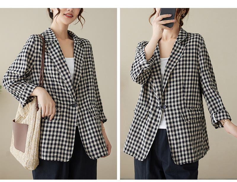 Real shot 2025 autumn literary and retro cotton and linen plaid jacket women's thin casual suit short top