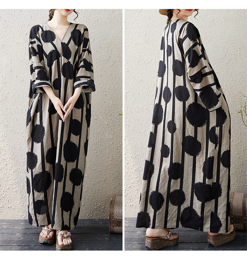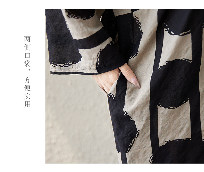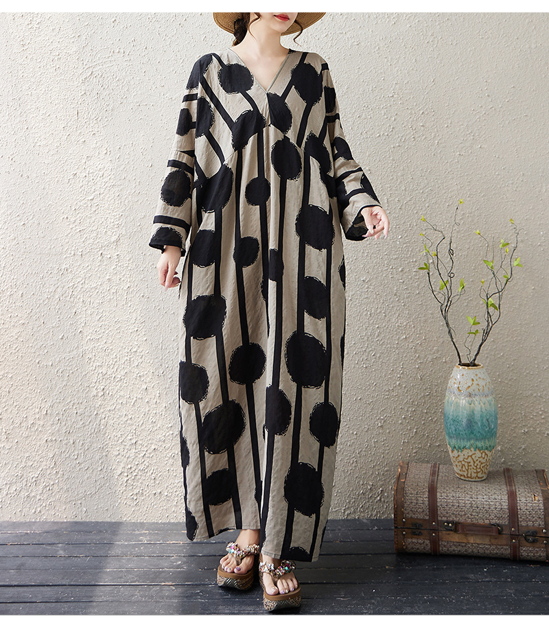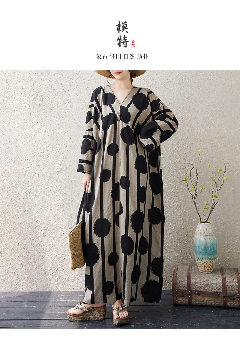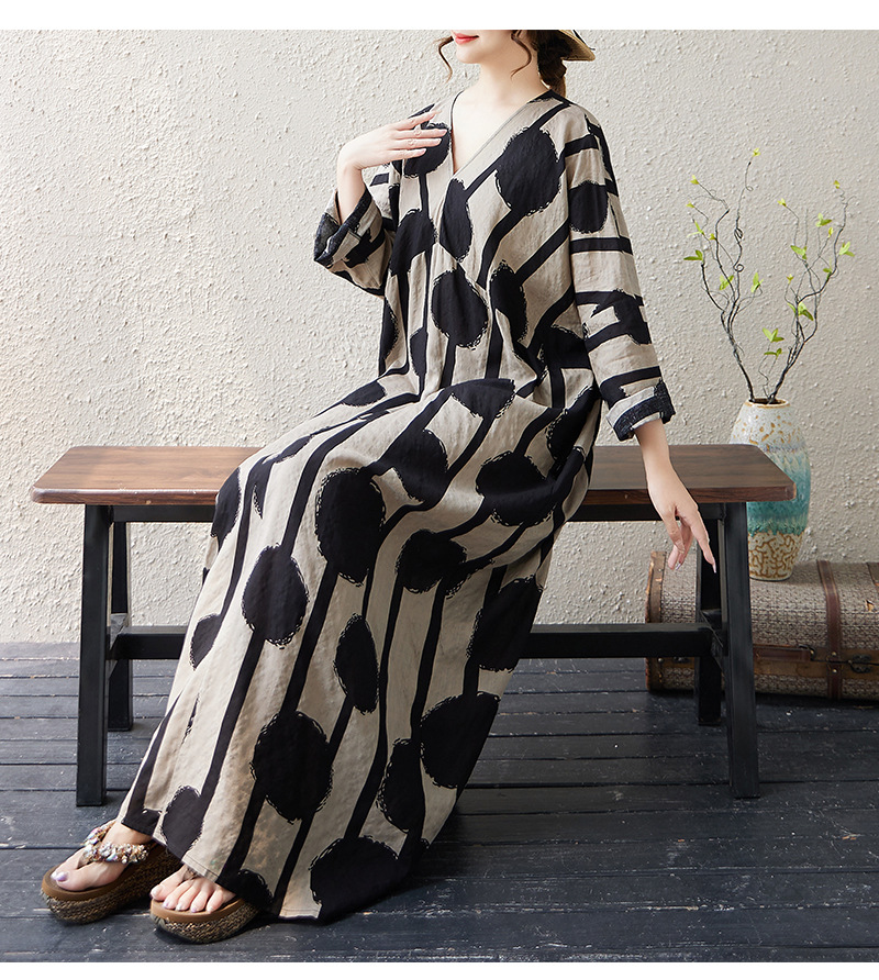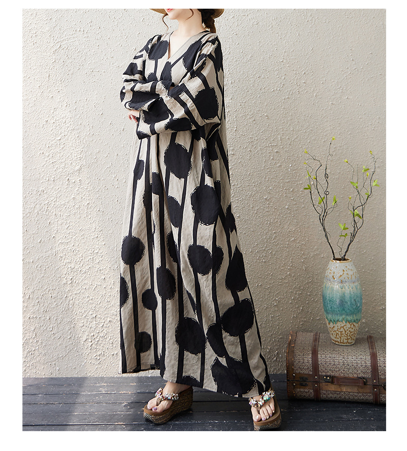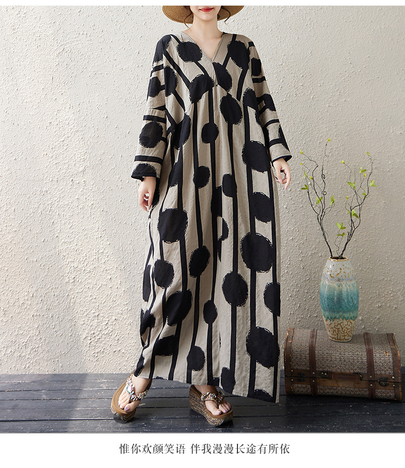Real shot 2025 autumn new large size long-sleeved sunscreen v-neck thin cotton and linen printing loose and thin dress women