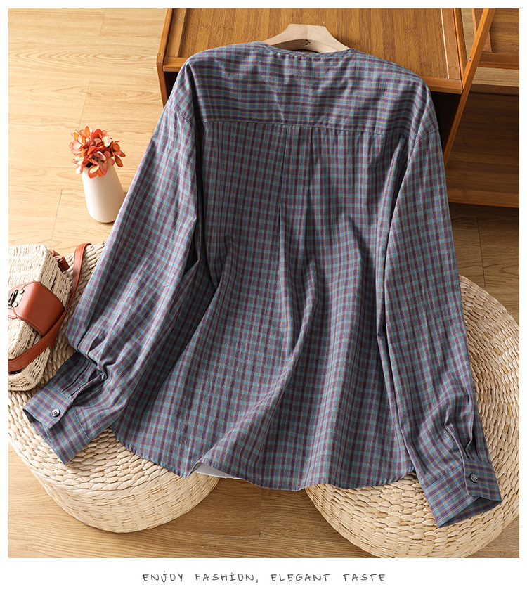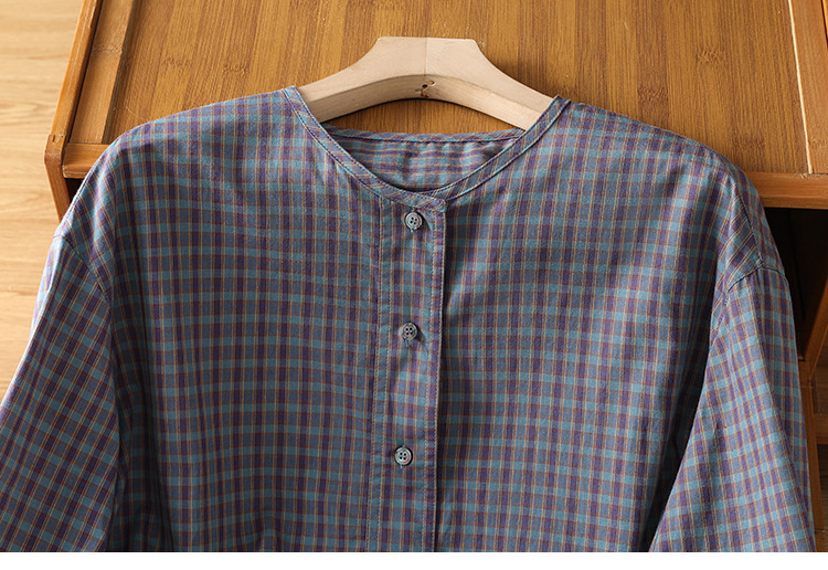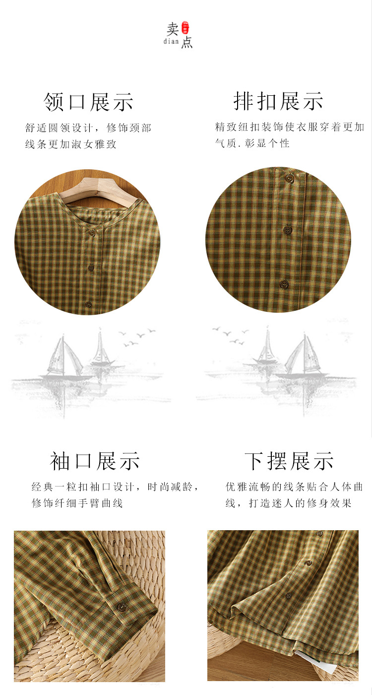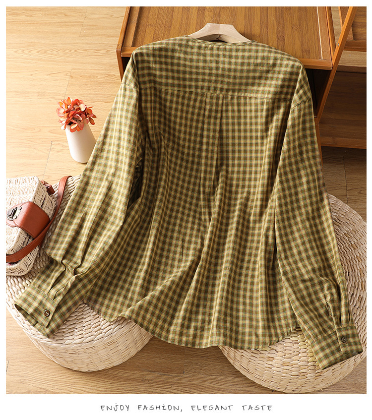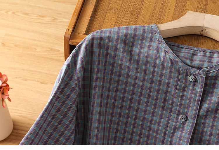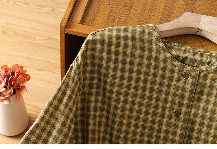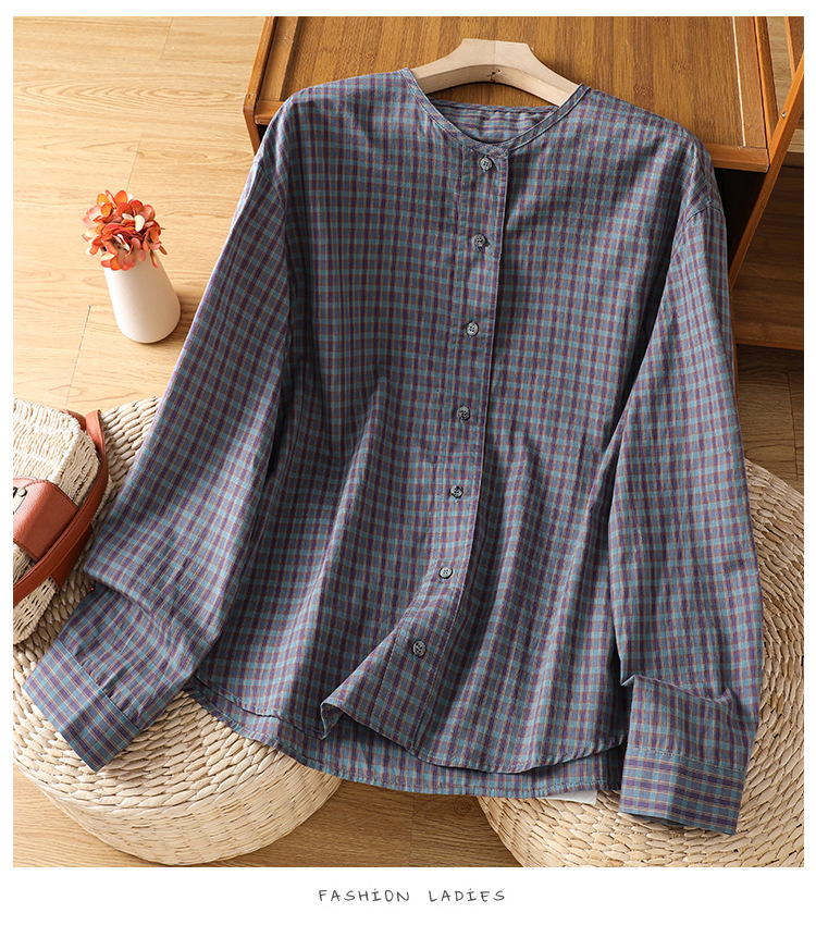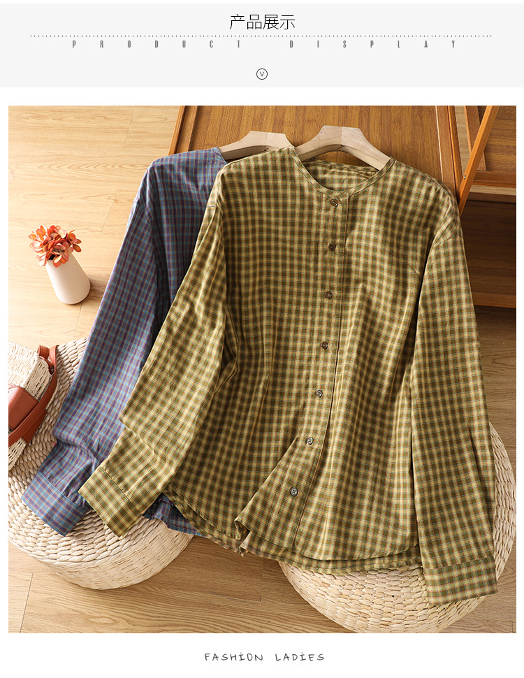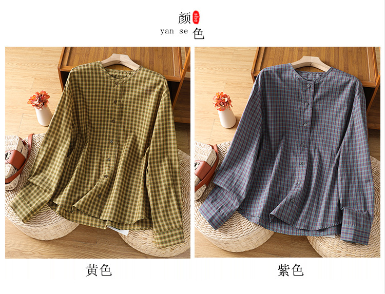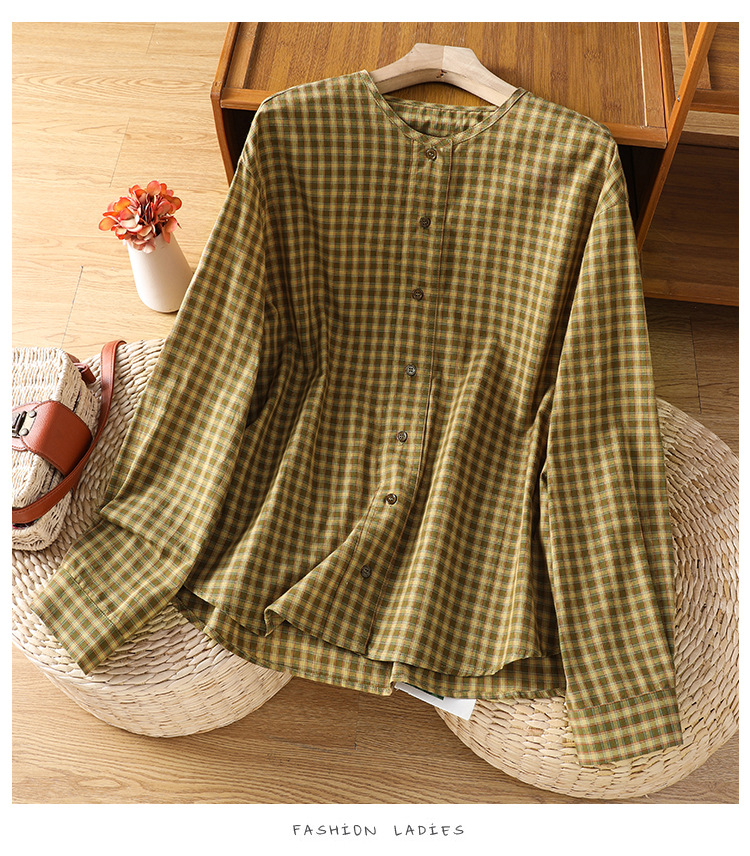Real shot 2025 autumn new literary plaid long-sleeved cotton and linen plaid round neck shirt jacket women's shirt