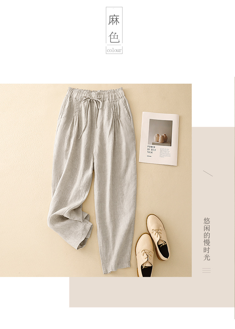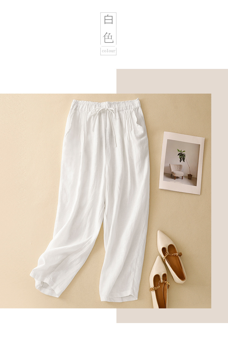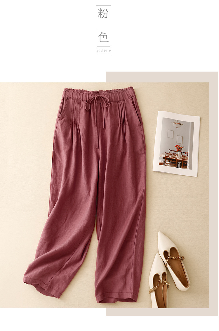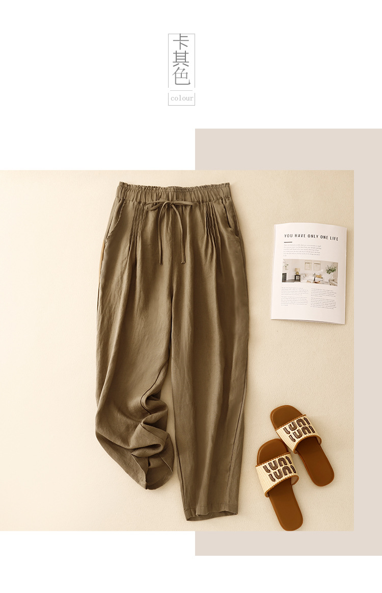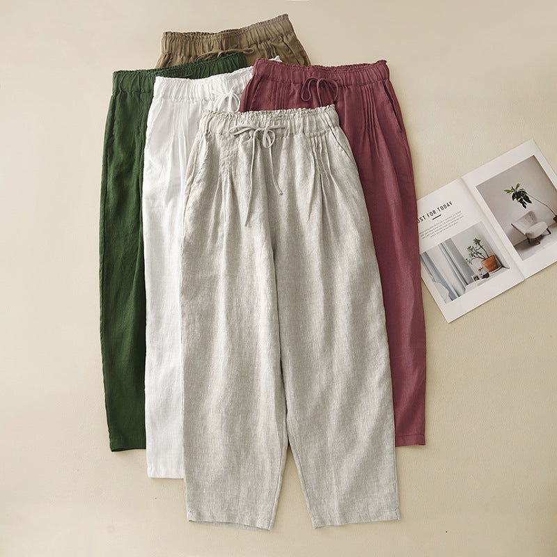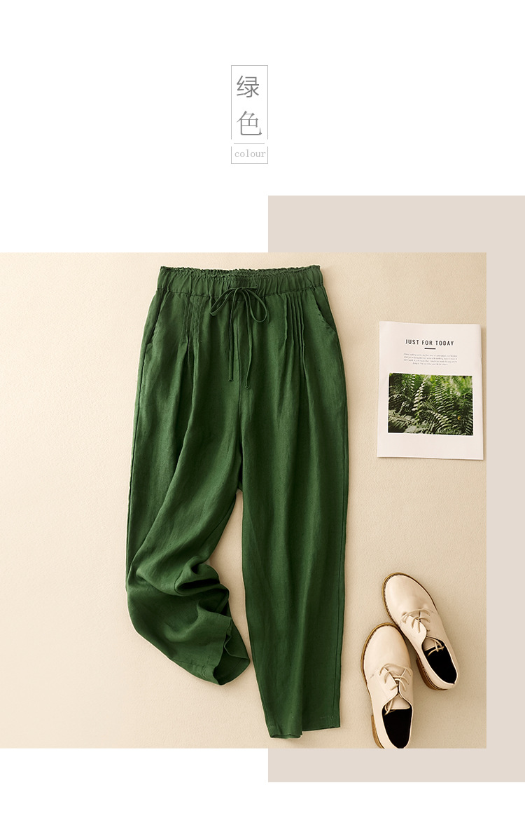 Real shot 2025 spring new casual loose solid color cotton and linen elastic waist Harlan pants women's nine-point pants #9037