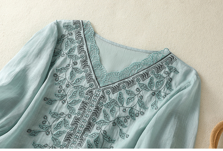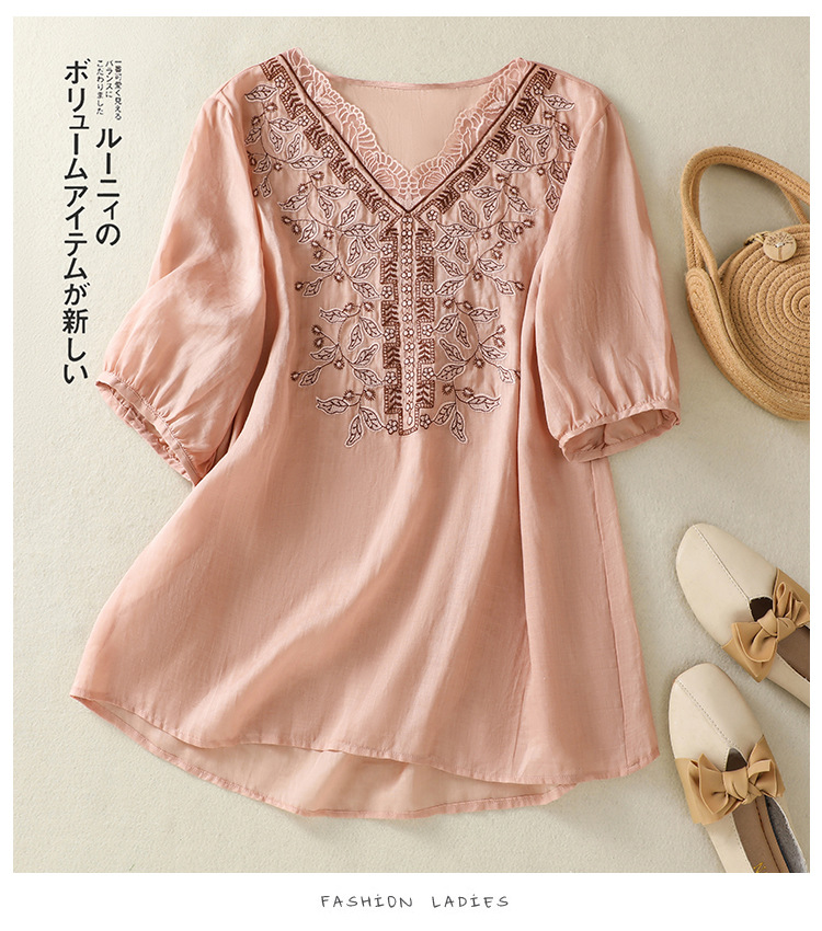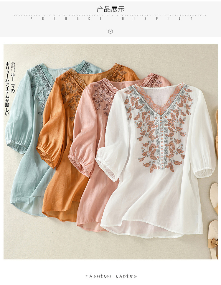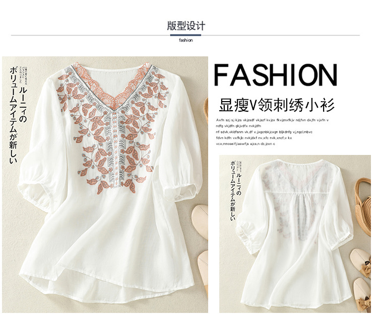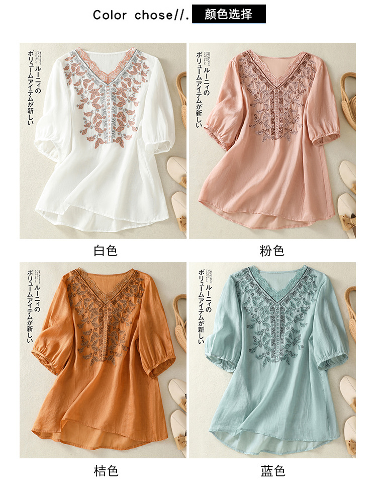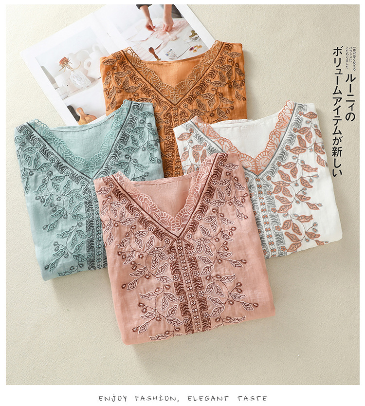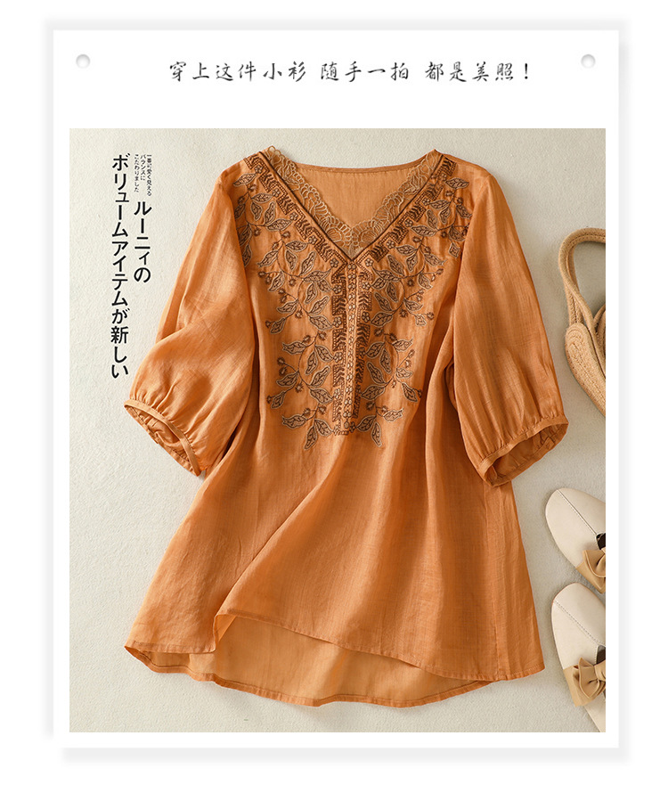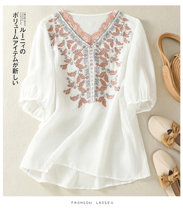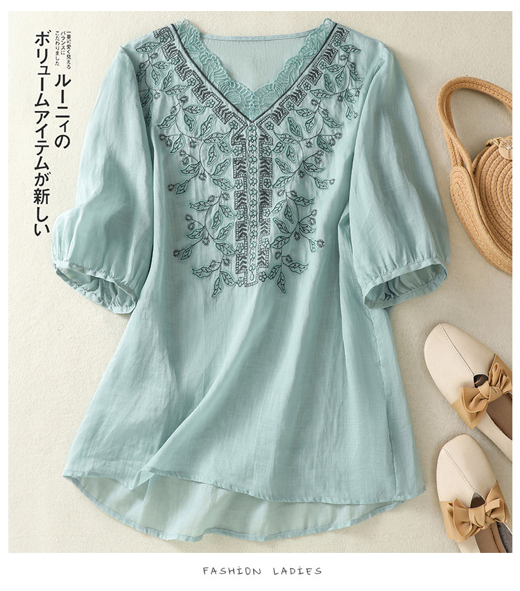 Real shot 2025 summer new cotton and linen literary and retro embroidery V-neck lace splicing five-quarter sleeve shirt top