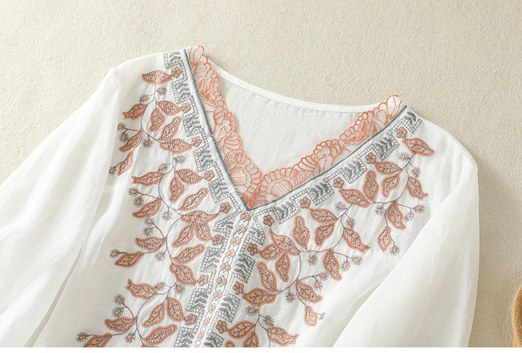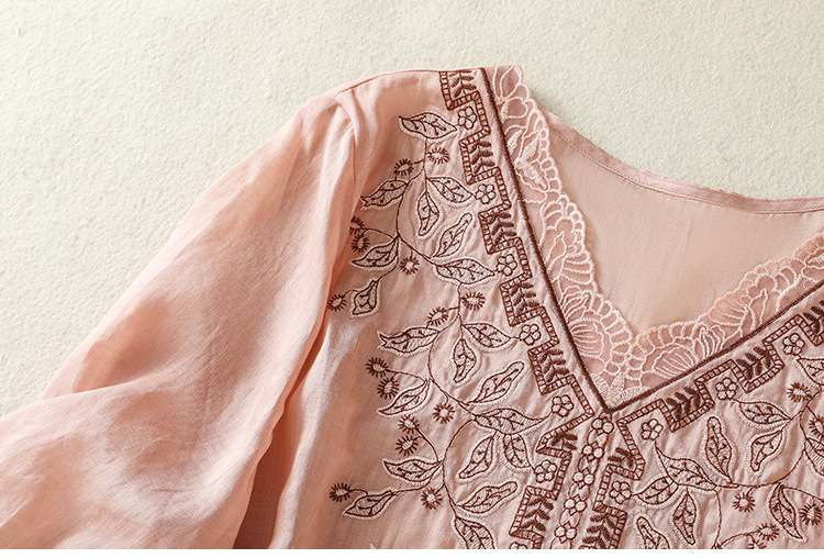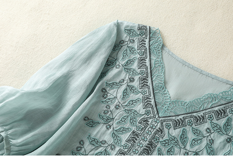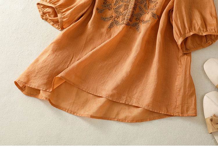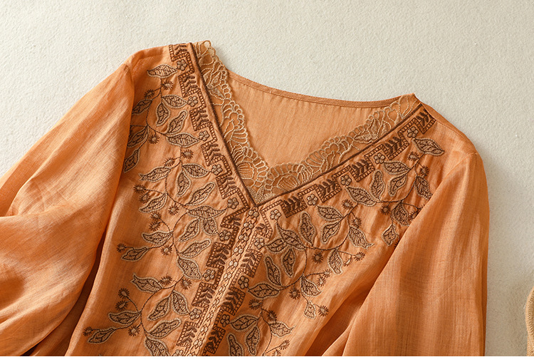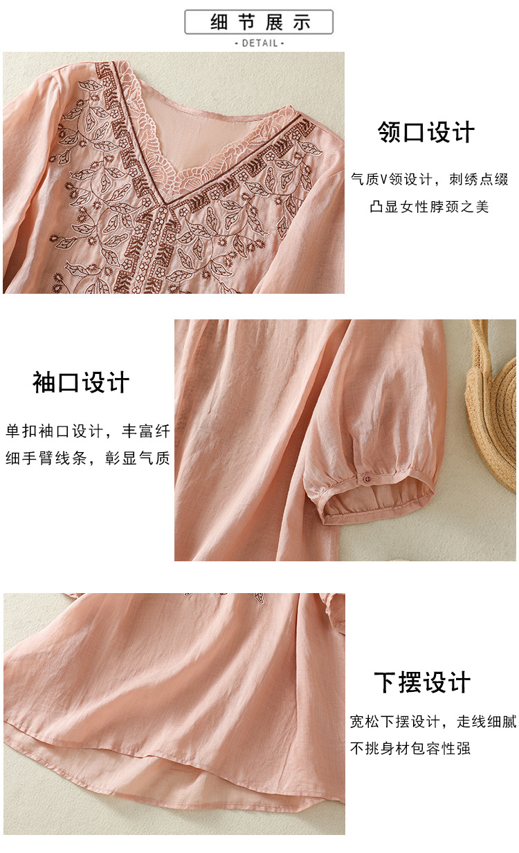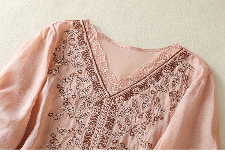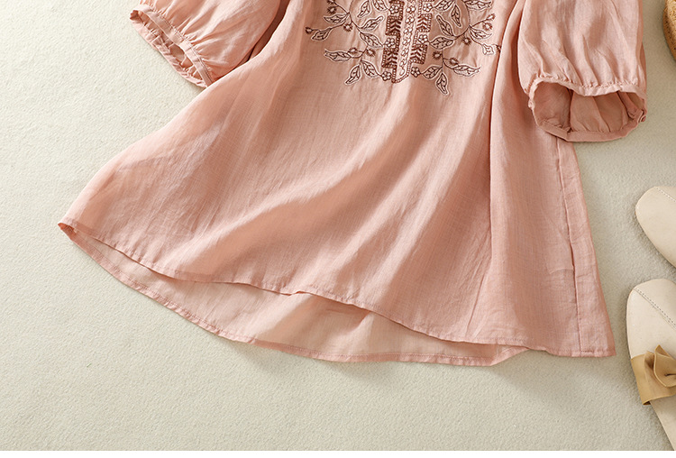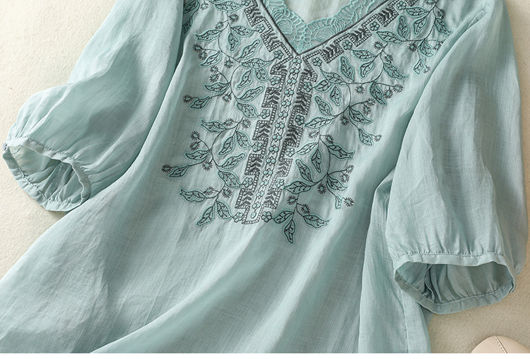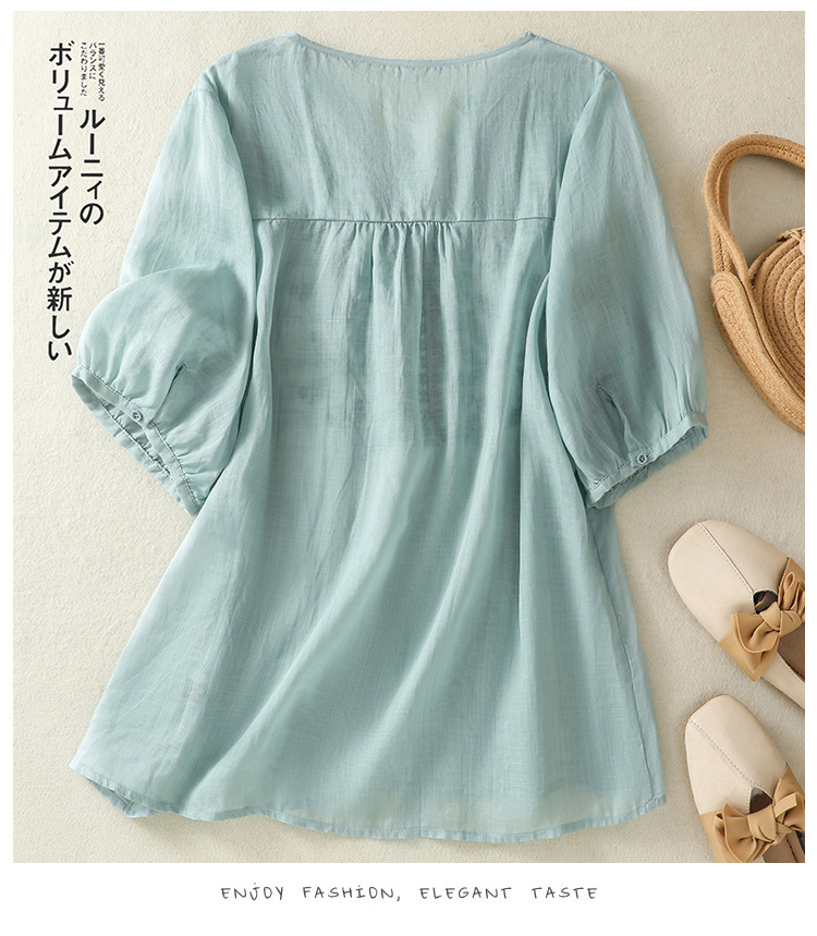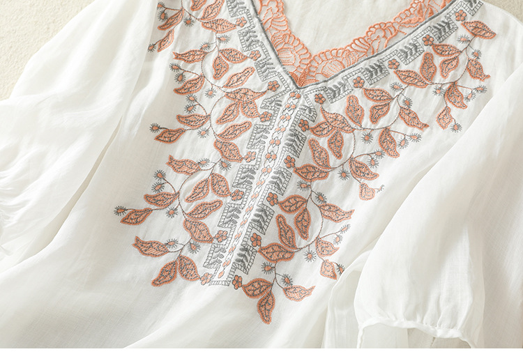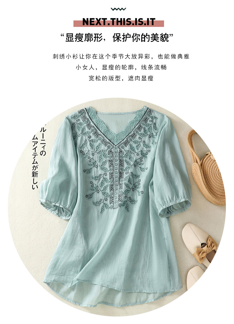 Real shot 2025 summer new cotton and linen literary and retro embroidery V-neck lace splicing five-quarter sleeve shirt top