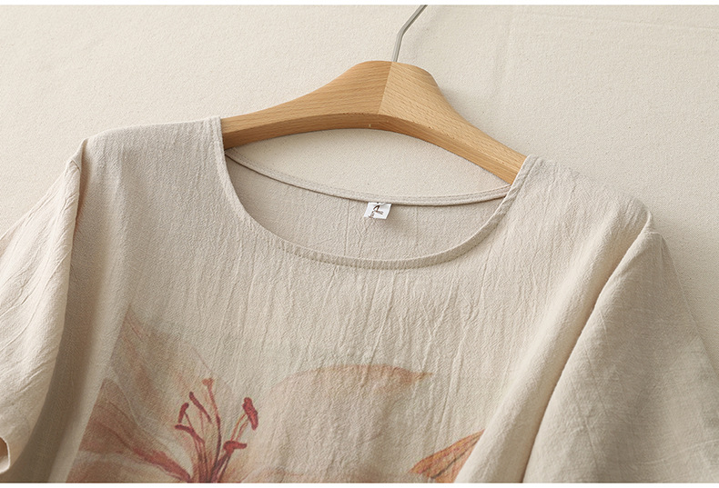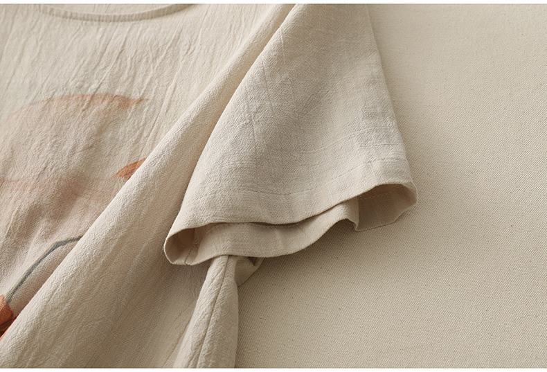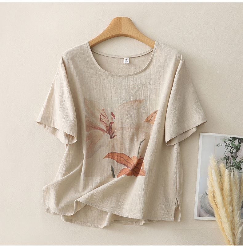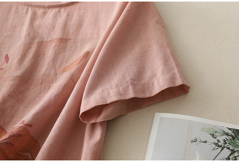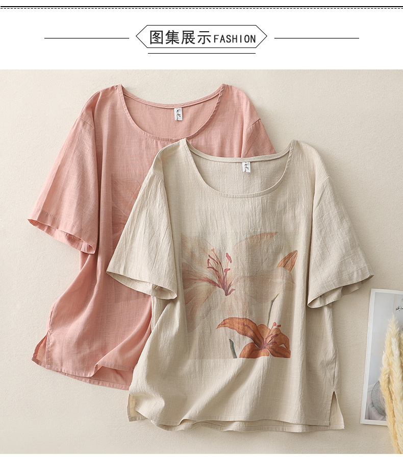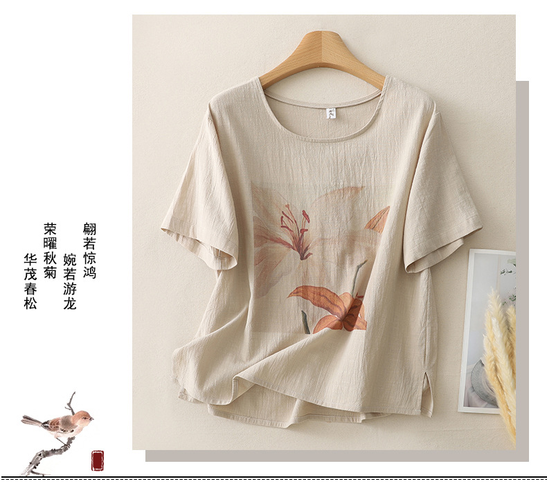 Real shot 2025 summer new cotton and linen literary and retro printing loose casual short-sleeved top T-shirt women