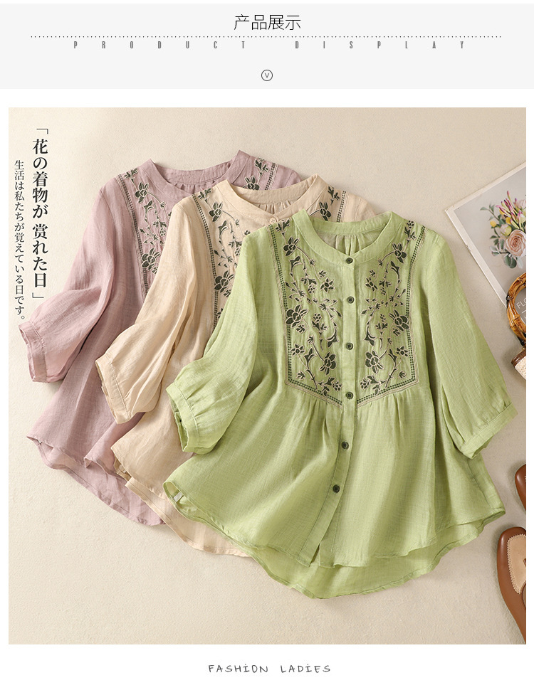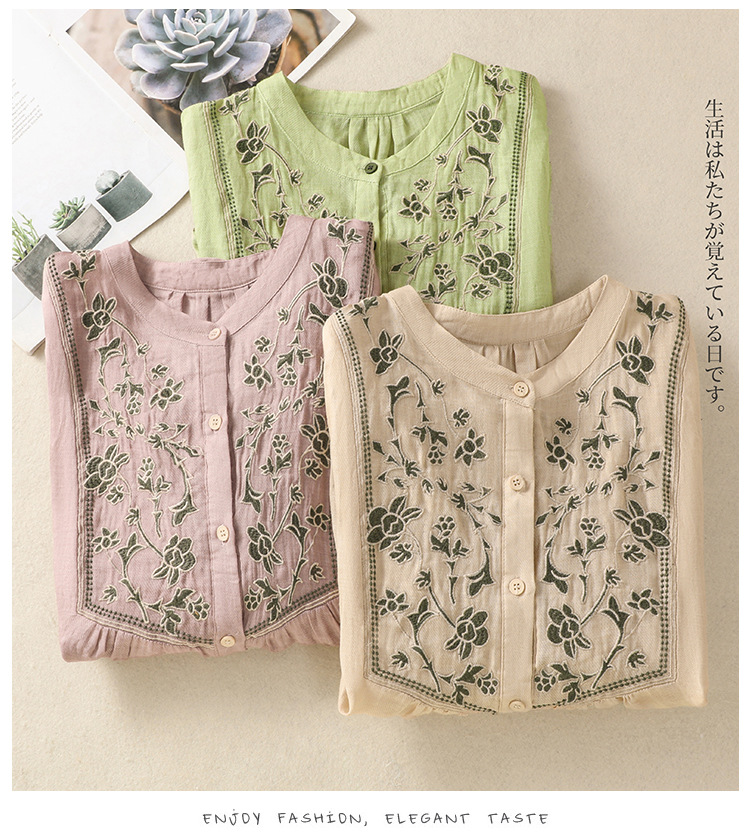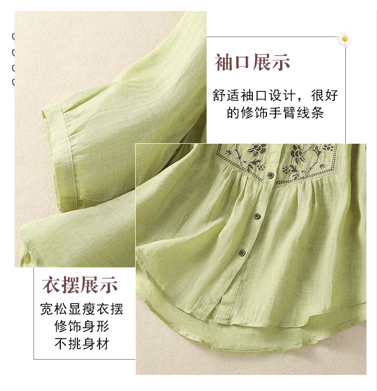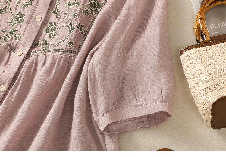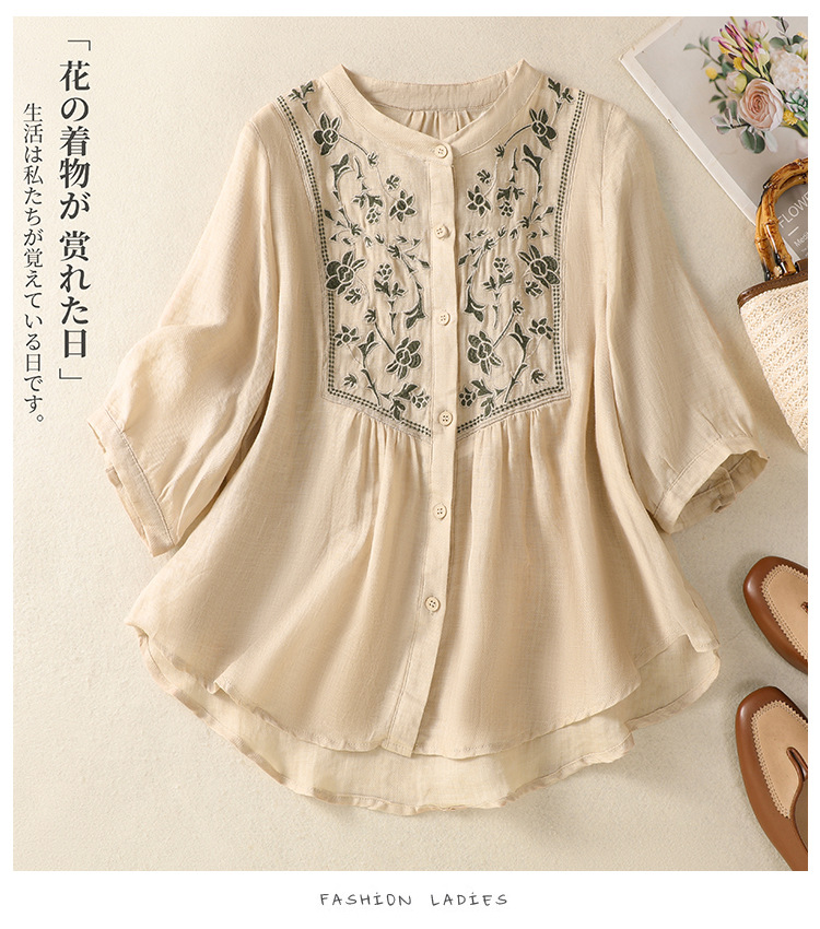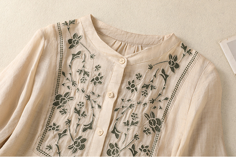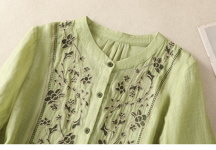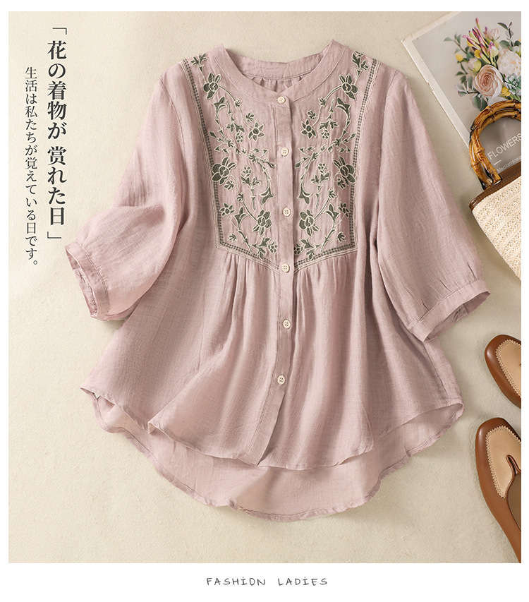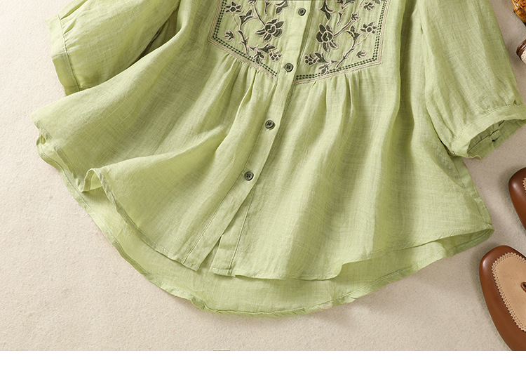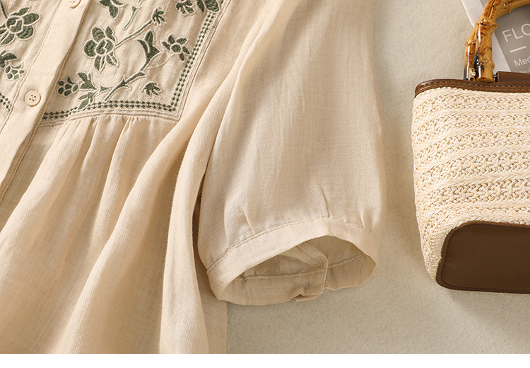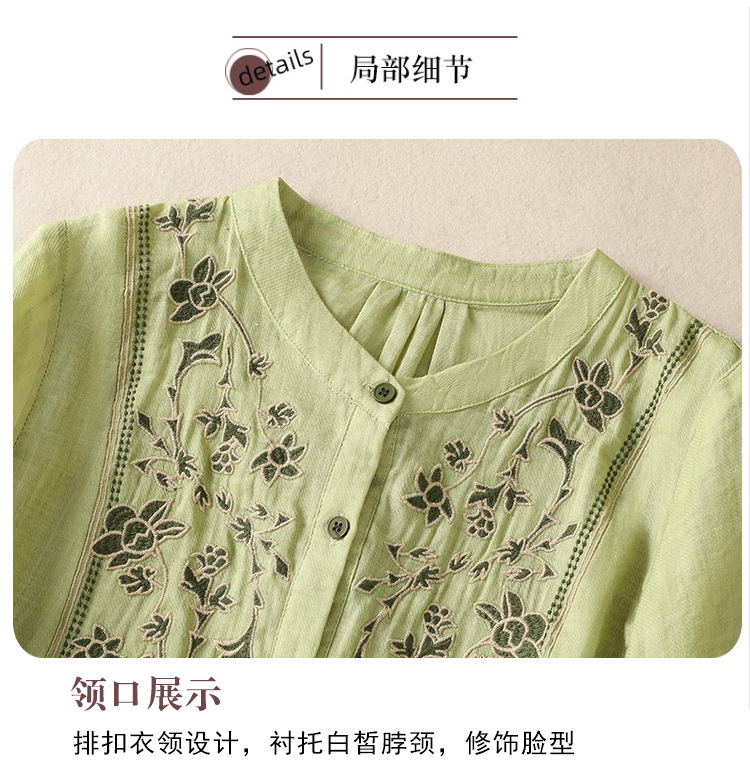 Real shot 2025 summer new cotton and linen literary retro embroidery stand-up collar single-breasted shirt embroidered top women