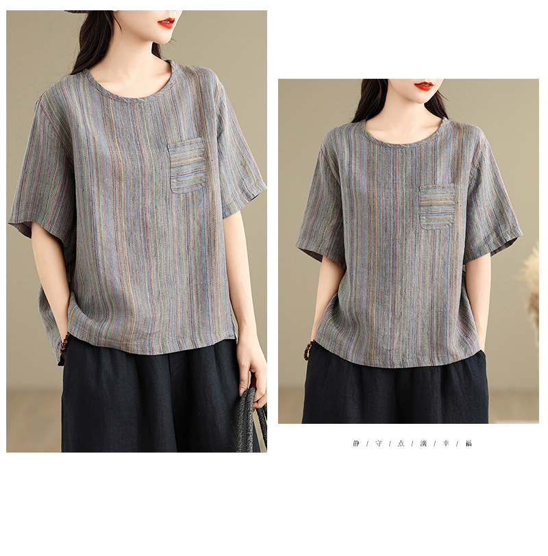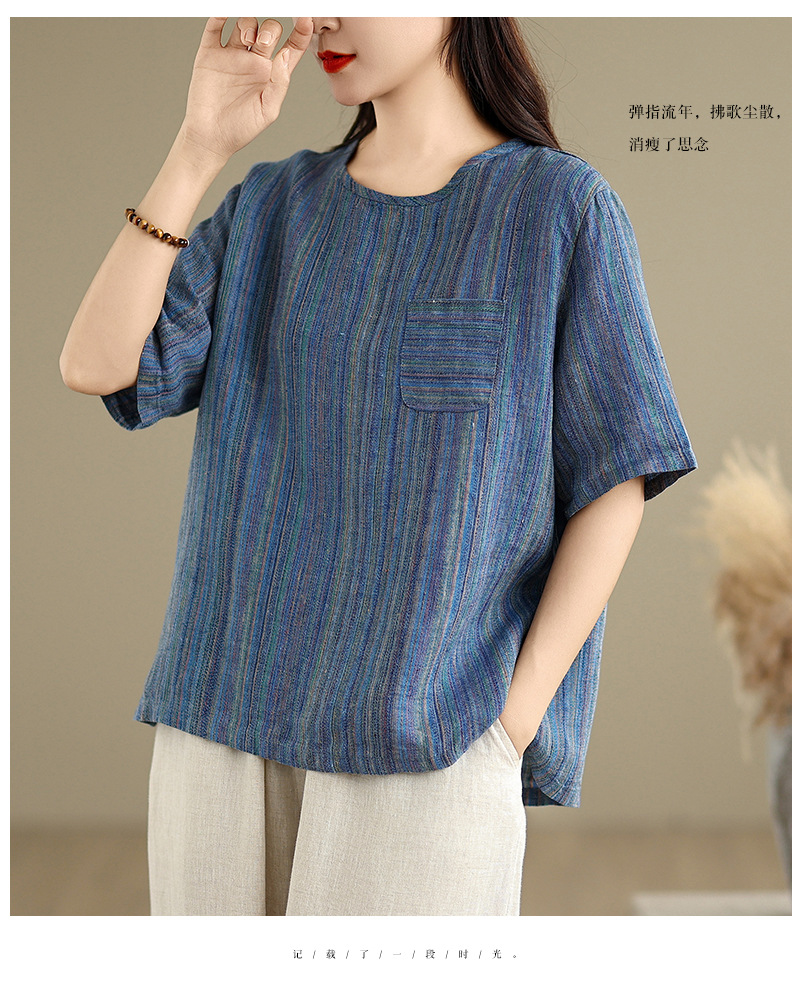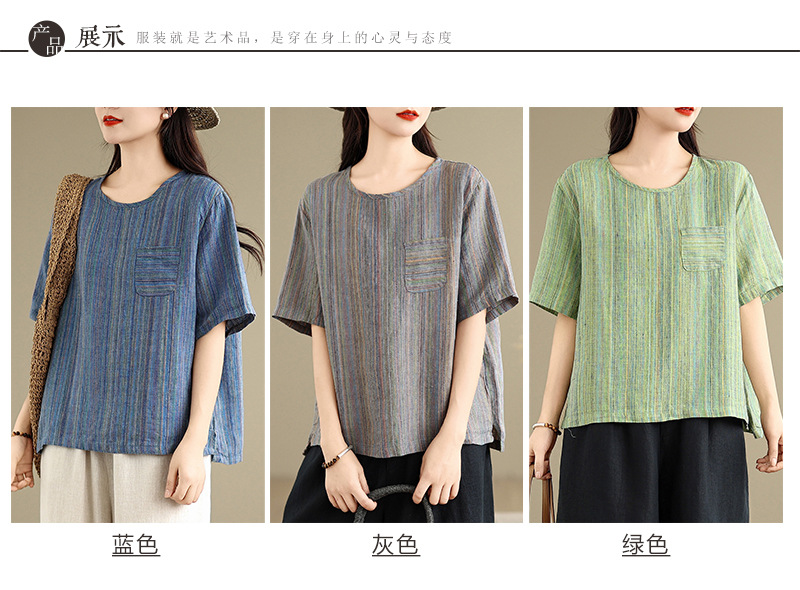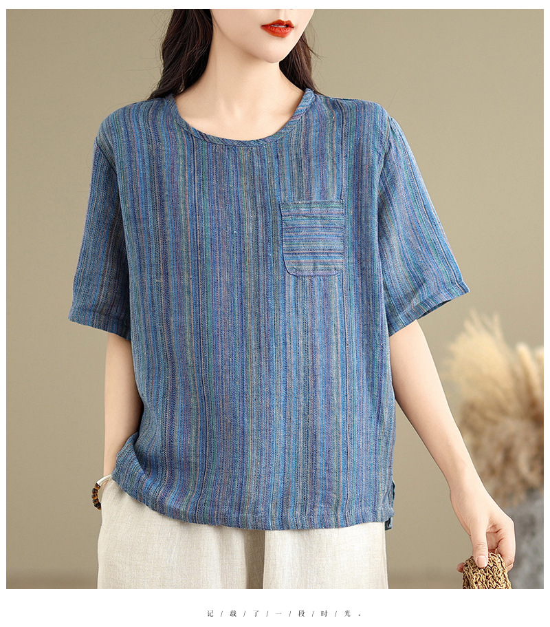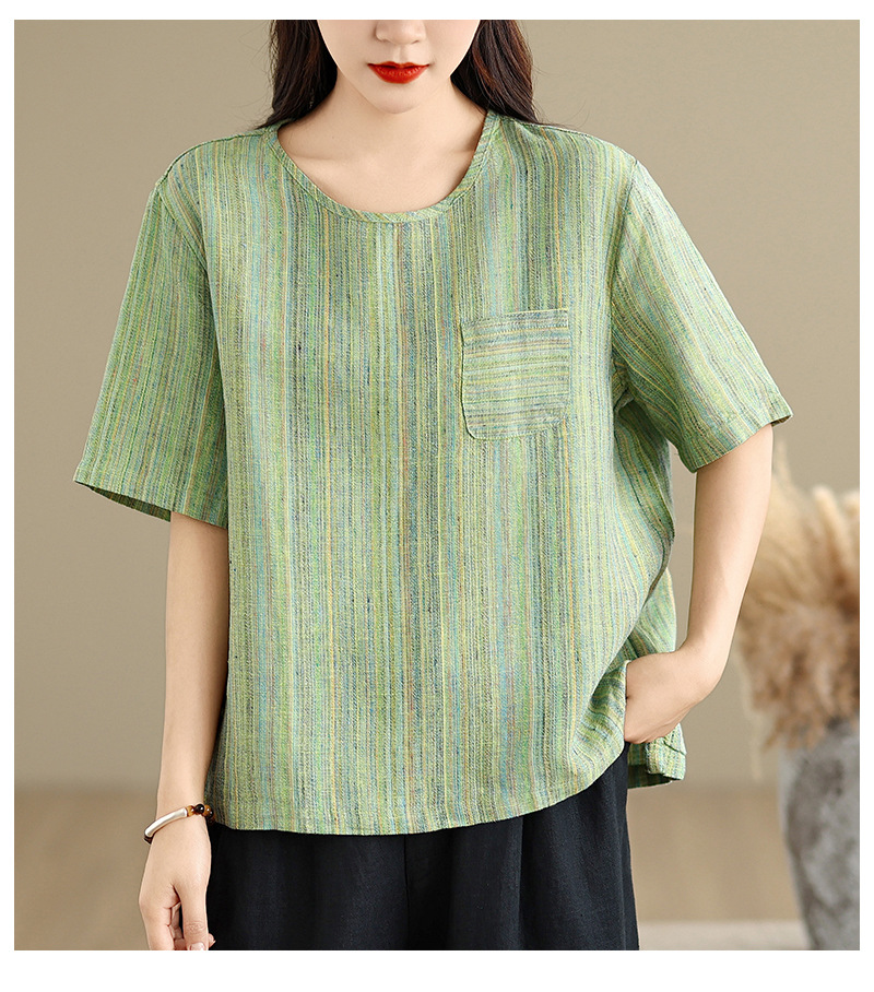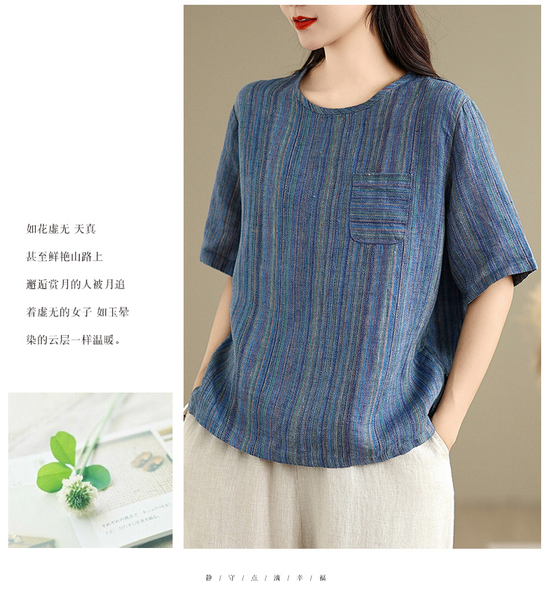 Real shot 2025 summer new cotton and linen literary retro striped short-sleeved shirt top T-shirt women