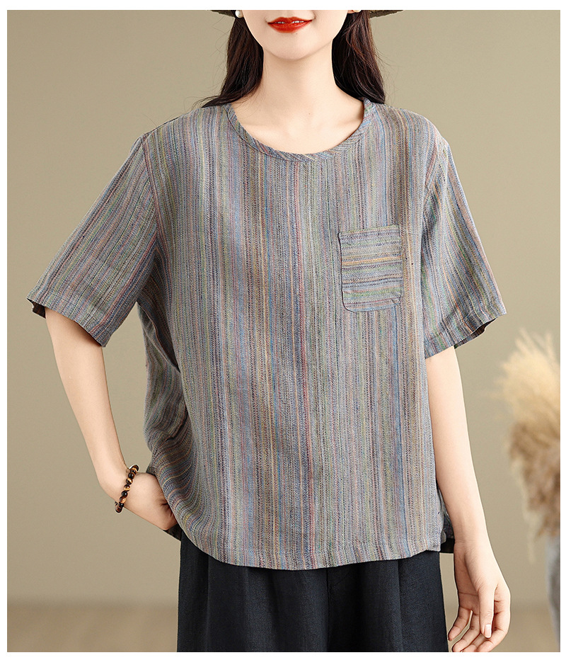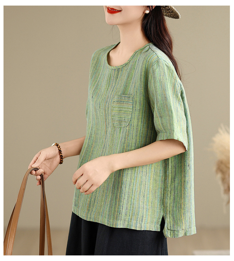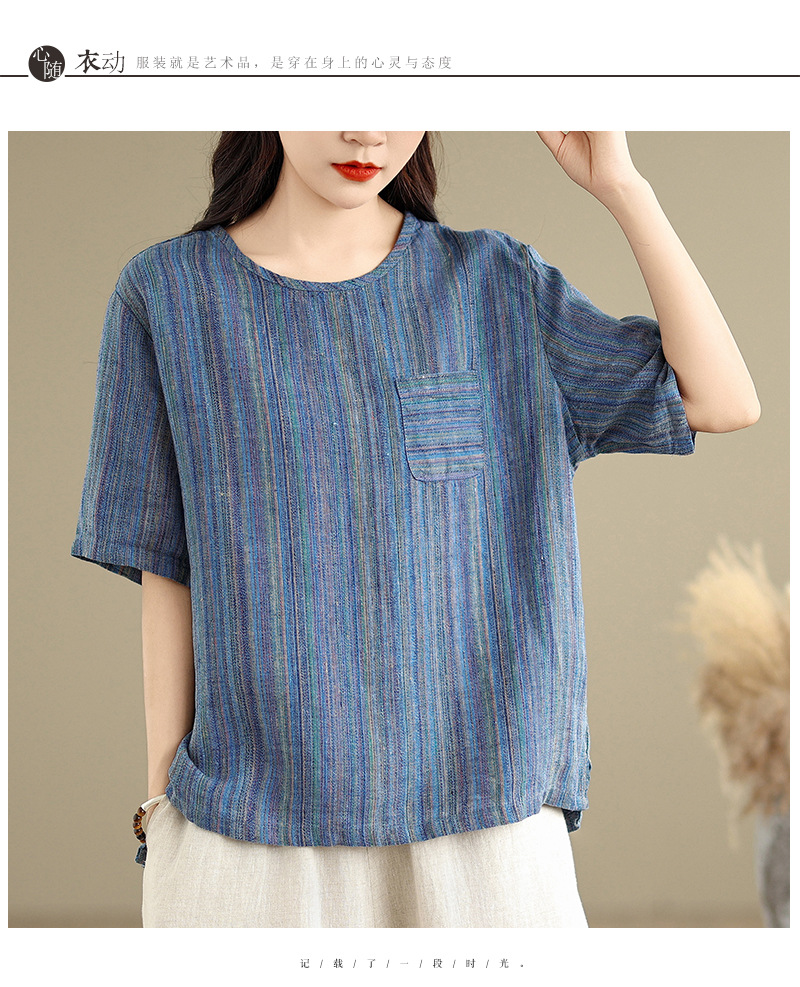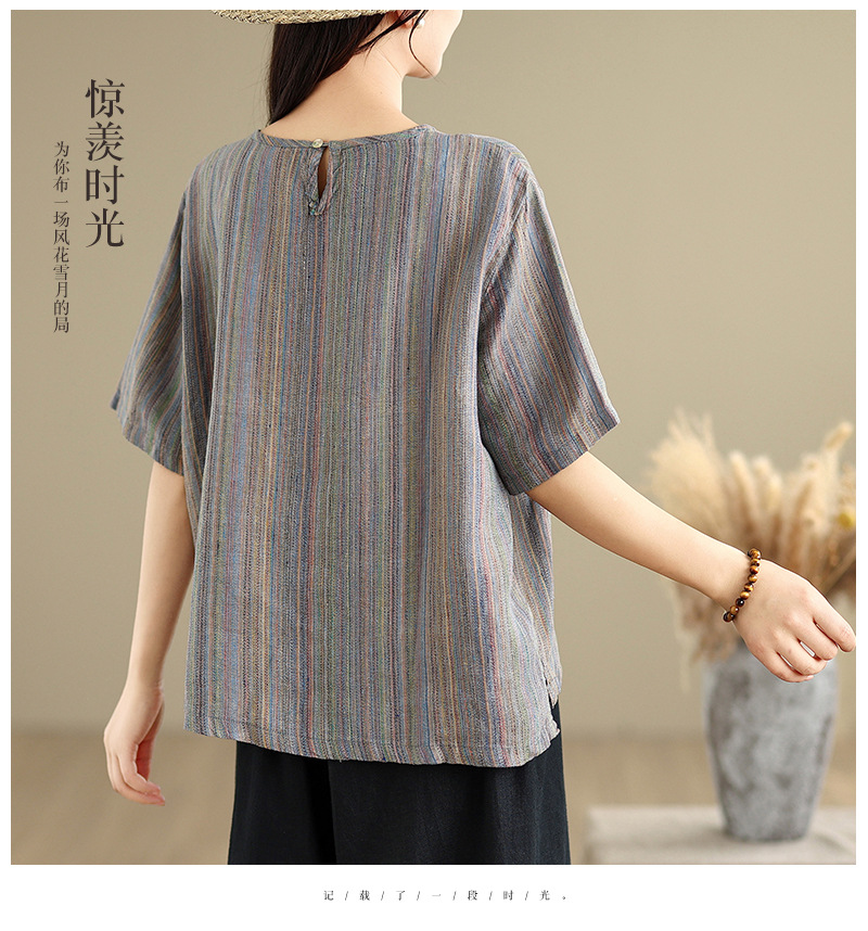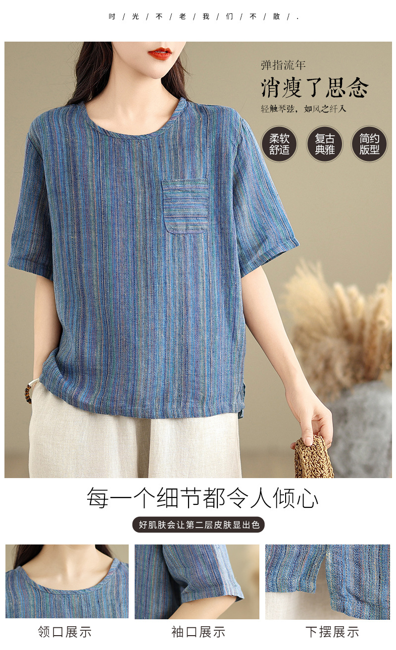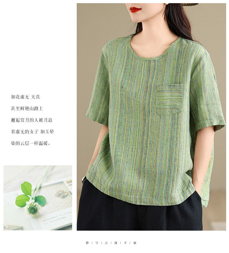 Real shot 2025 summer new cotton and linen literary retro striped short-sleeved shirt top T-shirt women