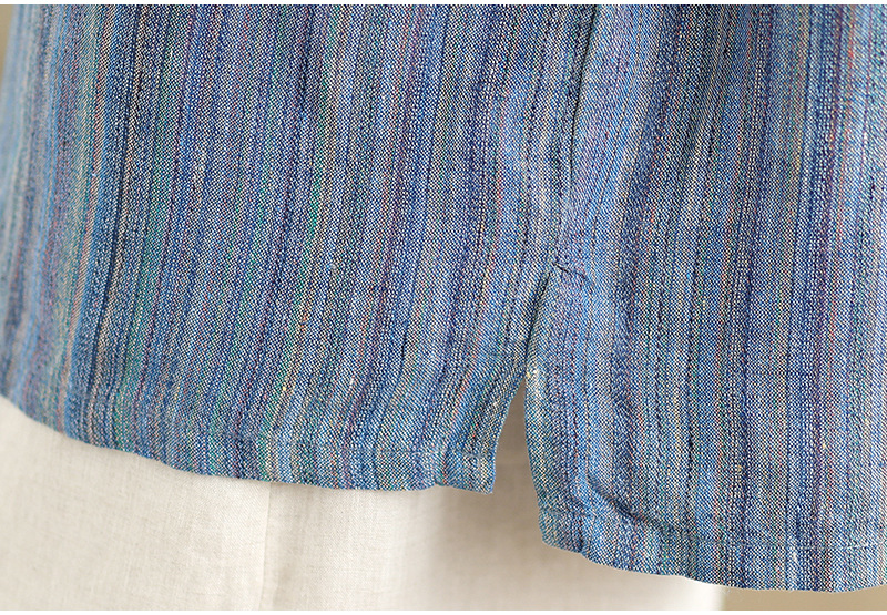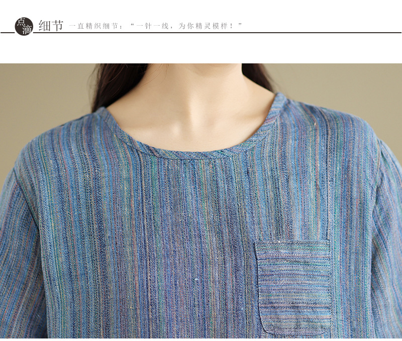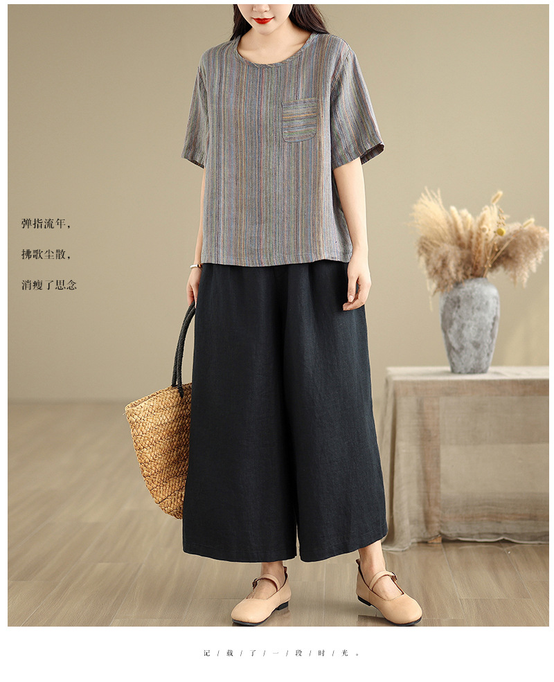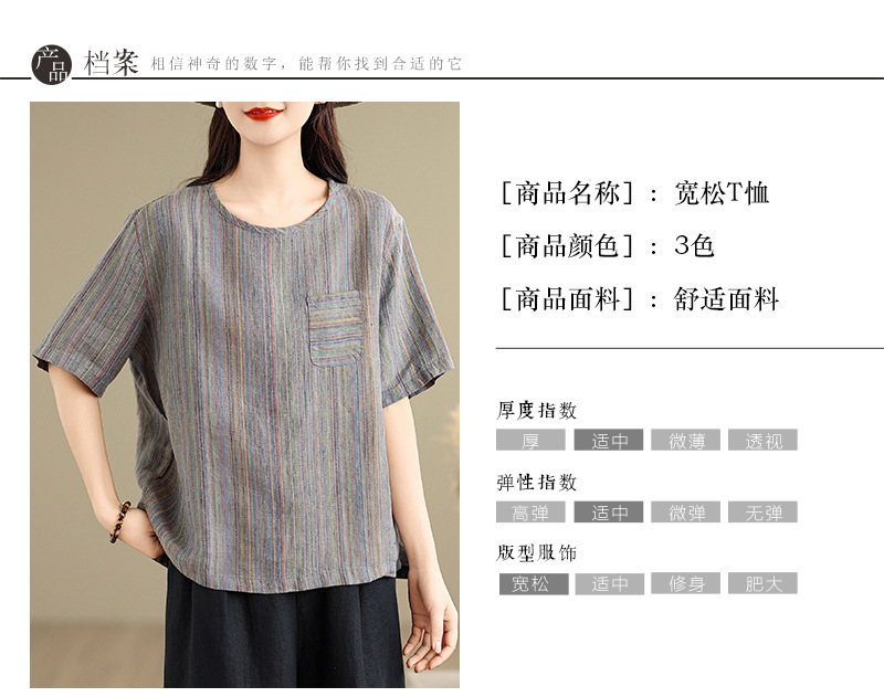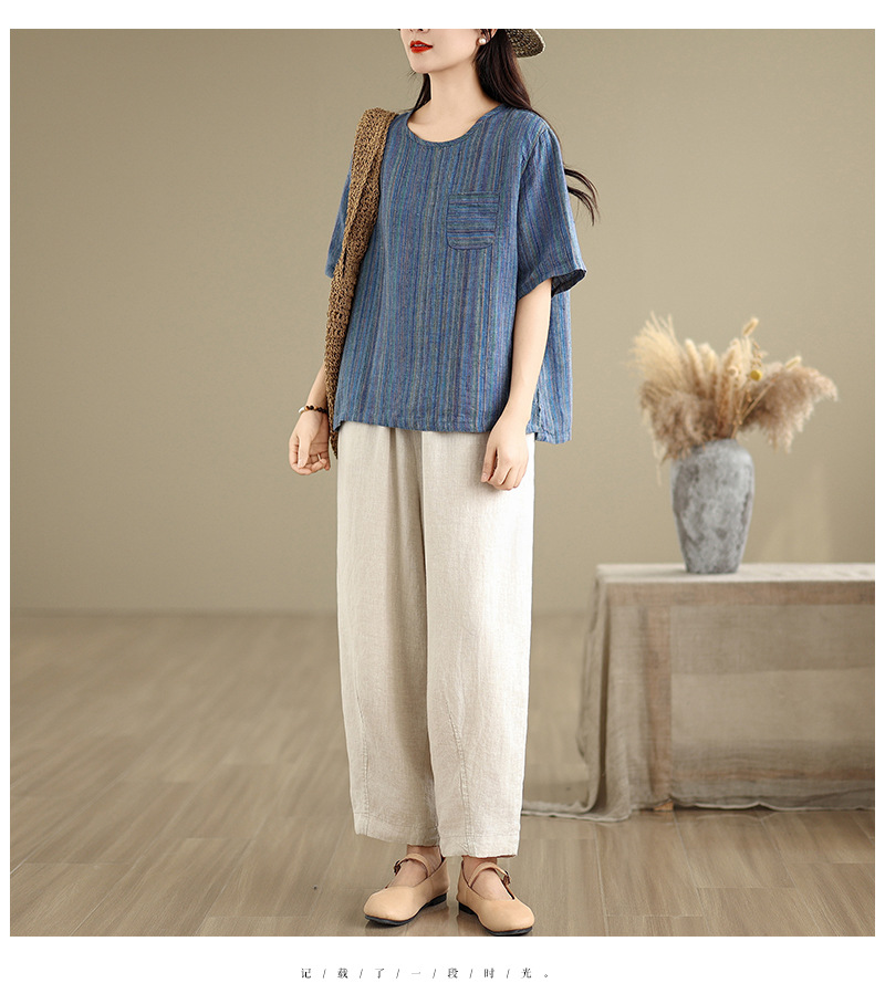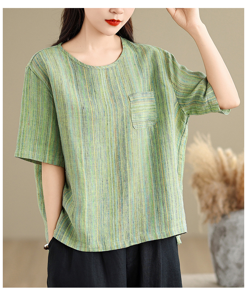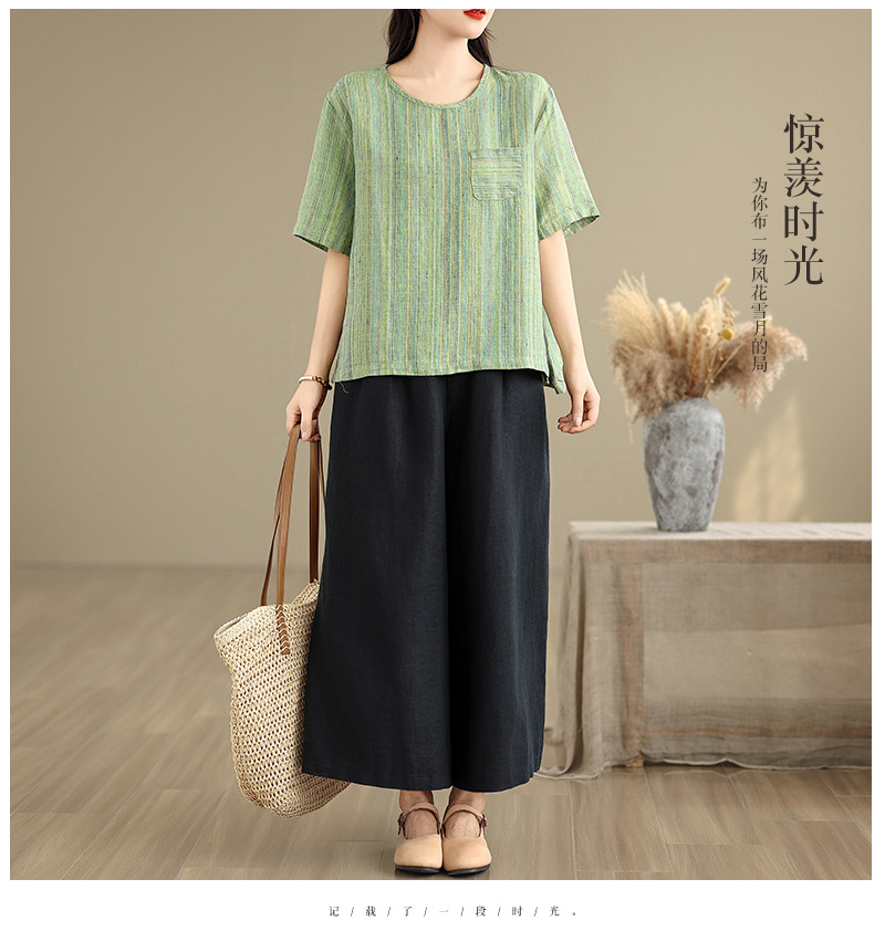 Real shot 2025 summer new cotton and linen literary retro striped short-sleeved shirt top T-shirt women