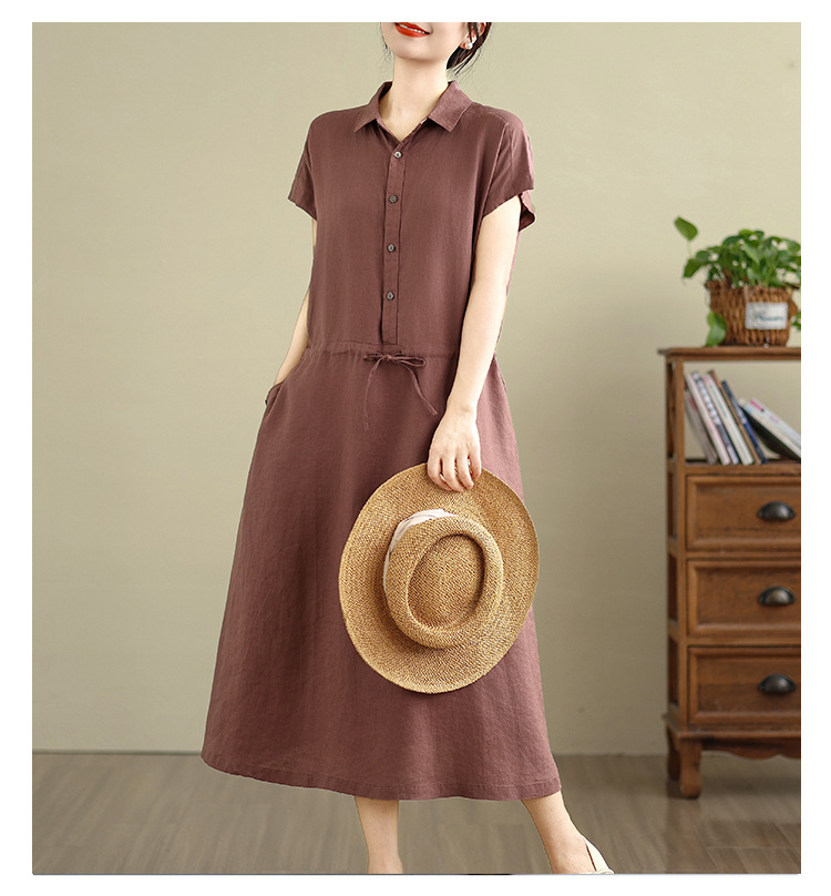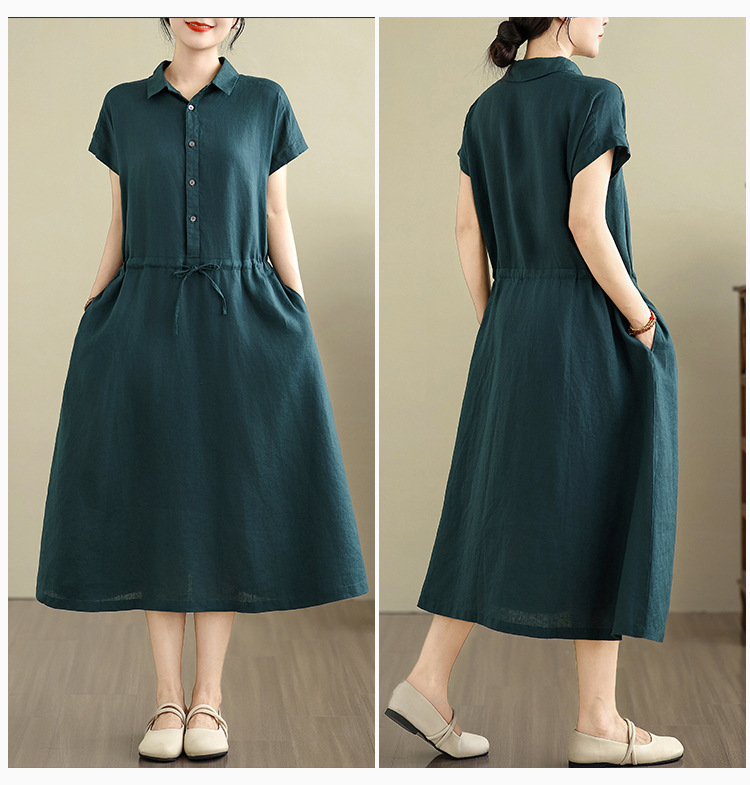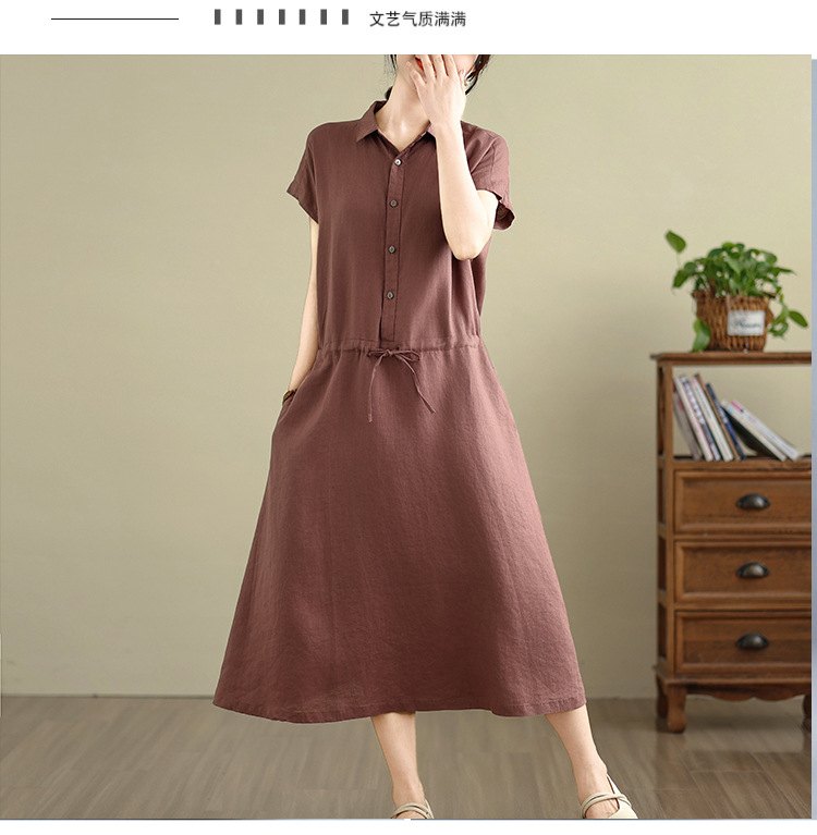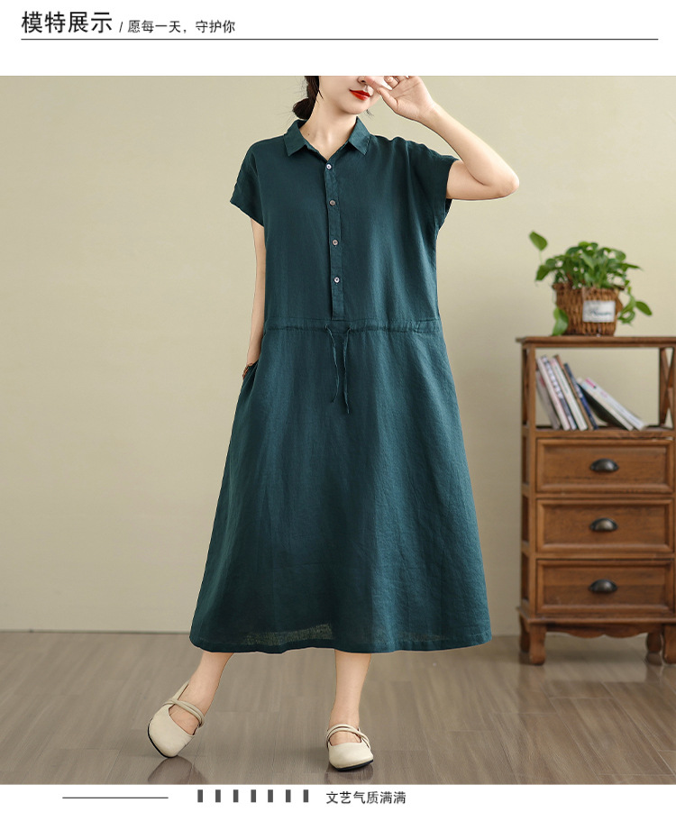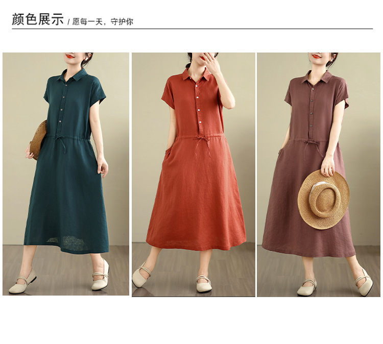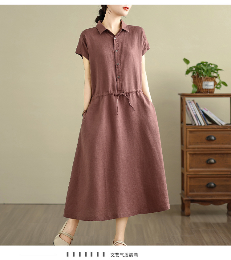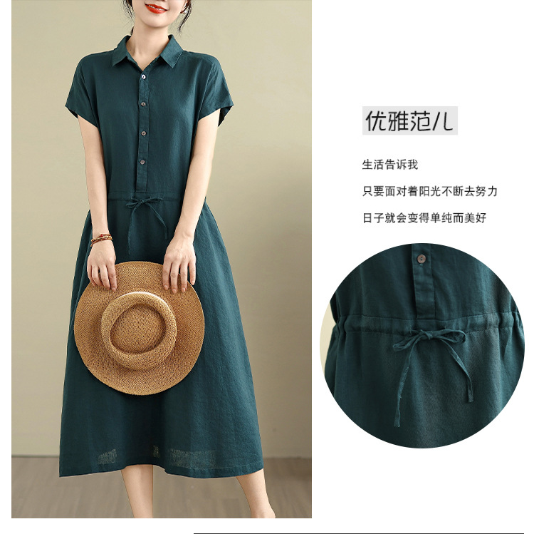 Real shot 2025 summer new cotton and linen shirt dress short sleeve lapel simple commuter shirt skirt women's clothing