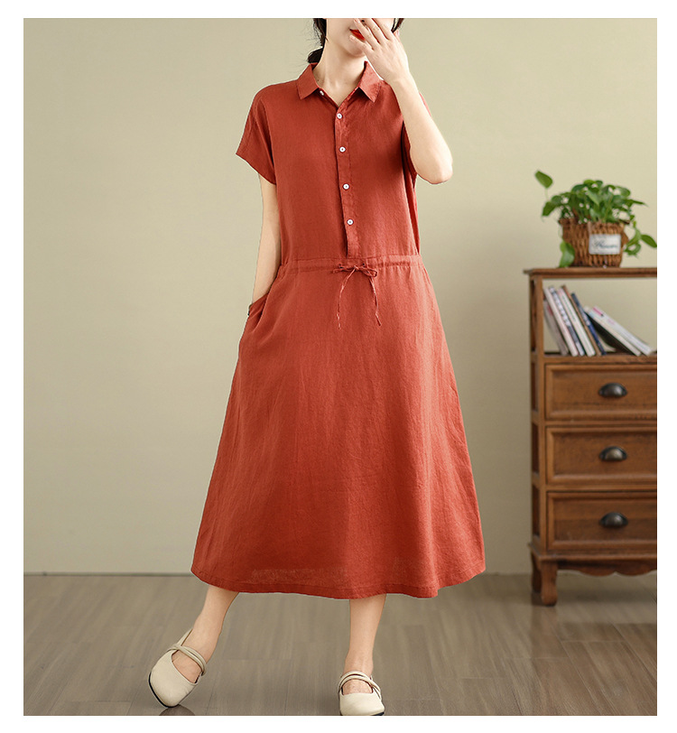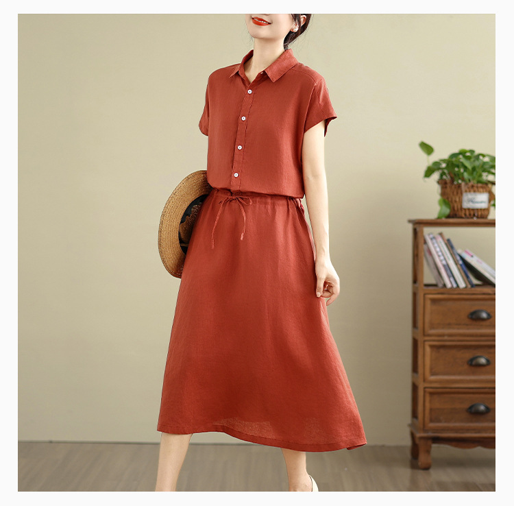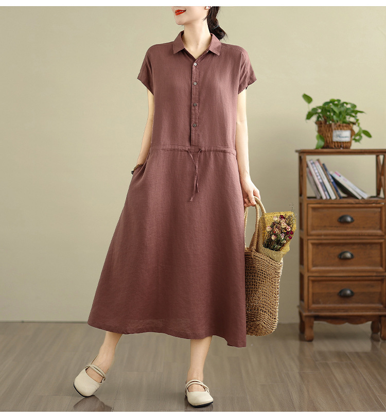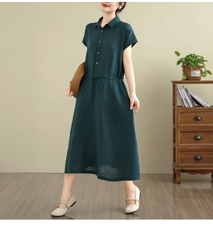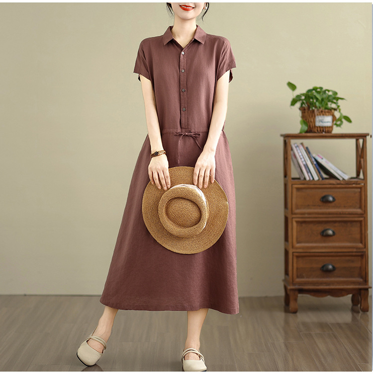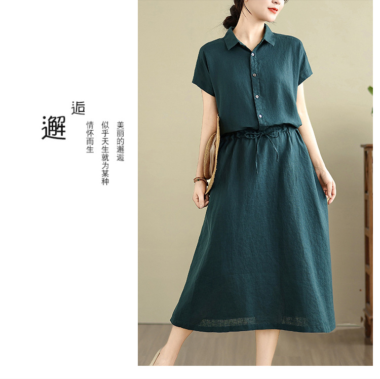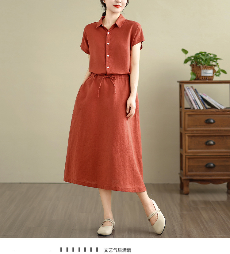 Real shot 2025 summer new cotton and linen shirt dress short sleeve lapel simple commuter shirt skirt women's clothing