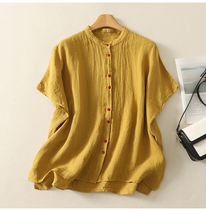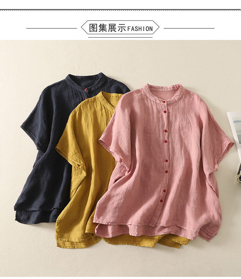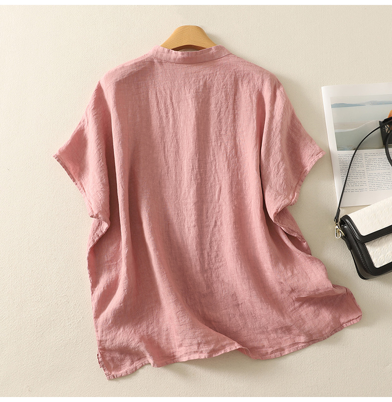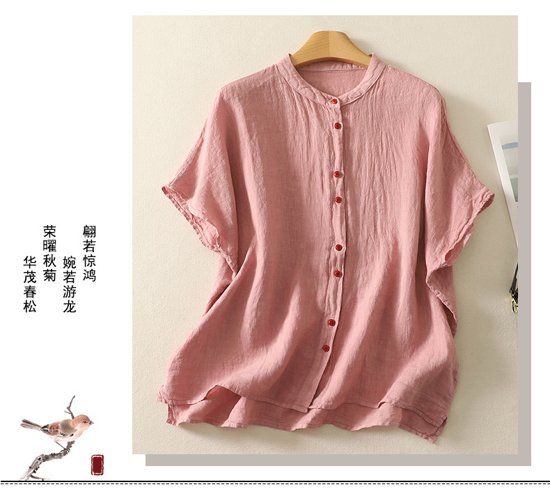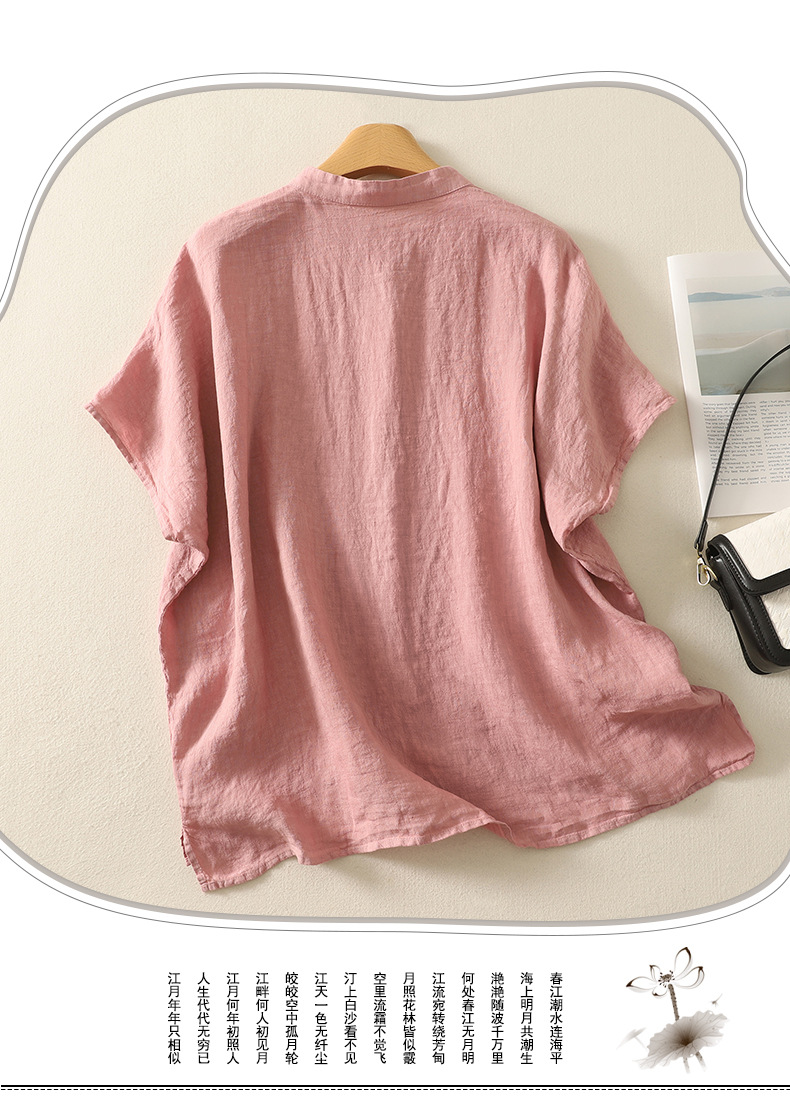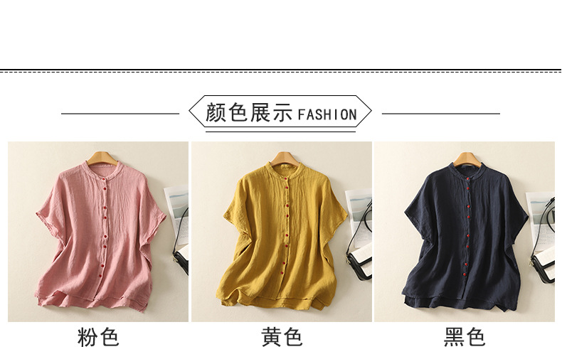 Real shot 2025 summer new cotton and linen solid color Chinese style large size loose casual short-sleeved shirt top women