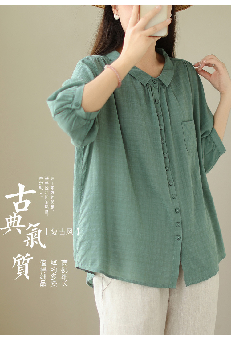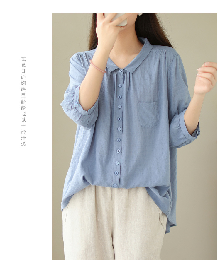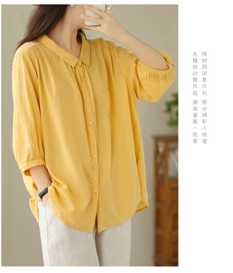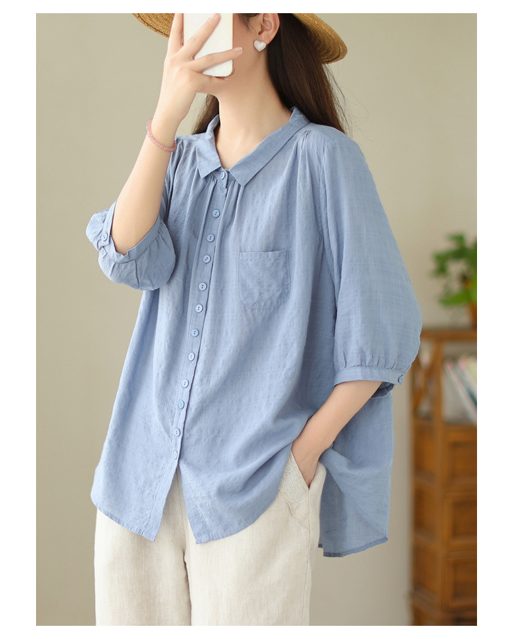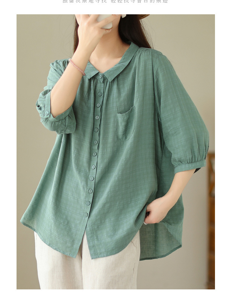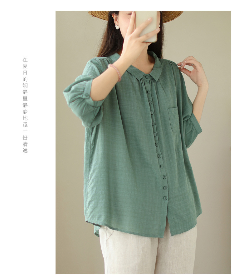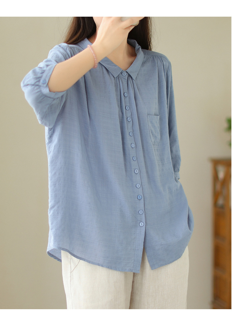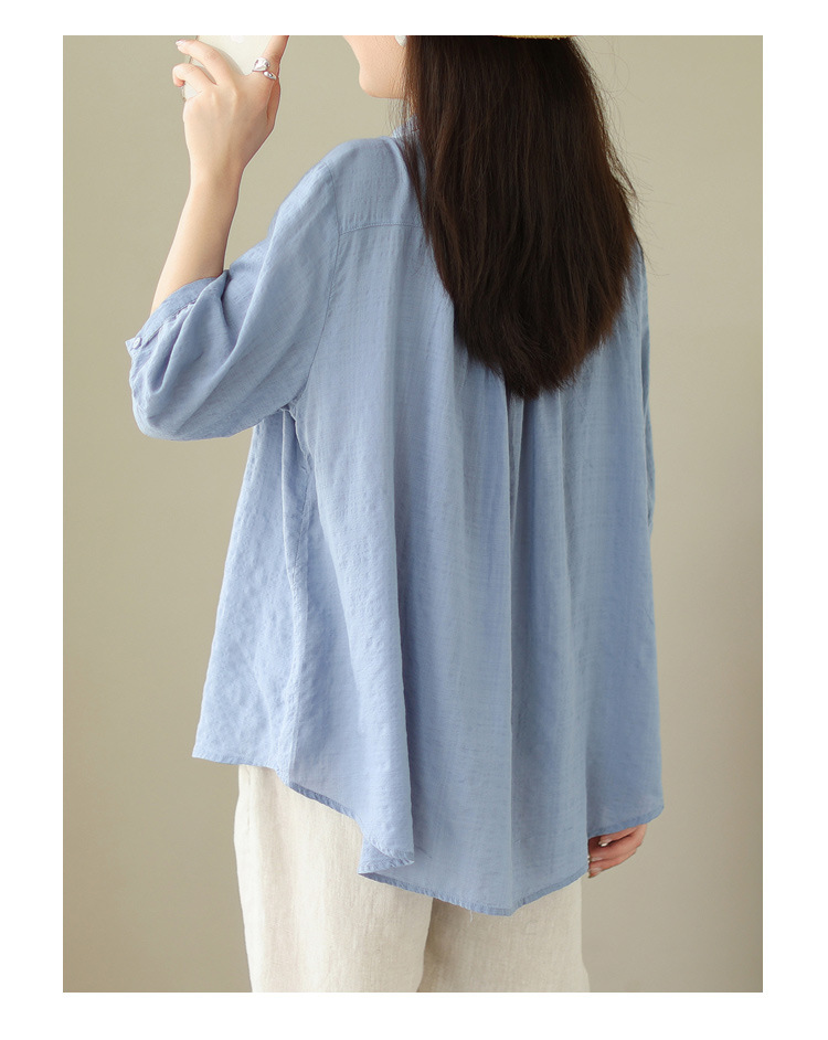 Real shot 2025 summer new large size solid color four-eye buckle retro literary loose and thin shirt top women