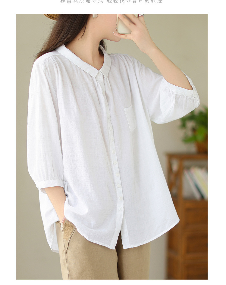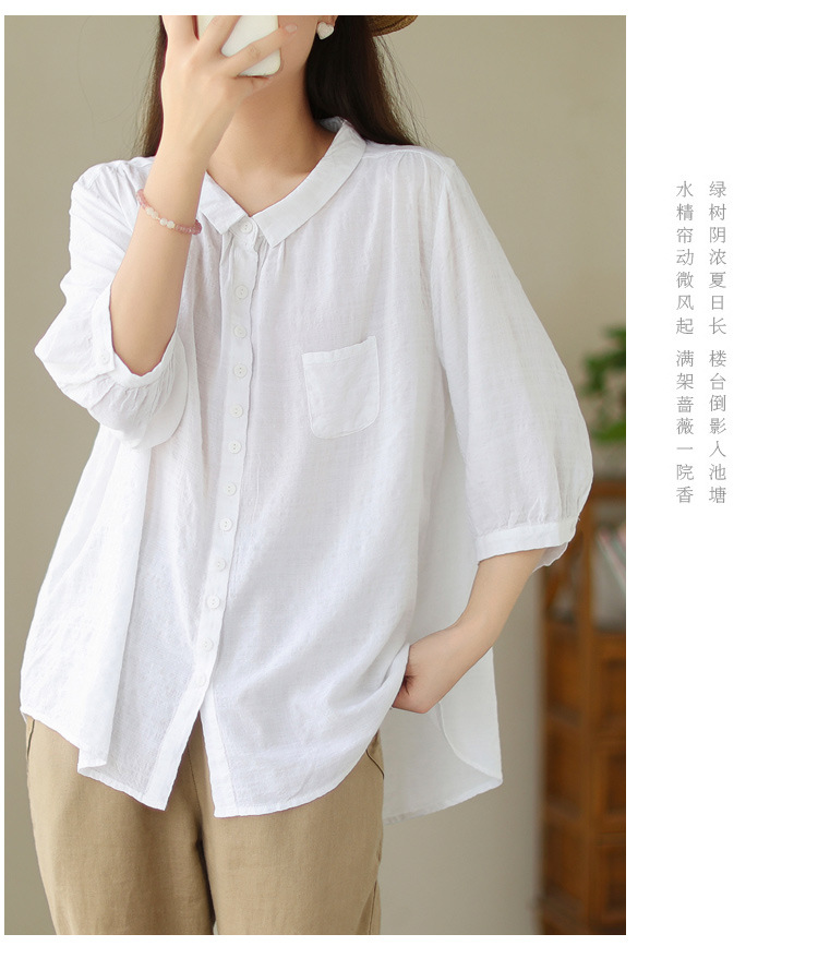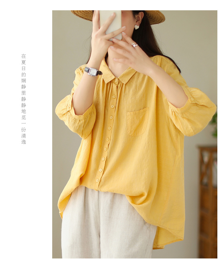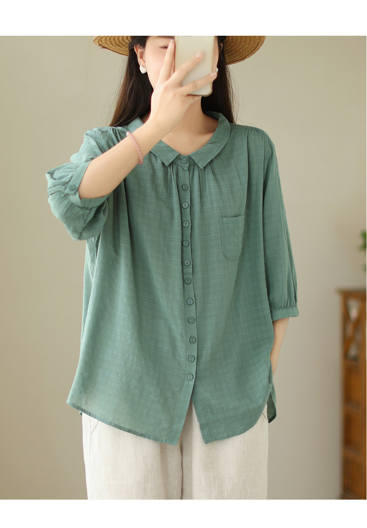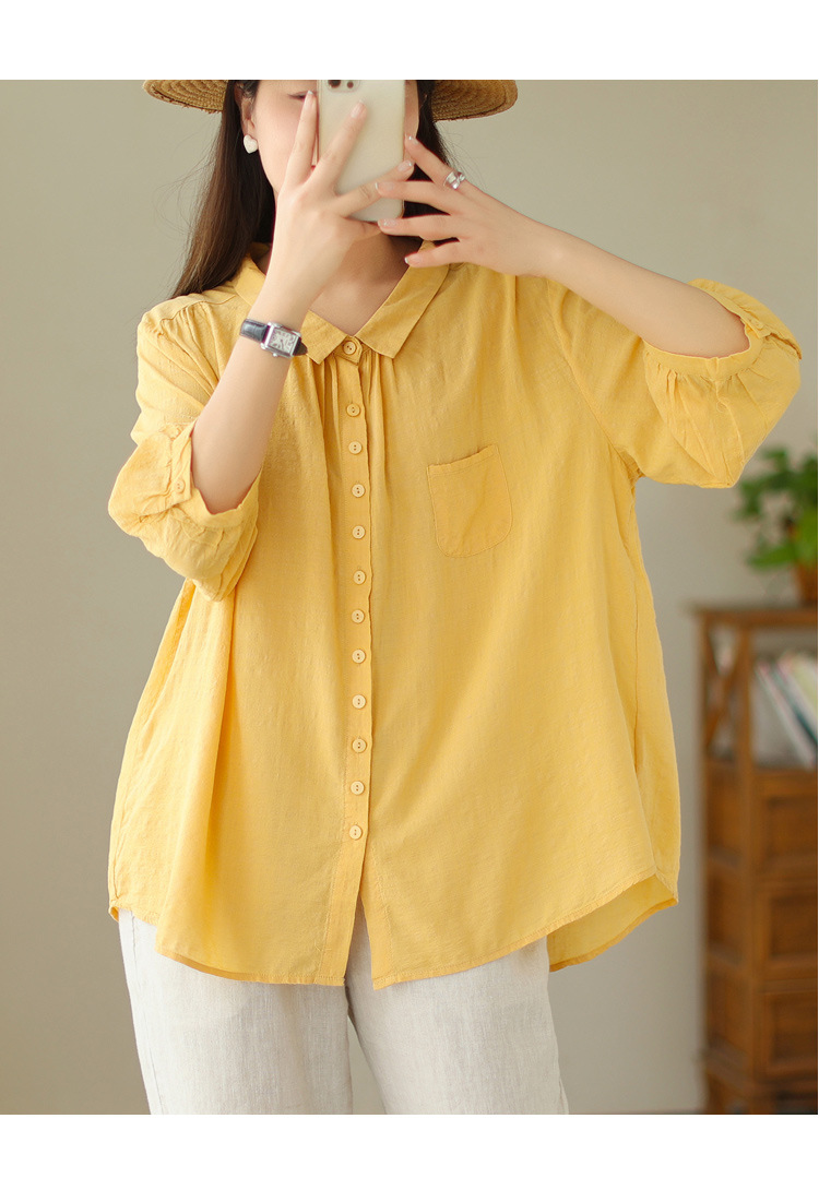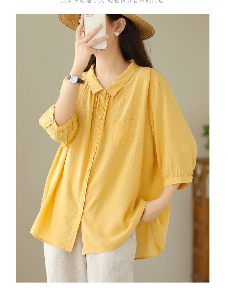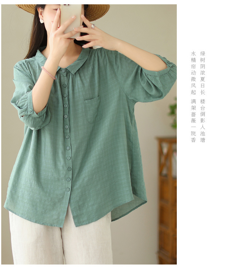 Real shot 2025 summer new large size solid color four-eye buckle retro literary loose and thin shirt top women