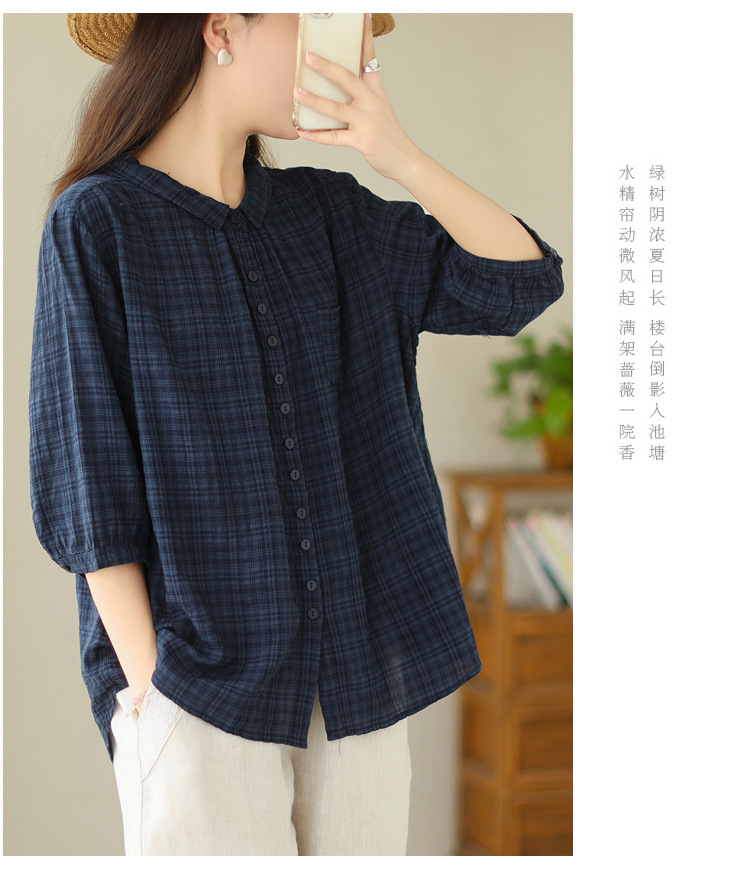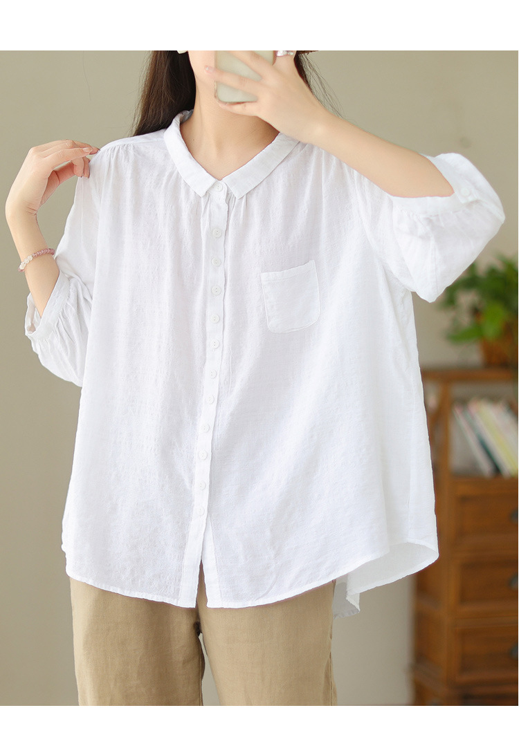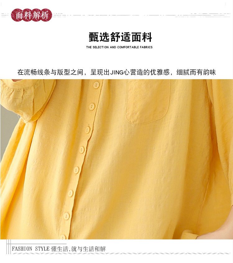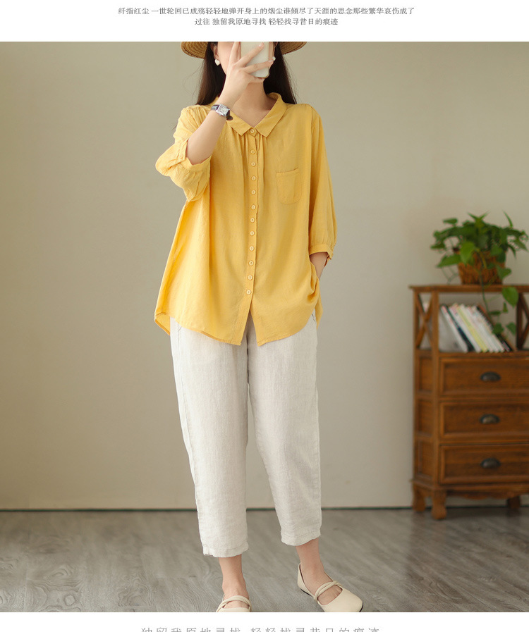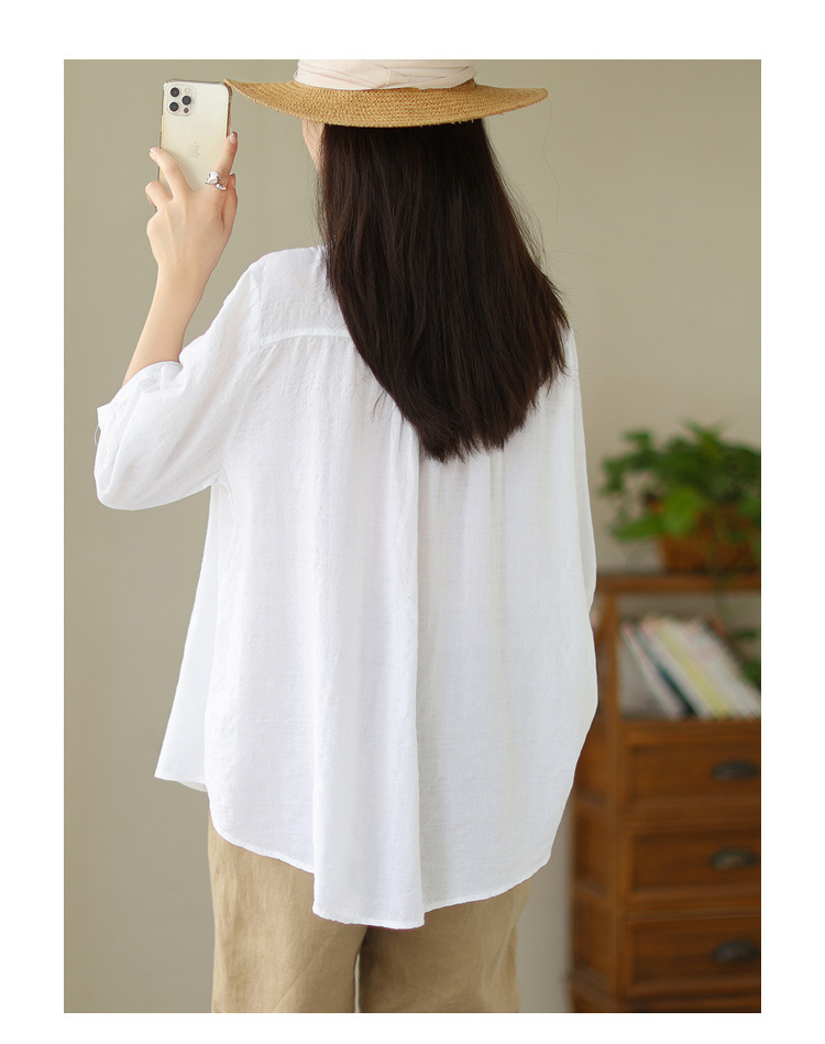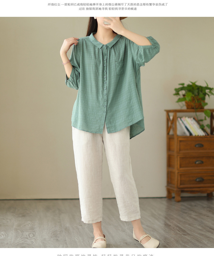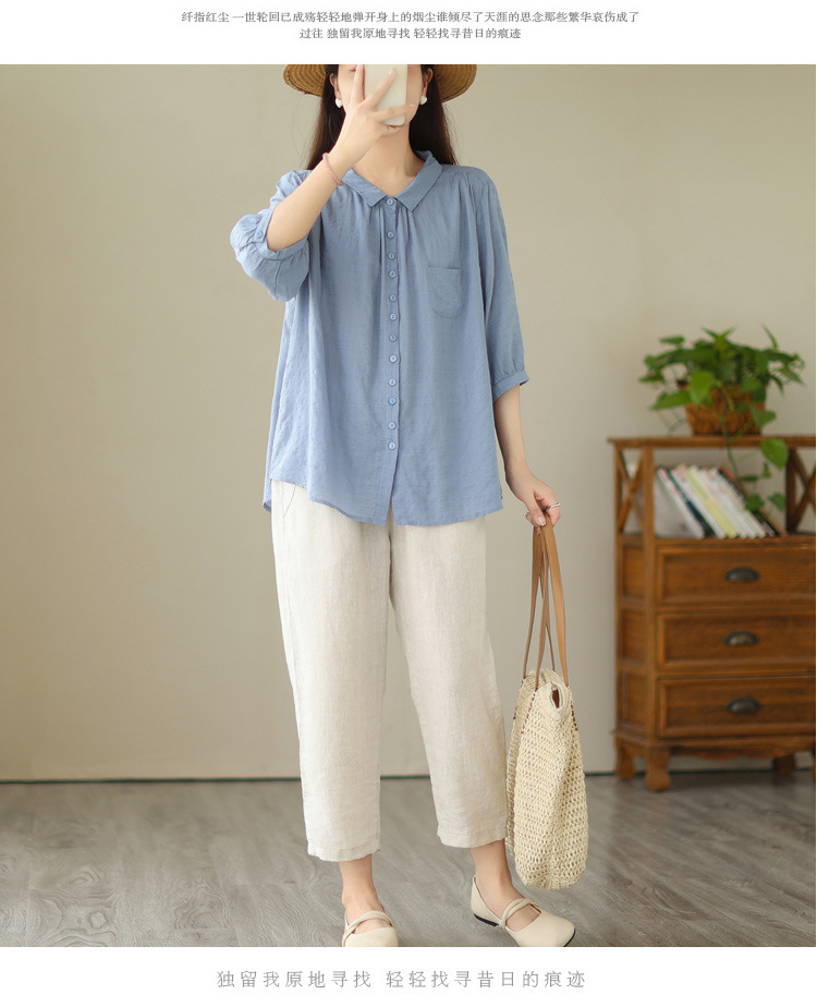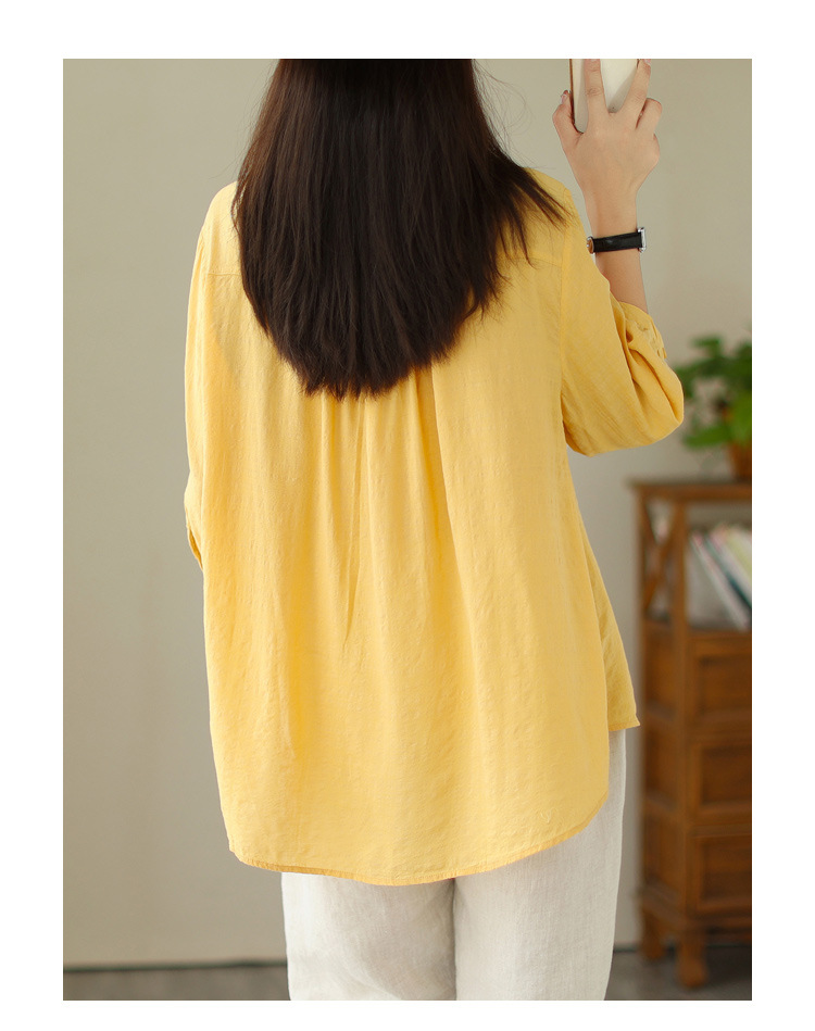 Real shot 2025 summer new large size solid color four-eye buckle retro literary loose and thin shirt top women
