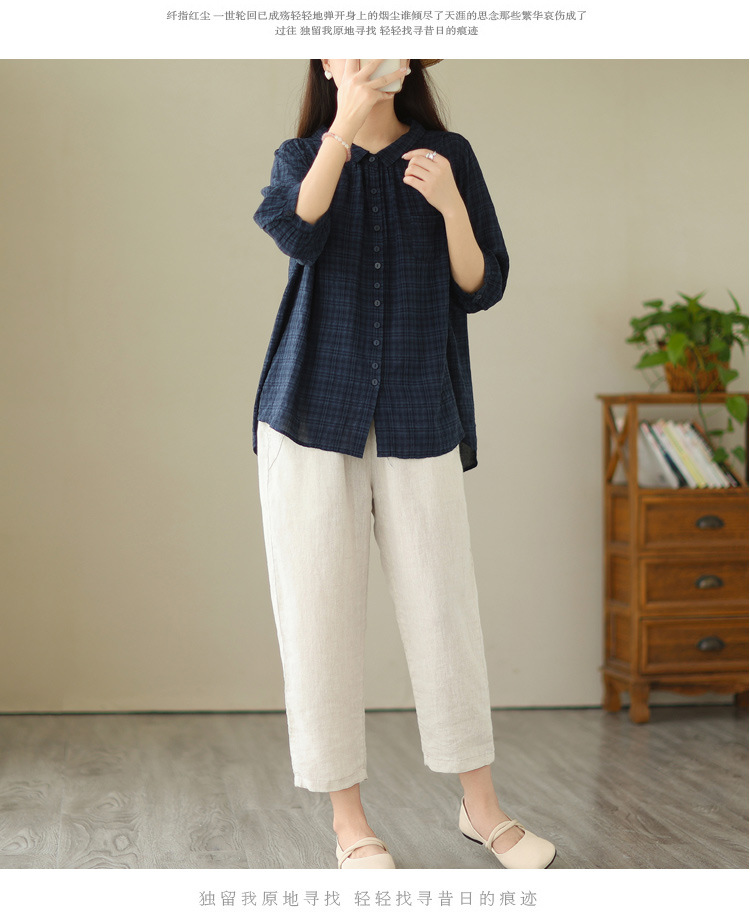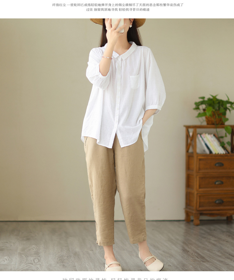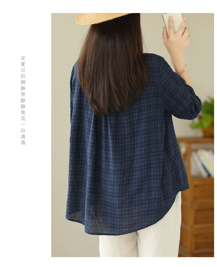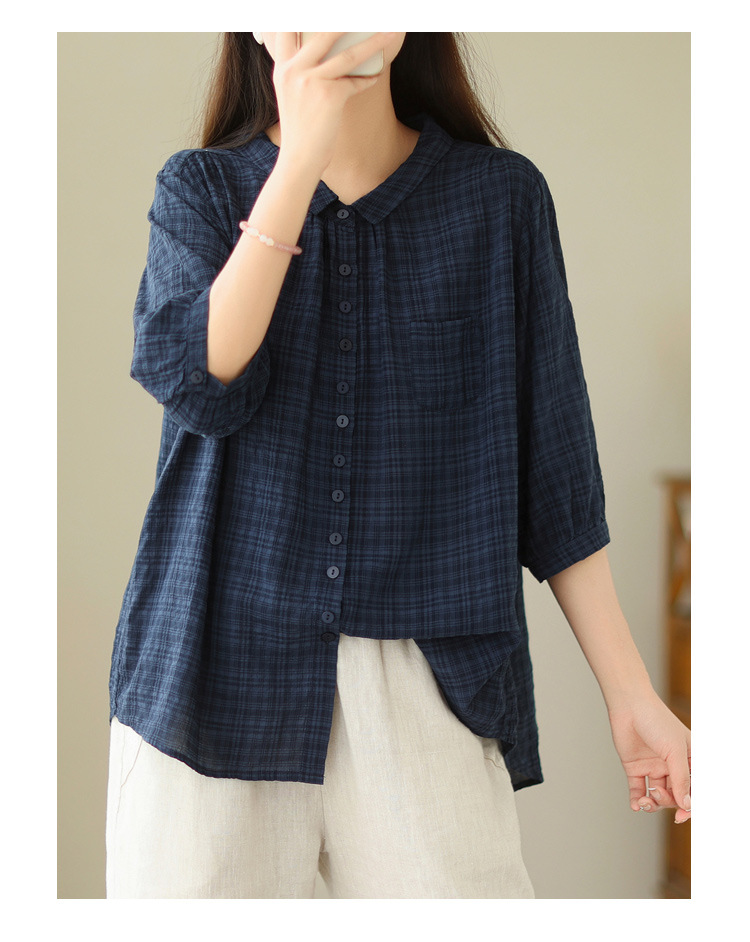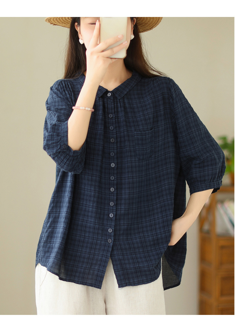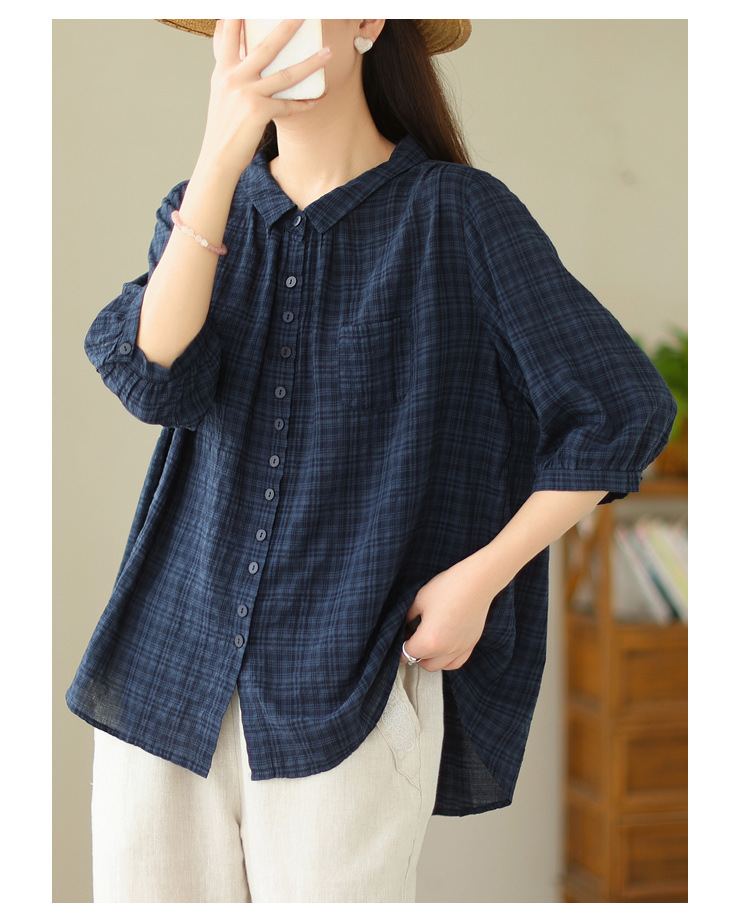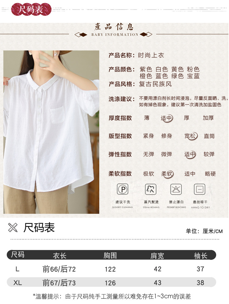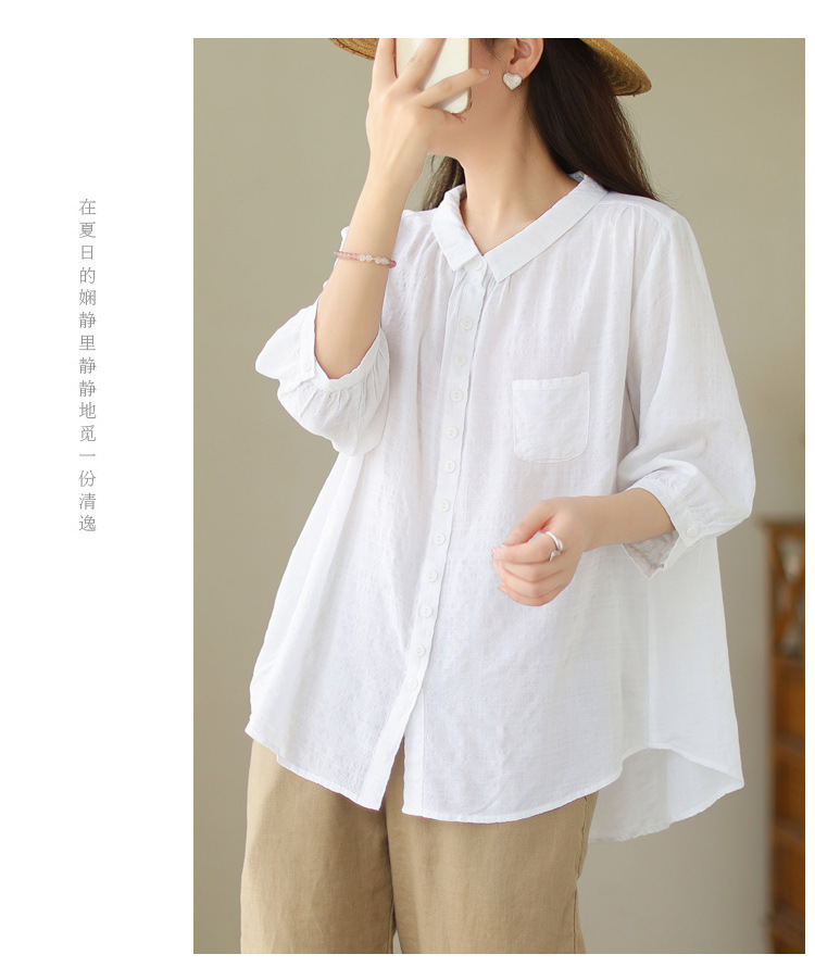 Real shot 2025 summer new large size solid color four-eye buckle retro literary loose and thin shirt top women