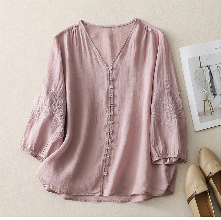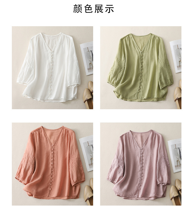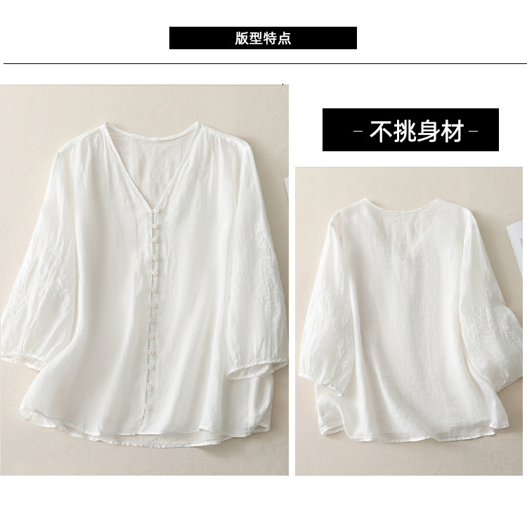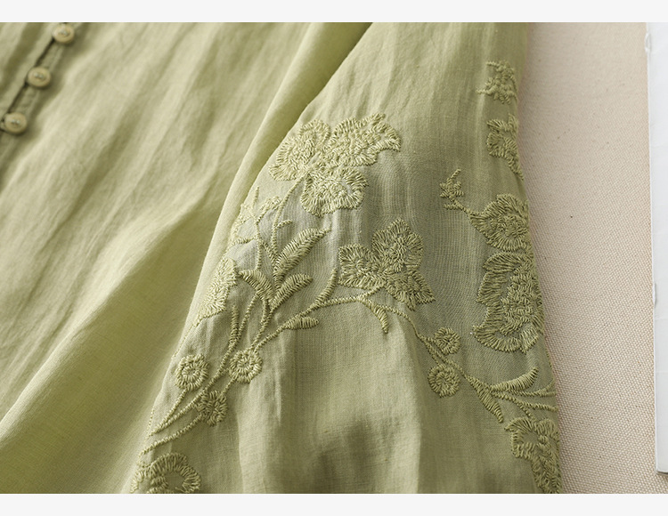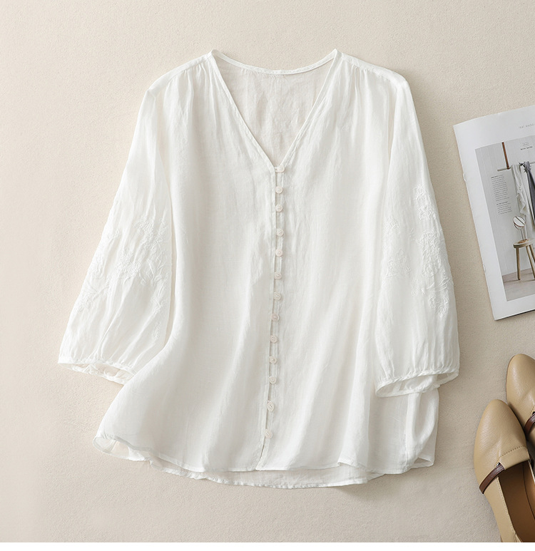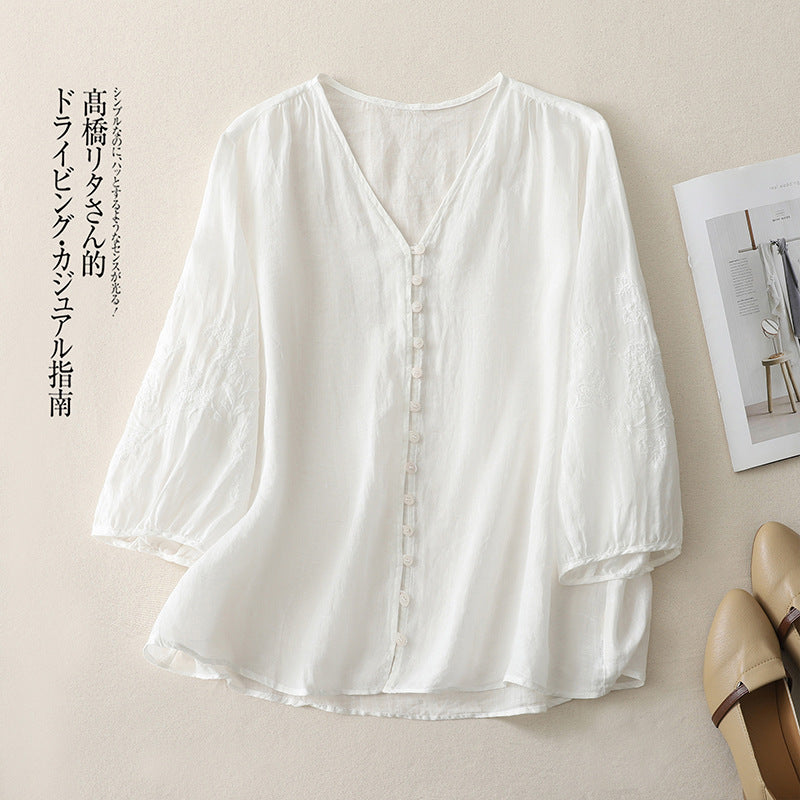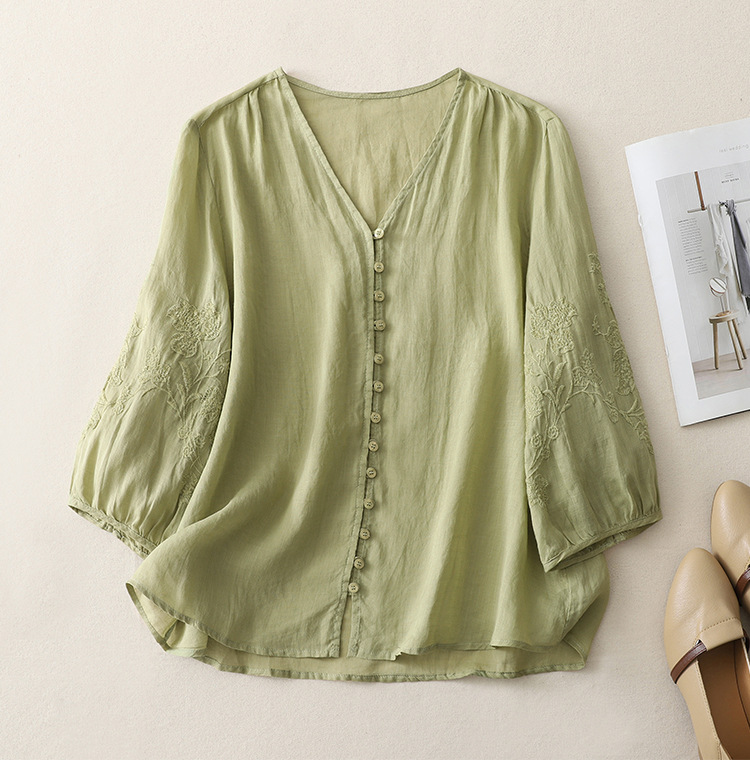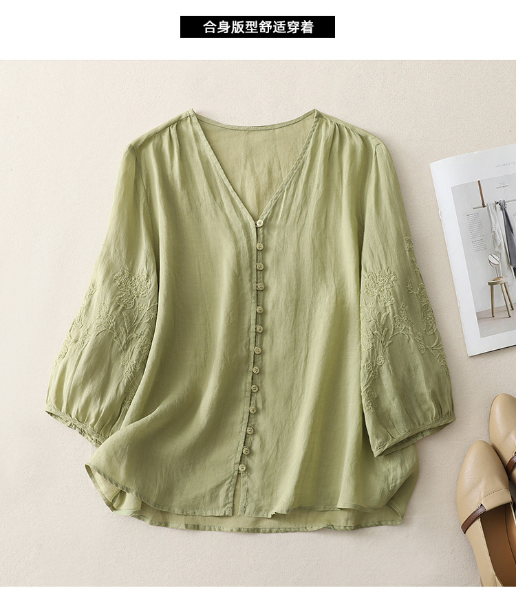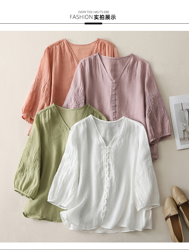Real shot 2025 summer new literary embroidery button shirt V-neck cardigan cotton and linen shirt top women's clothing