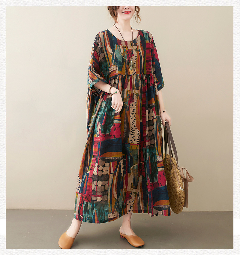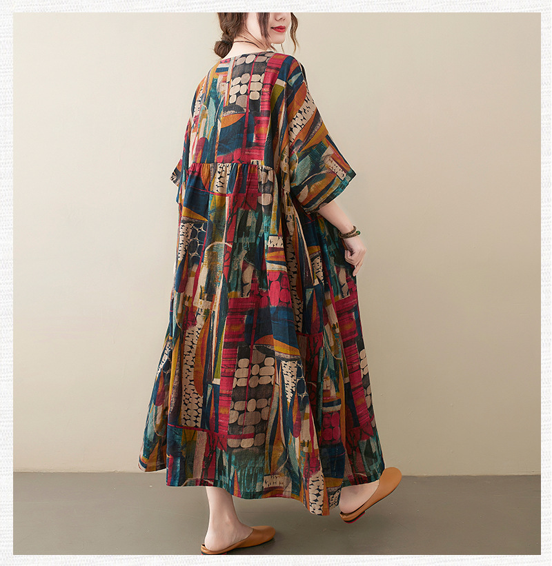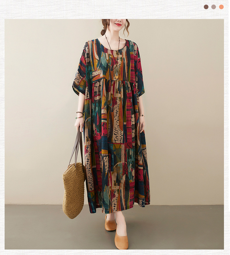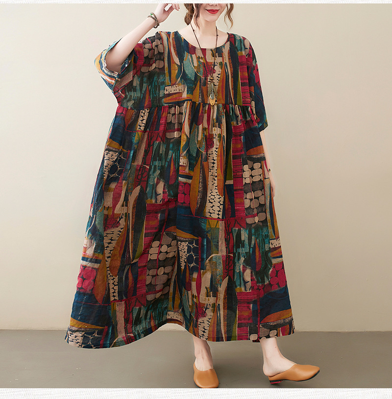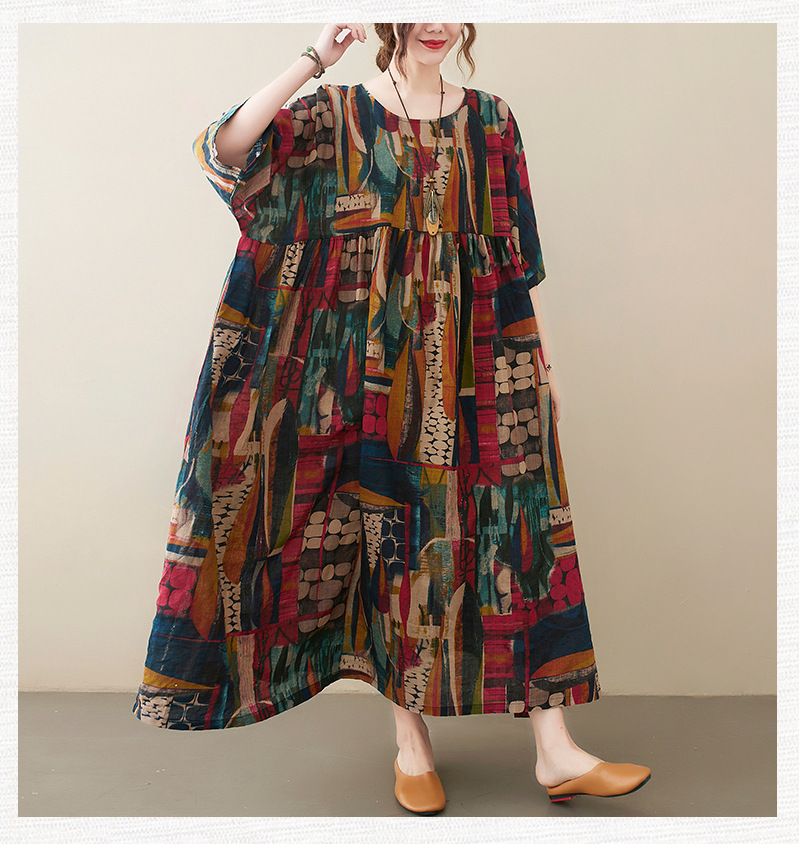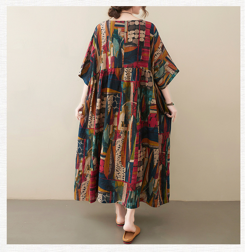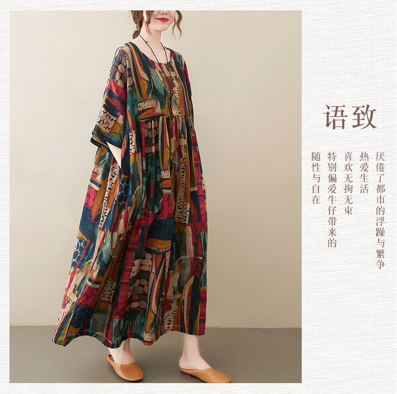 Real shot 2025 summer new literary large size loose printing round neck short sleeve dress women's long dress 6040 #