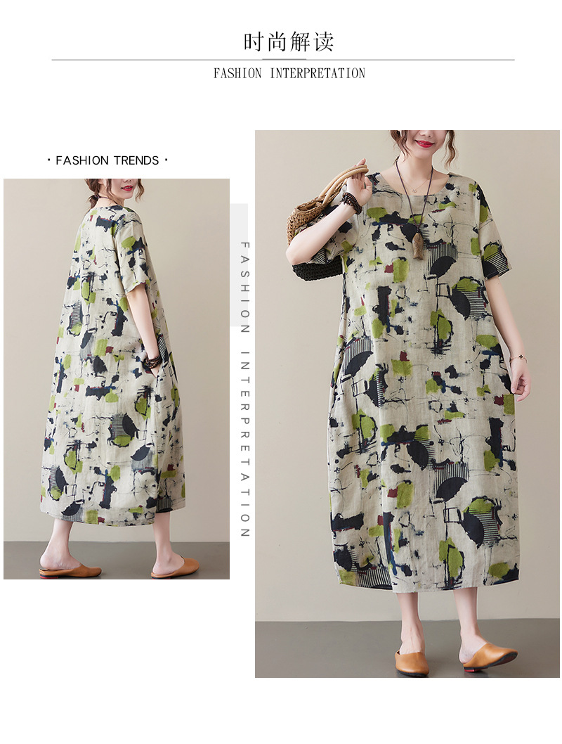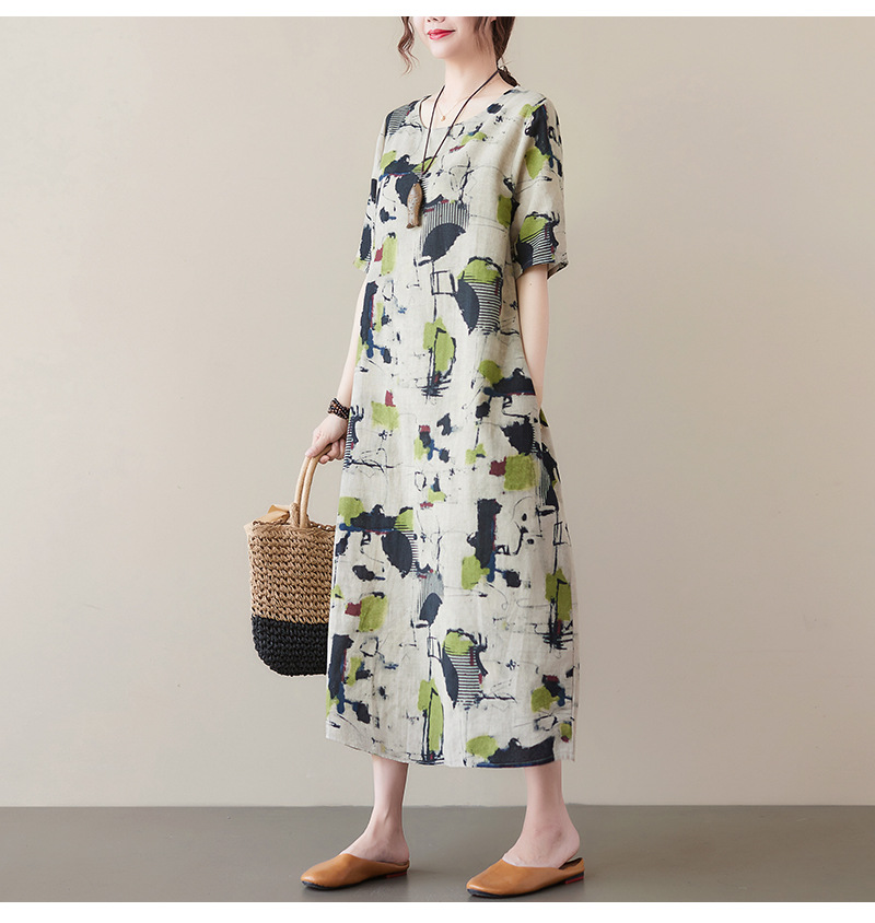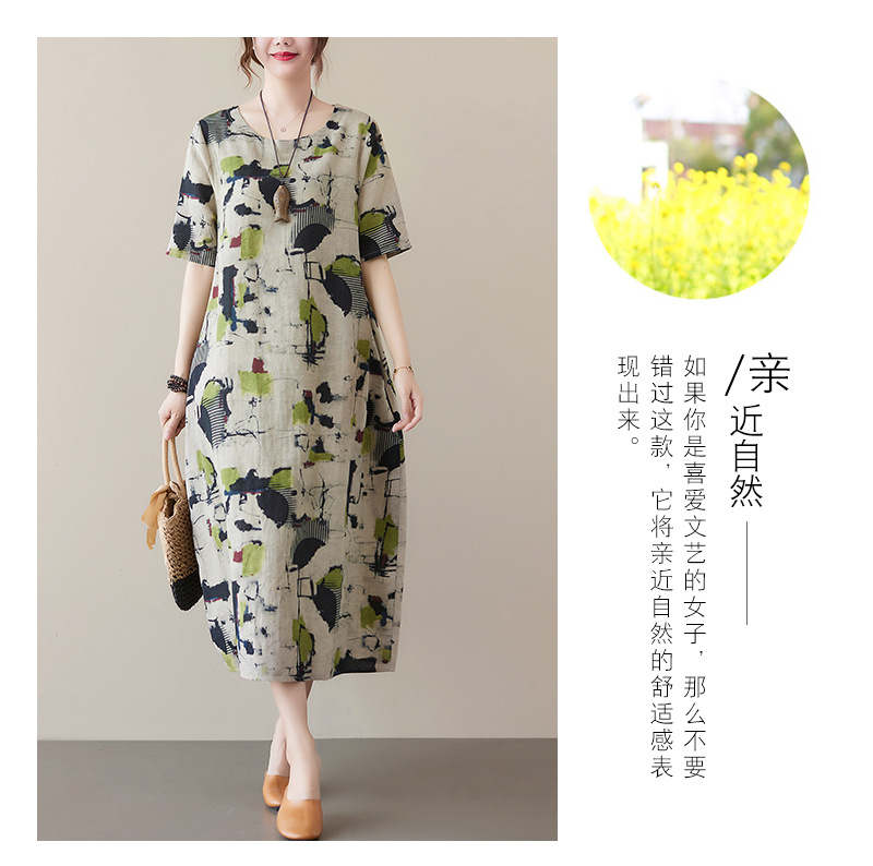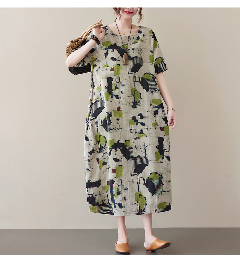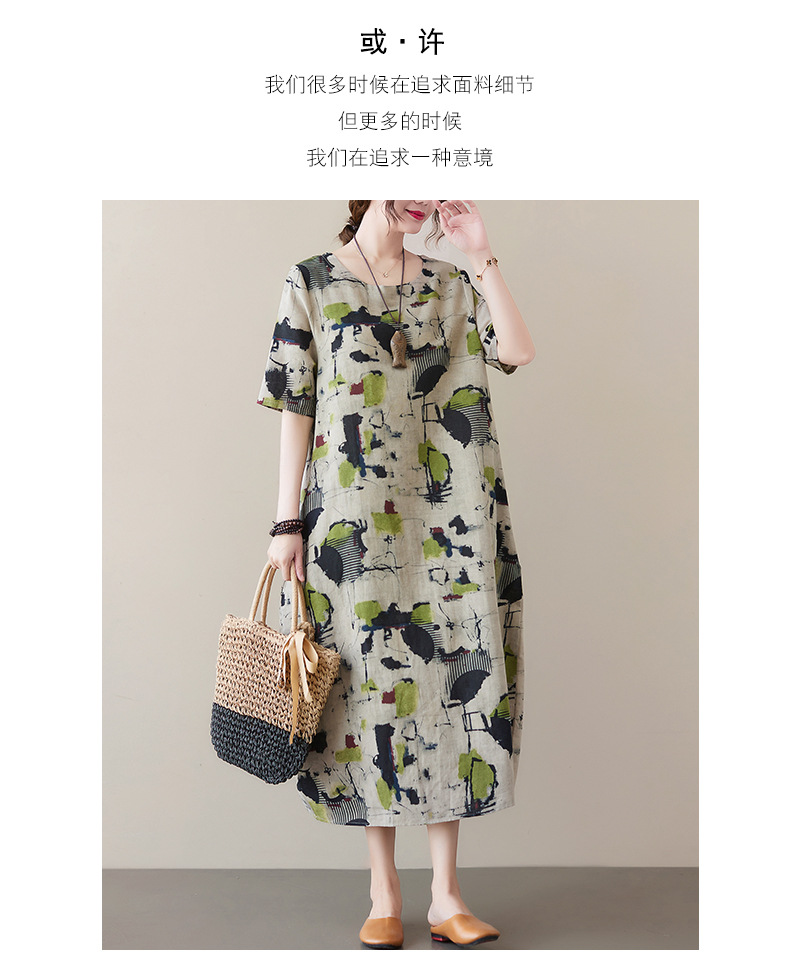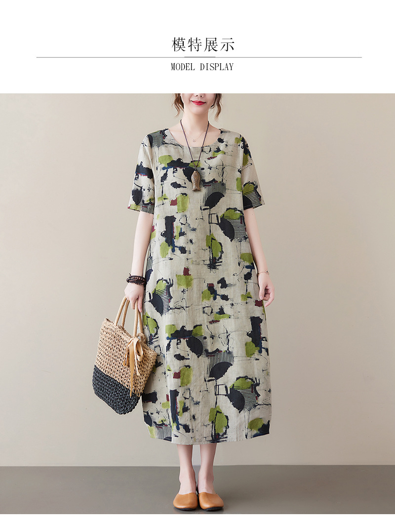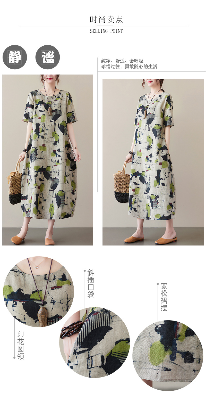 Real shot 2025 summer new literary loose cotton and linen printing round neck short-sleeved dress women's medium and long #8363