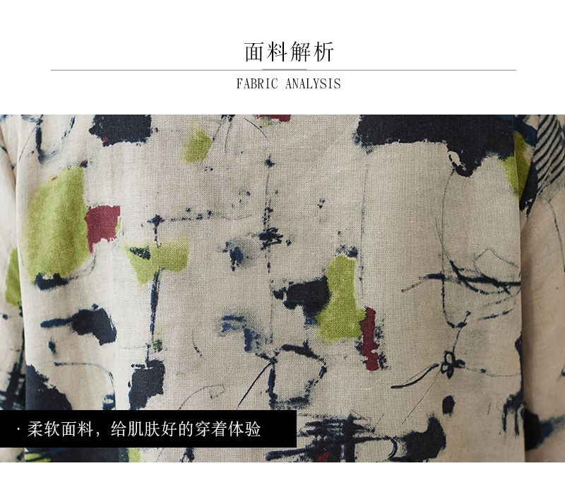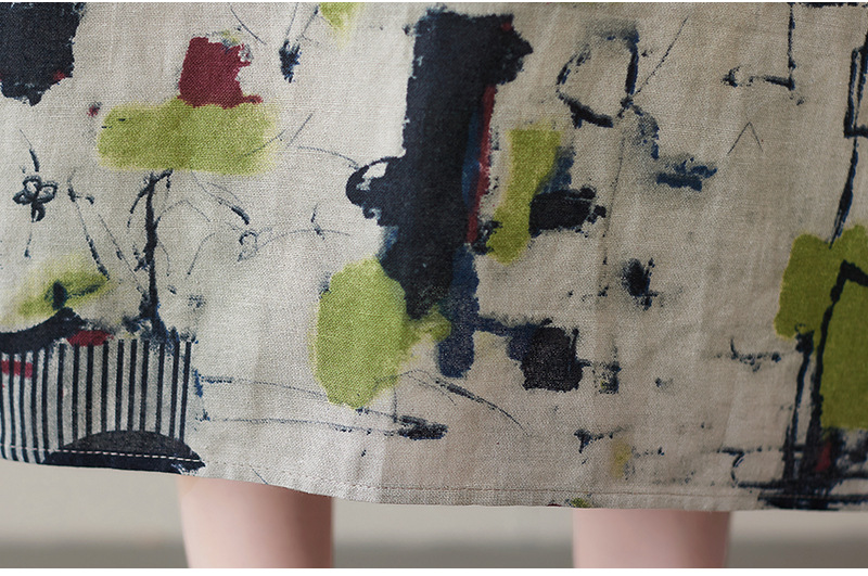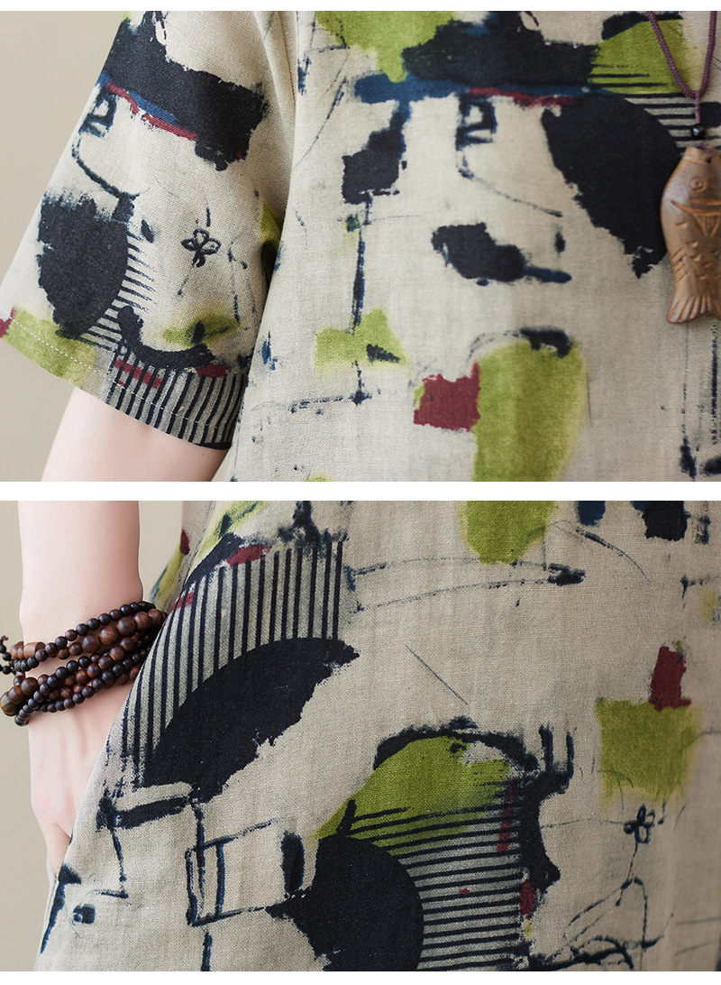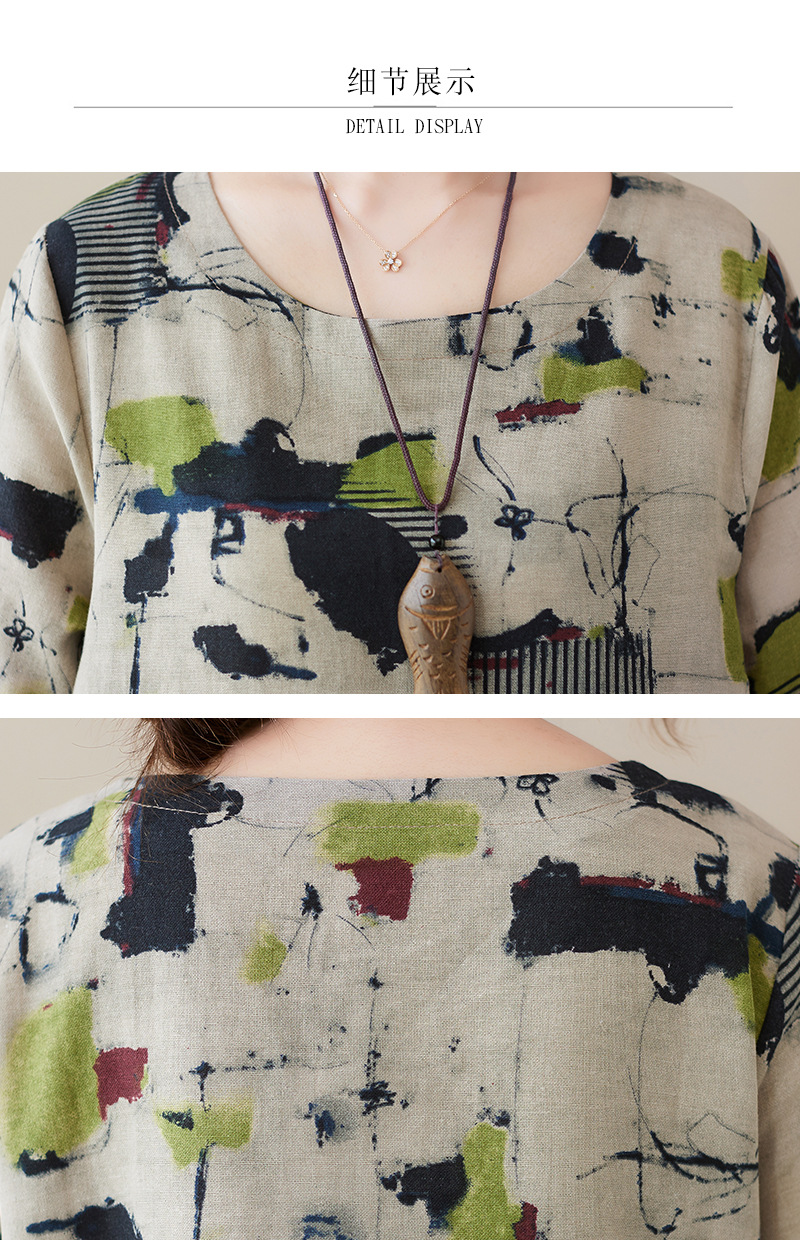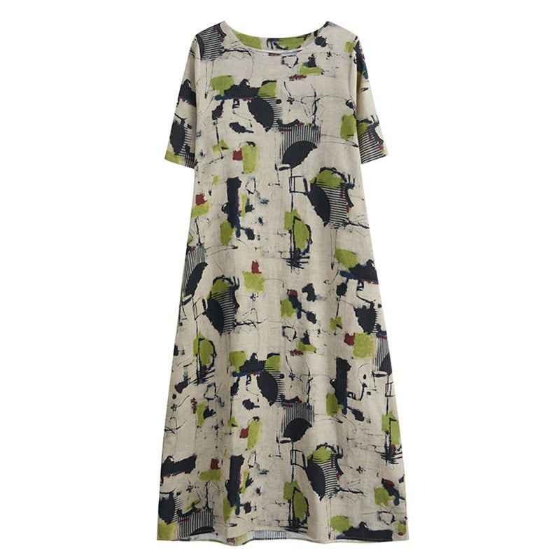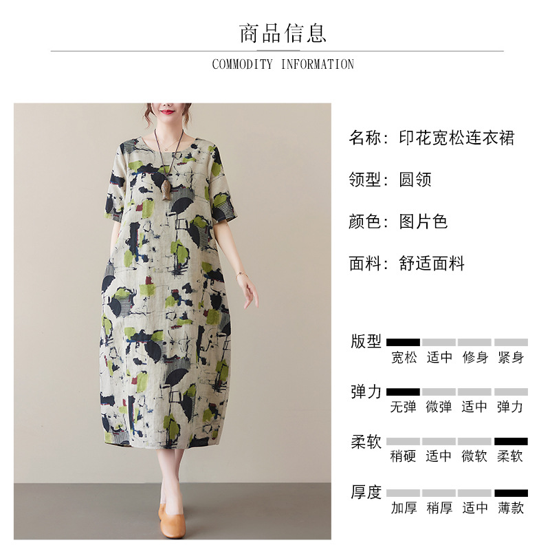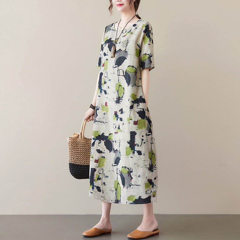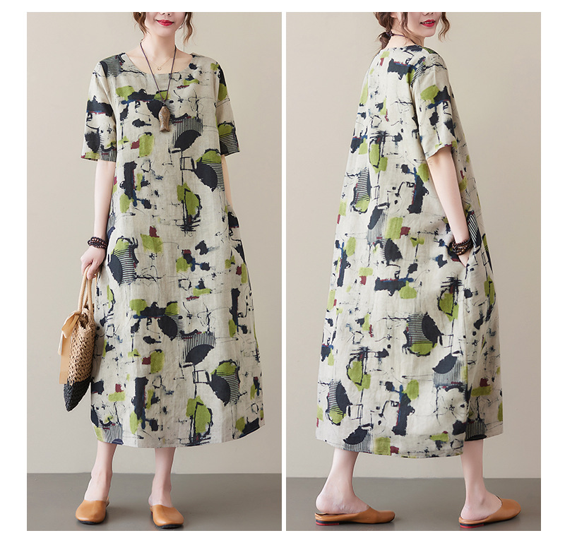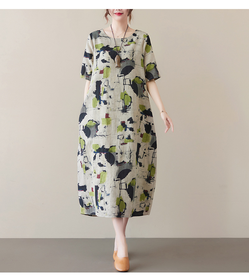 Real shot 2025 summer new literary loose cotton and linen printing round neck short-sleeved dress women's medium and long #8363