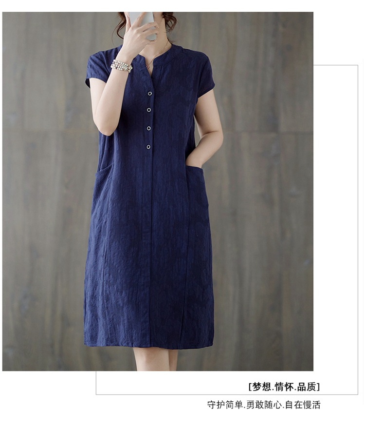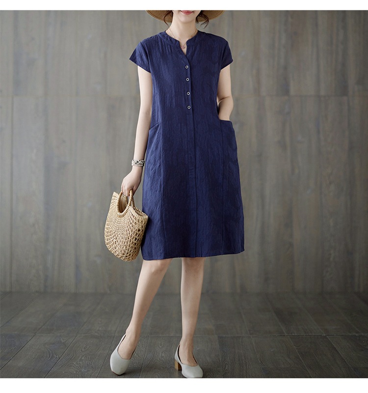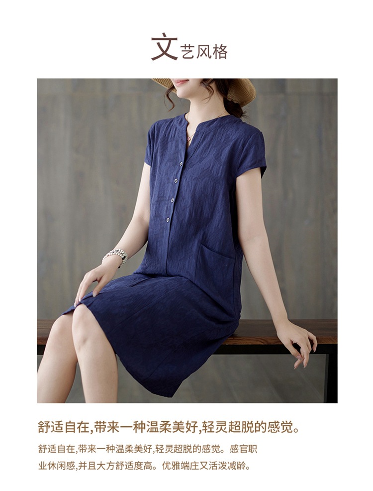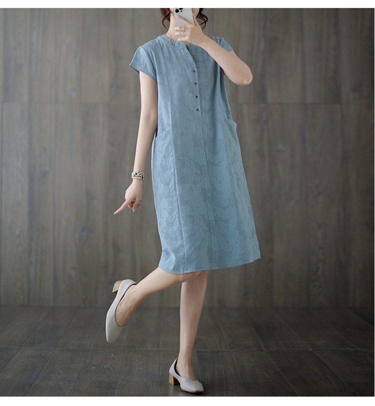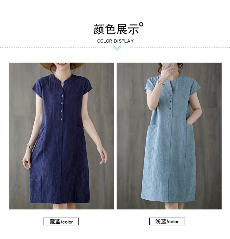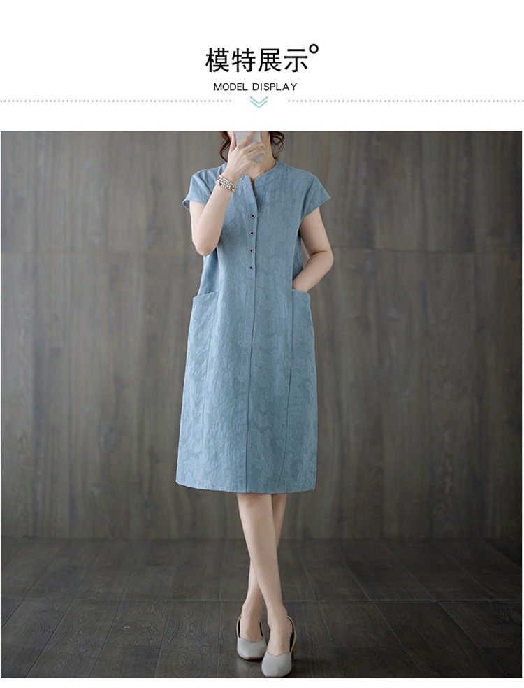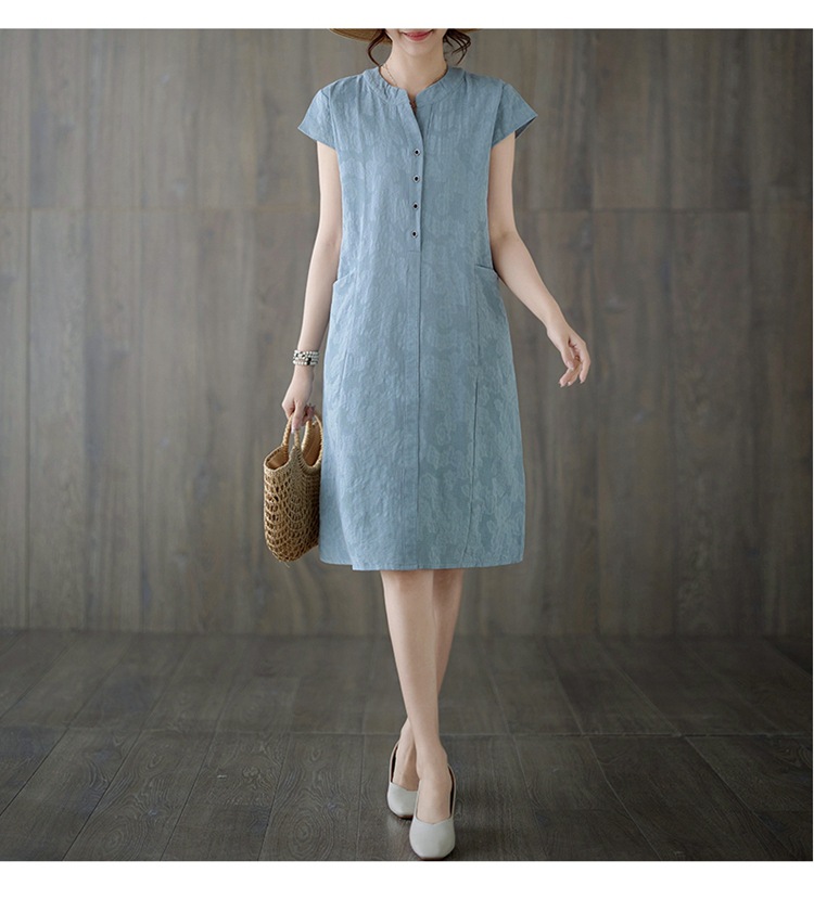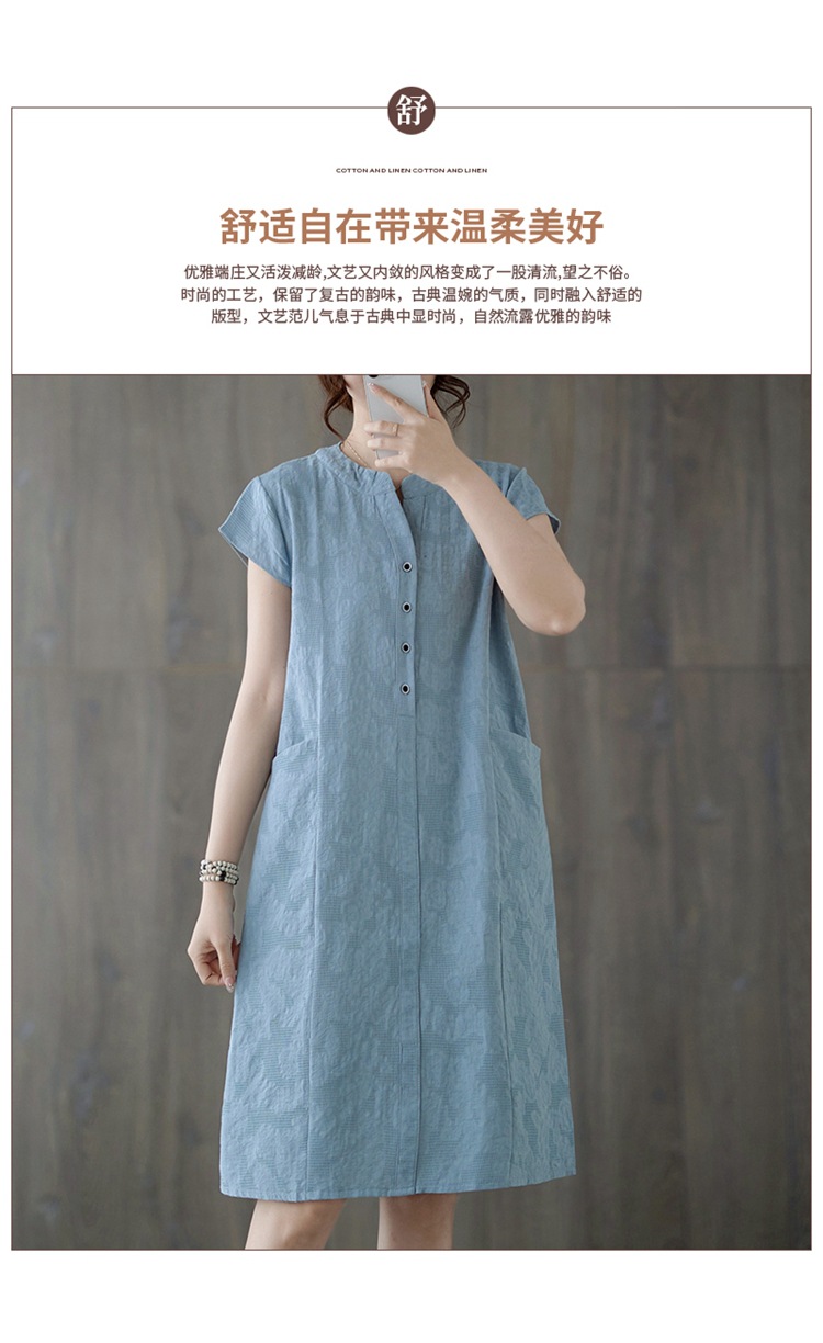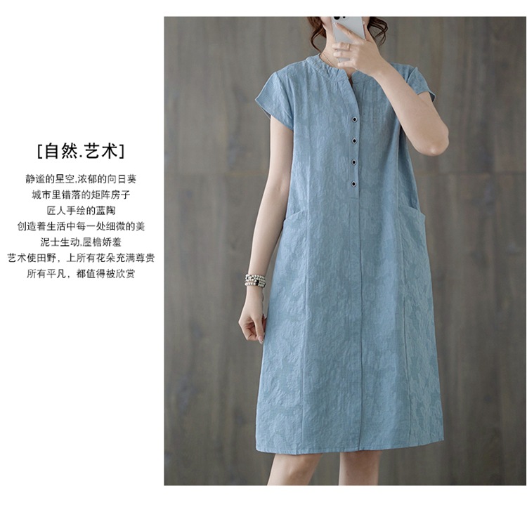 Real shot 2025 summer new literary loose jacquard cotton and linen stand-up collar short-sleeved dress women's medium and long #9658