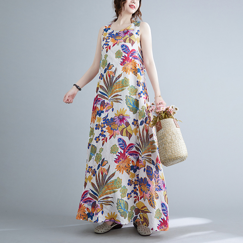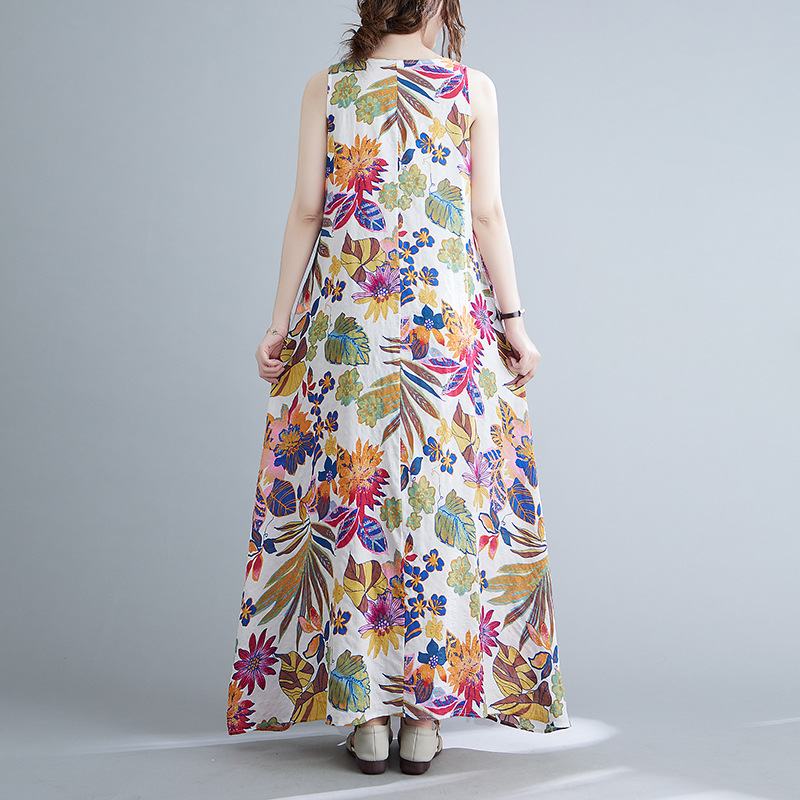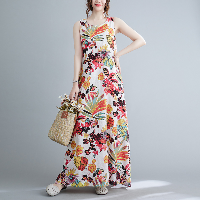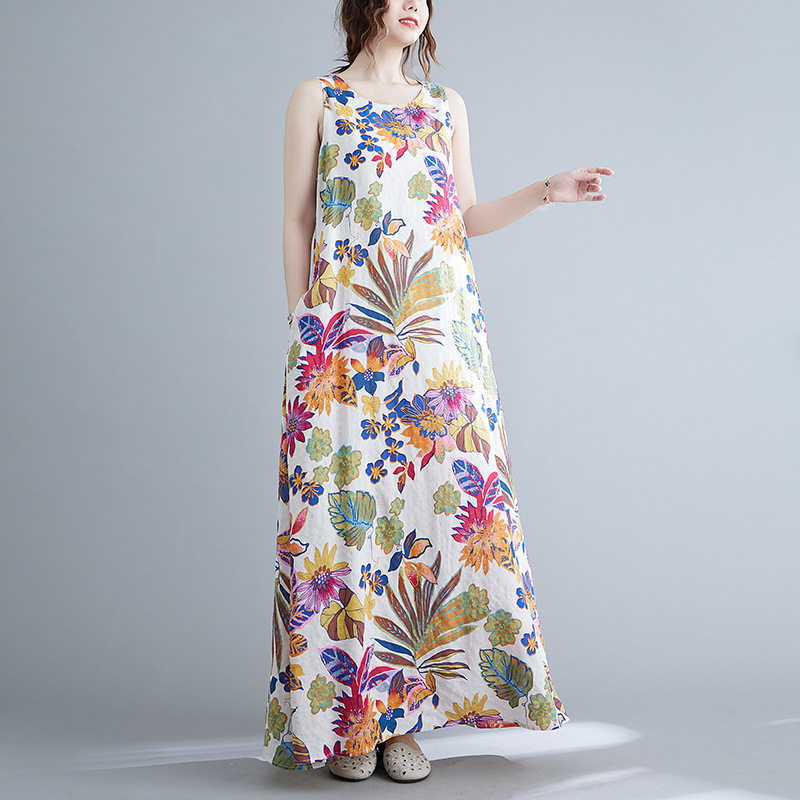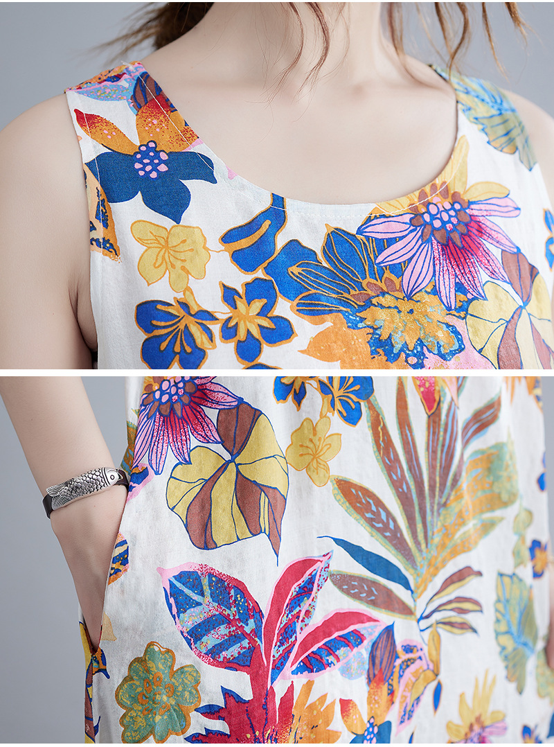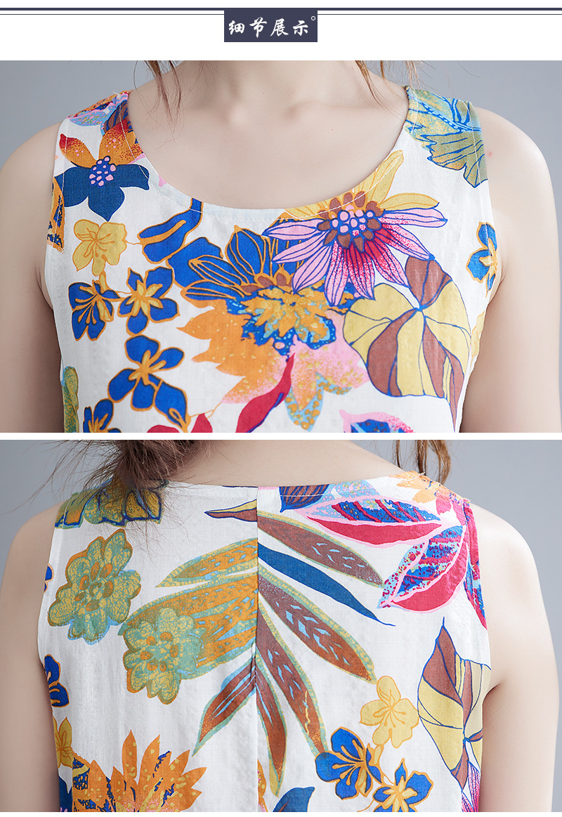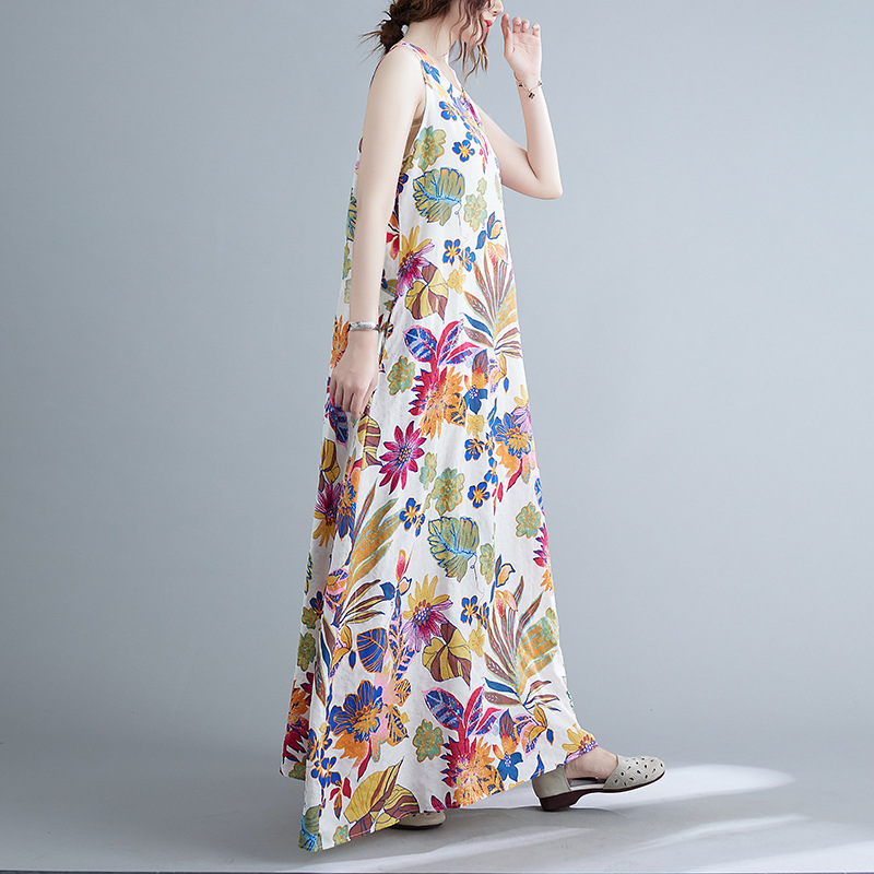 Real shot 2025 summer new literary loose printing sleeveless cotton and linen dress women's vest suspender skirt 9608 #