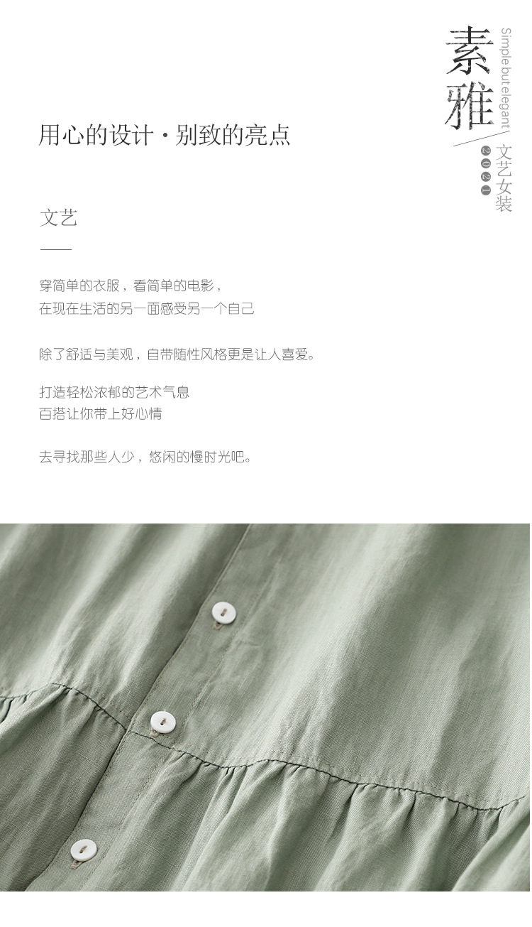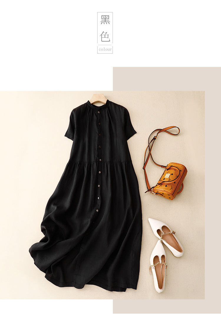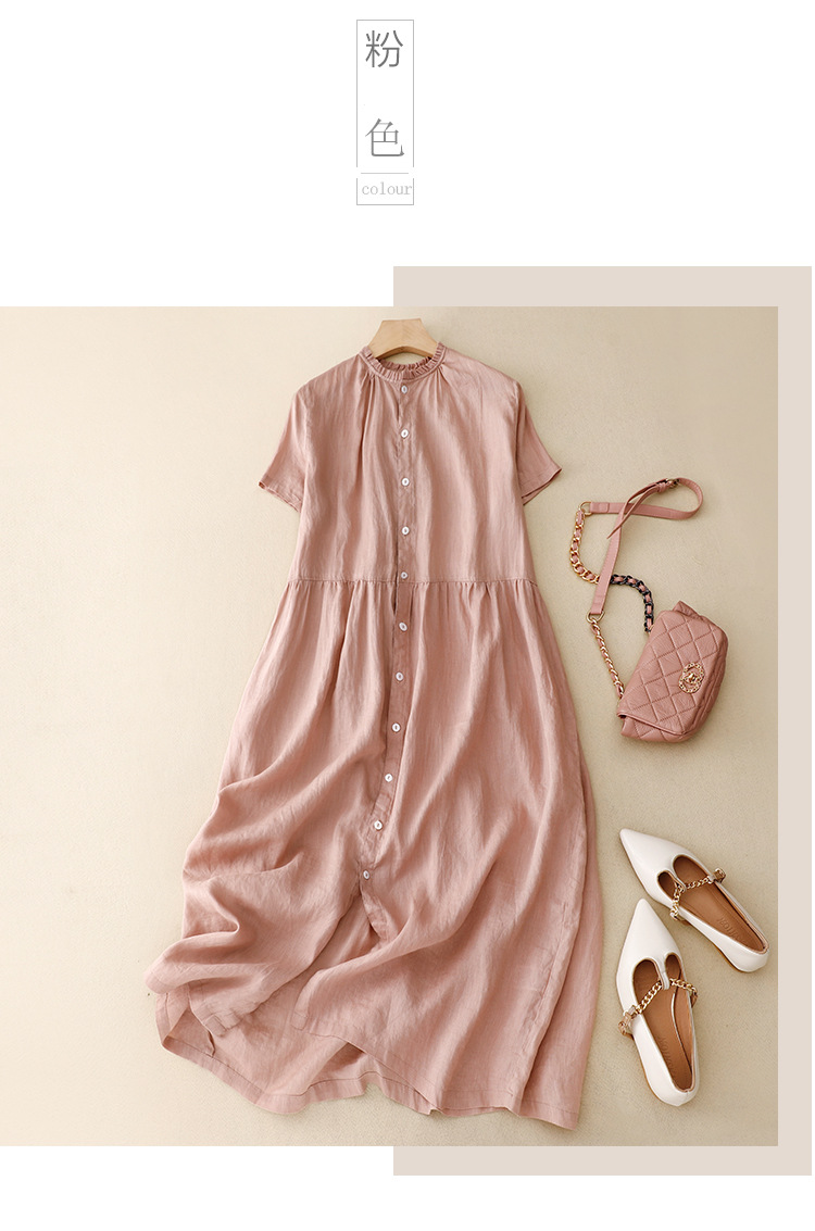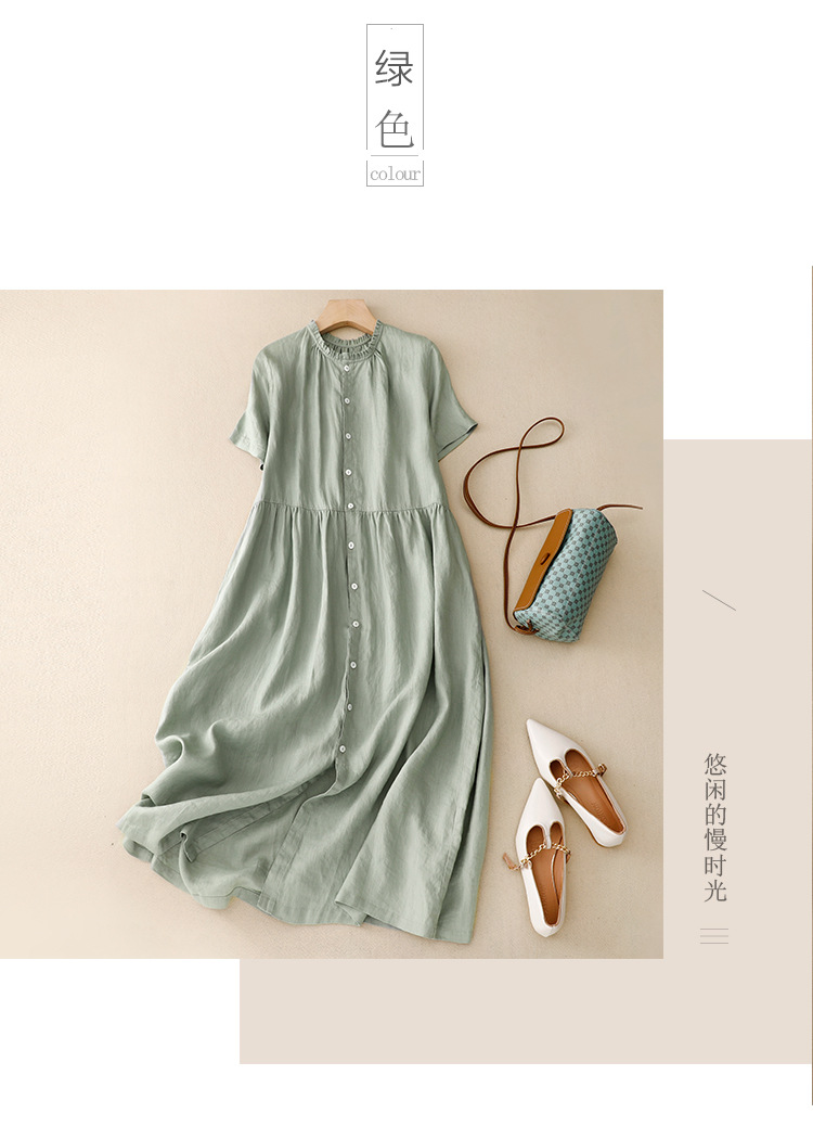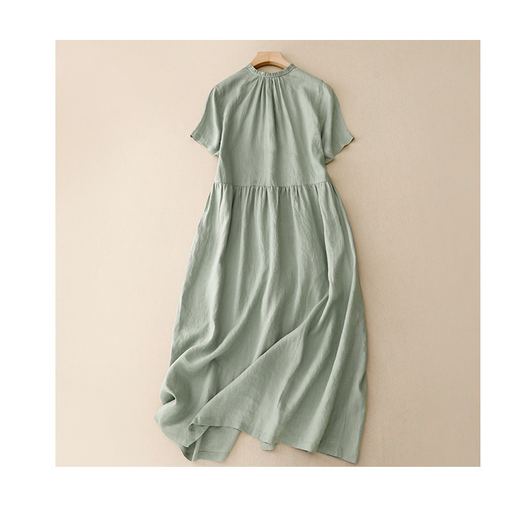 Real shot 2025 summer new literary loose solid color cotton and linen round neck short-sleeved dress women's medium and long #8789
