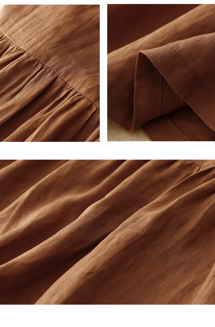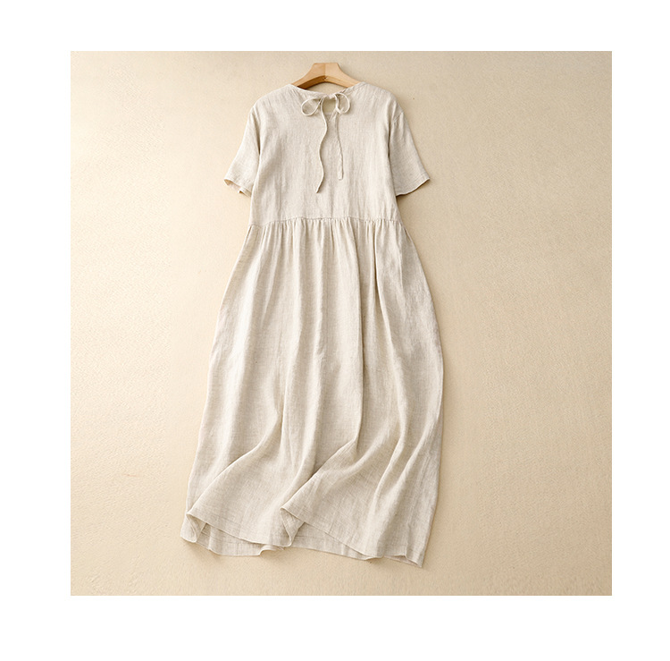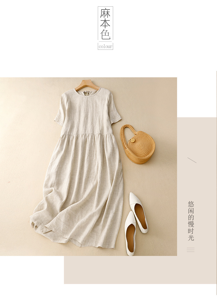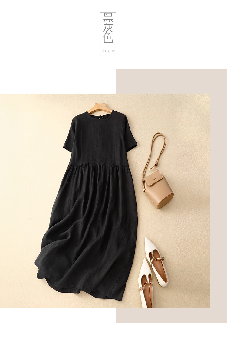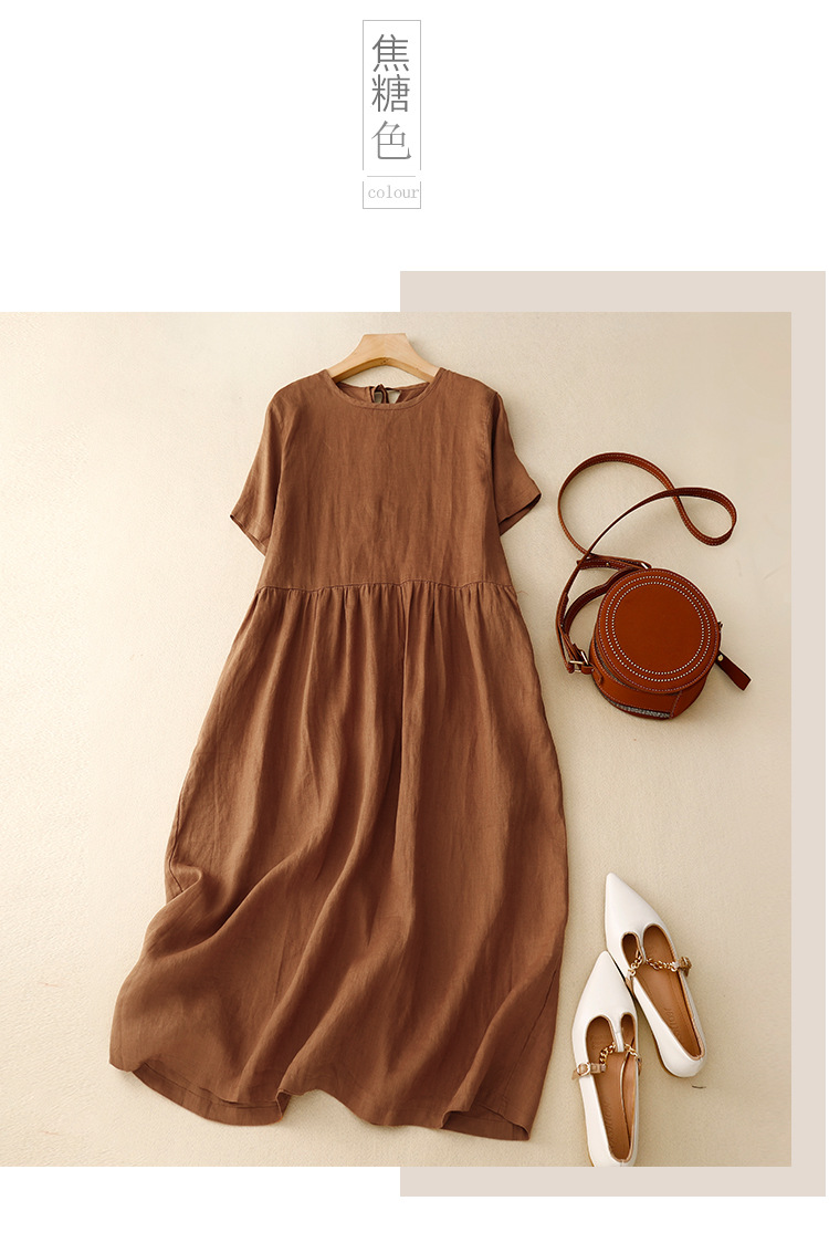 Real shot 2025 summer new literary loose solid color cotton and linen round neck short-sleeved dress women's medium and long #8802