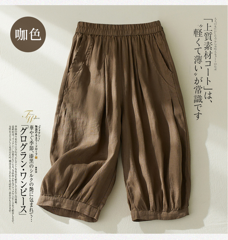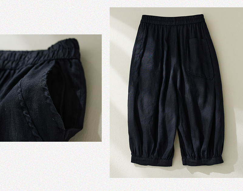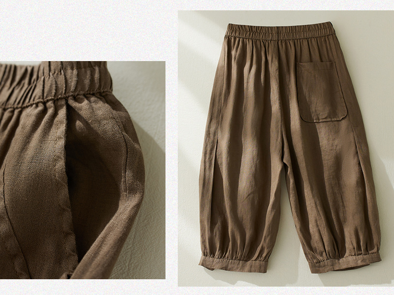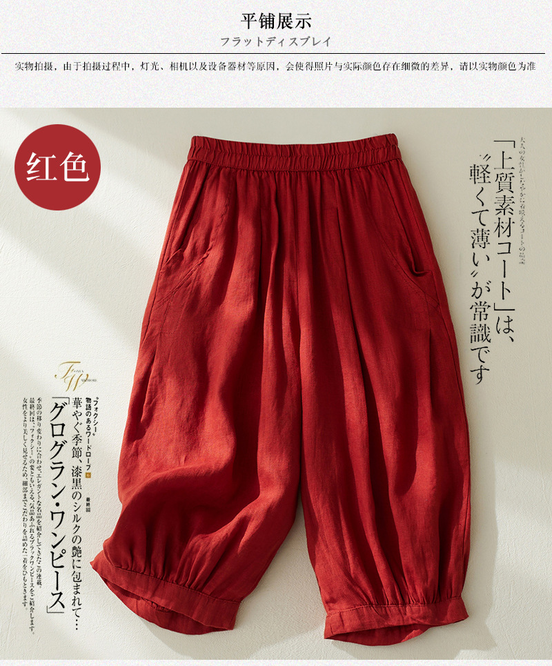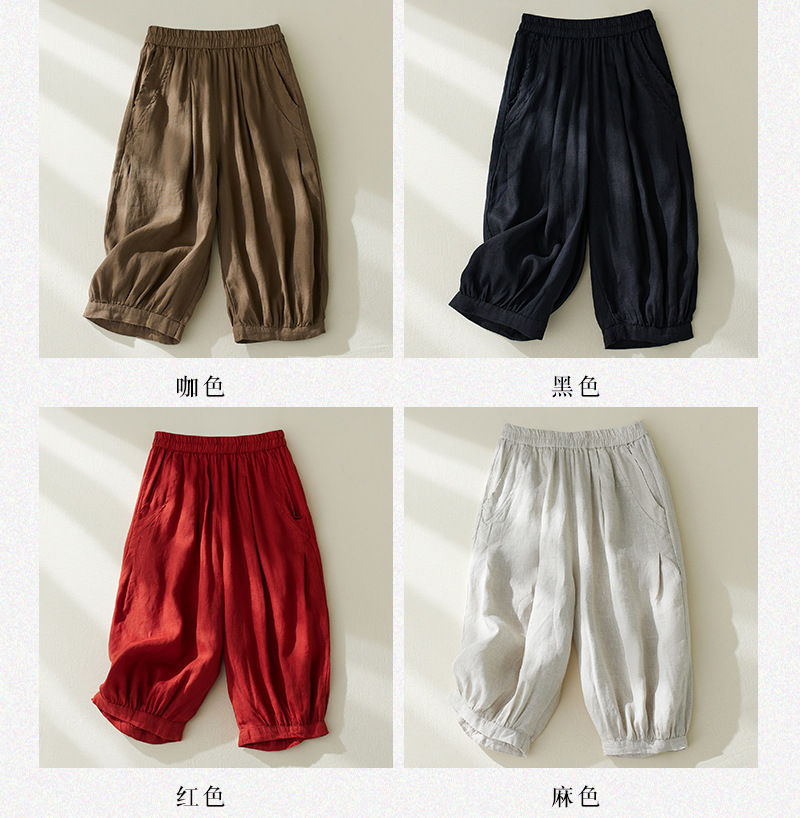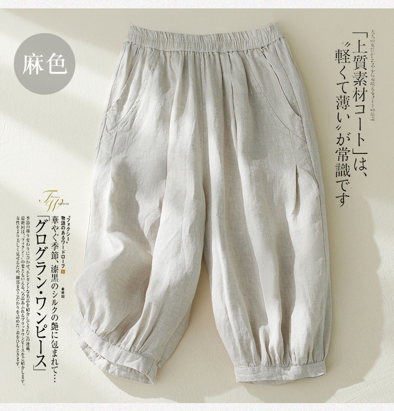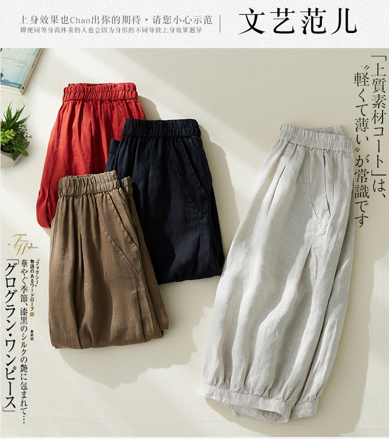 Real shot 2025 summer new retro literary loose cotton and linen elastic waist casual tied feet Harlan five-point pants women