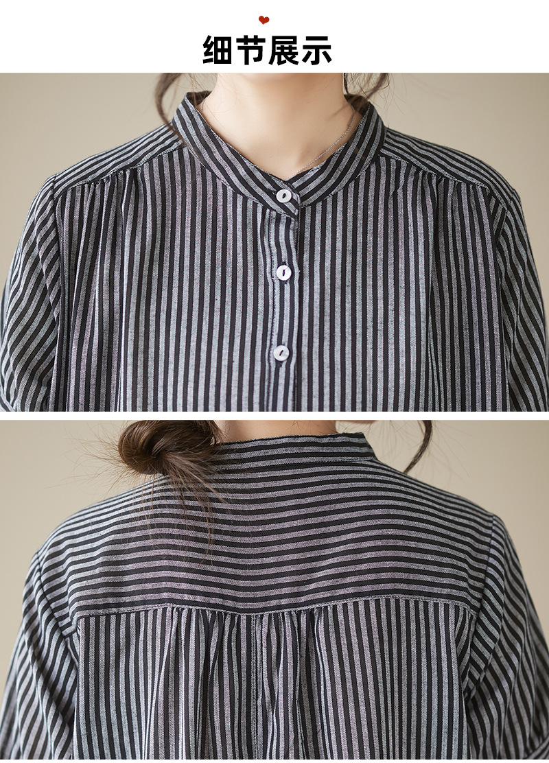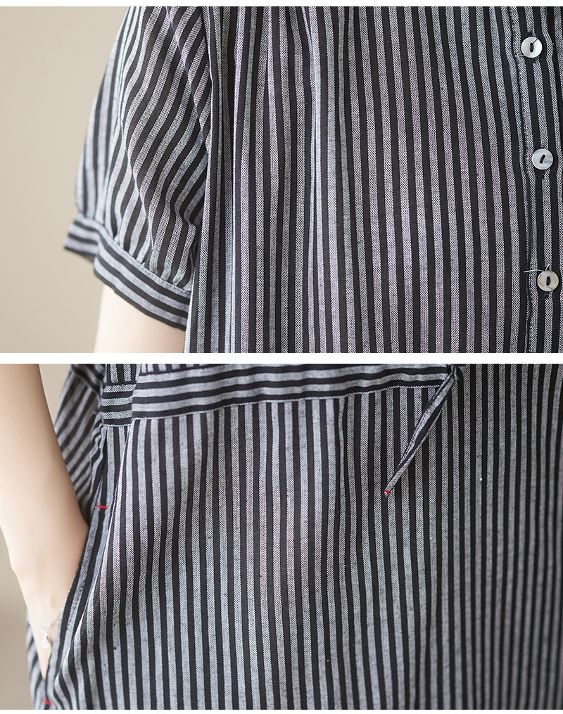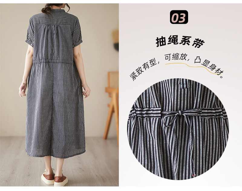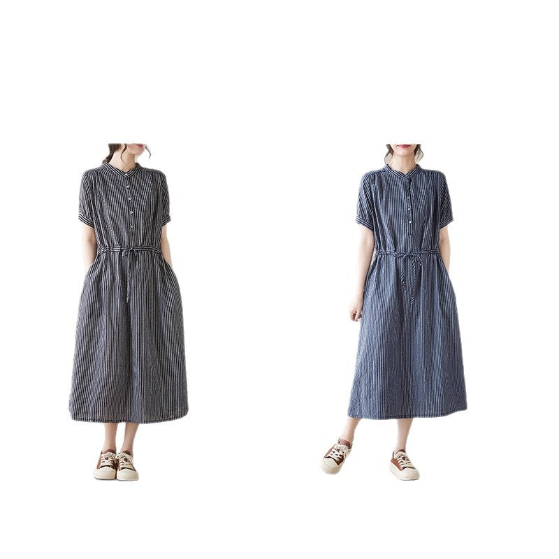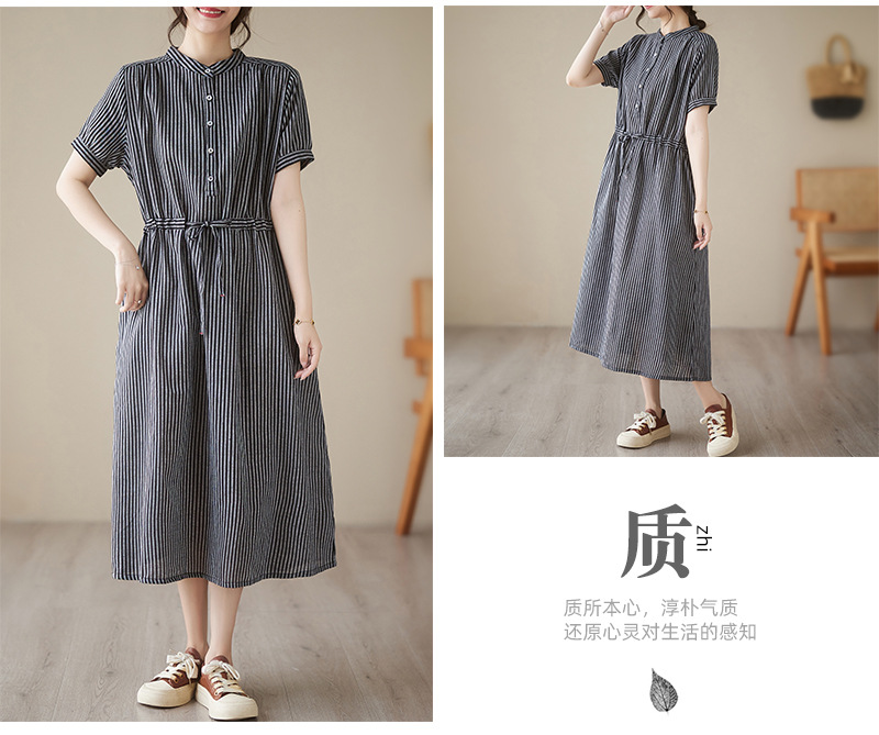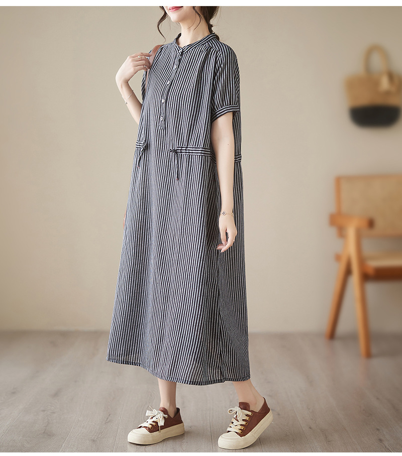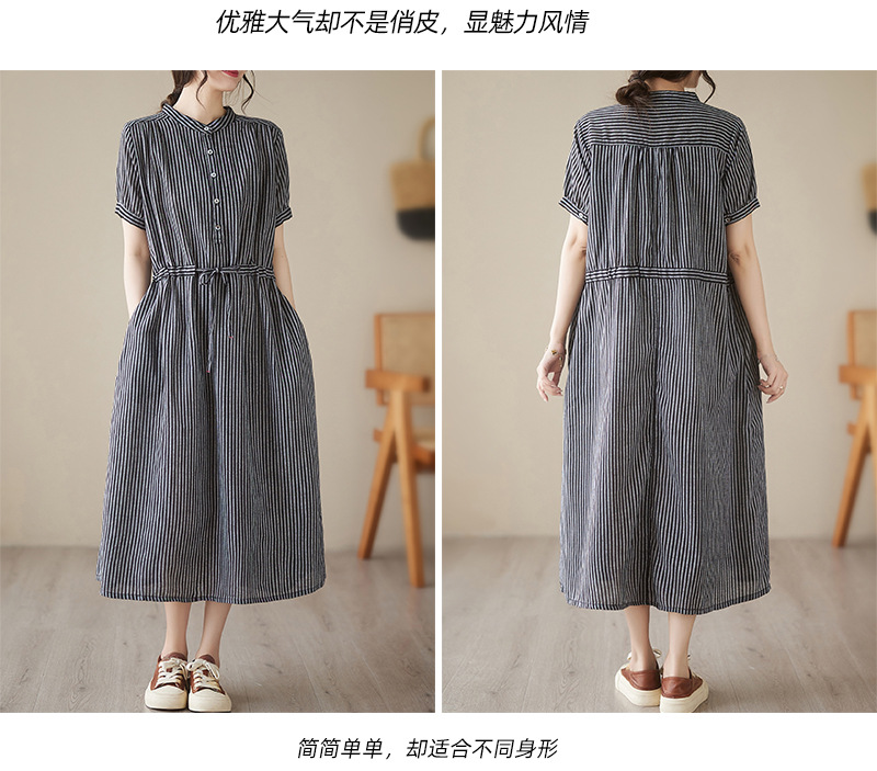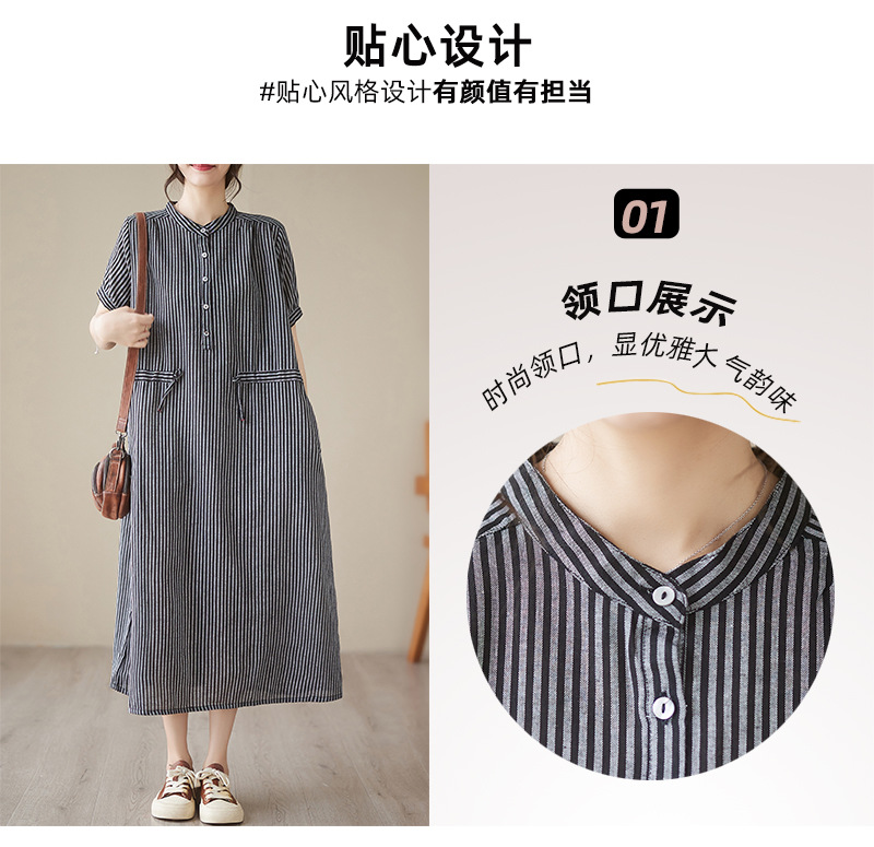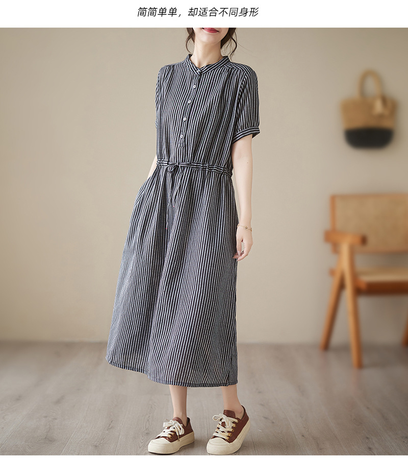 Real shot 2025 summer new simple literary loose and thin small stand-up collar medium and long dress women