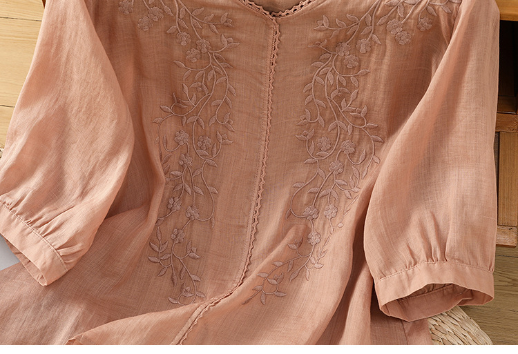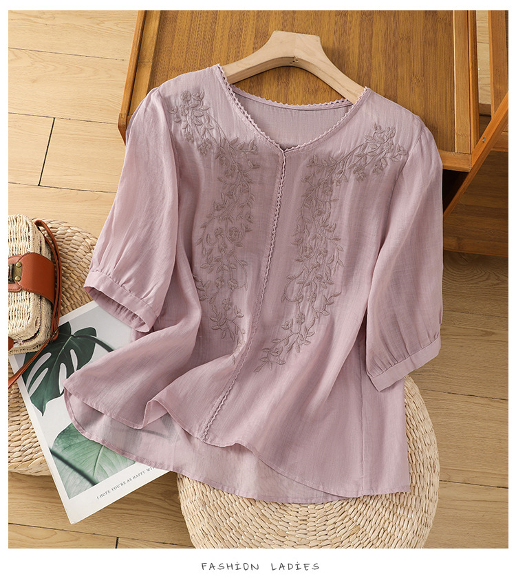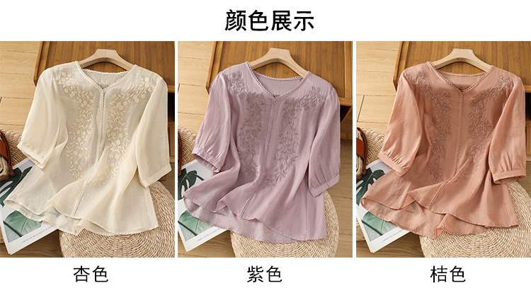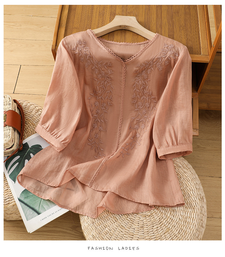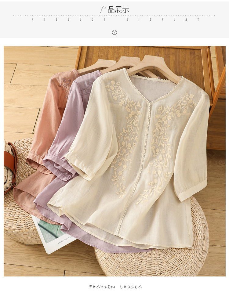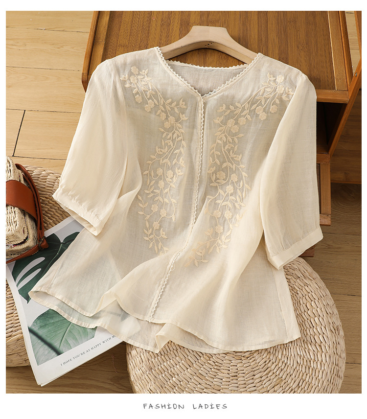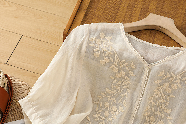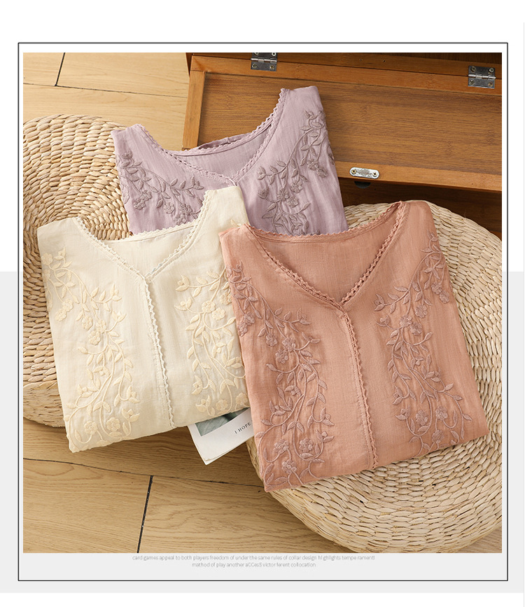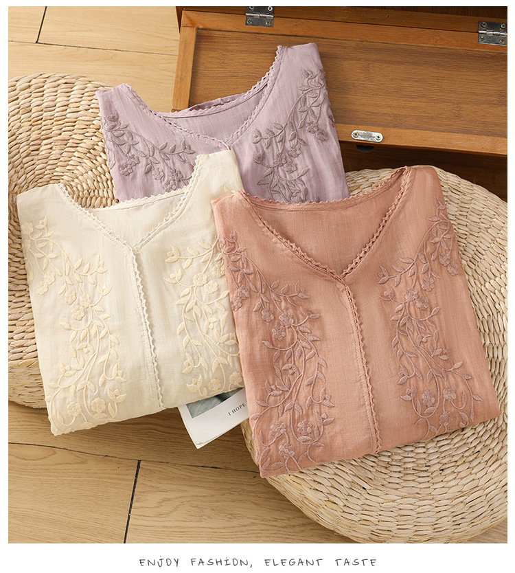 Real shot 2025 summer thin cotton and linen embroidery literary loose V-neck T-shirt shirt top women's clothing