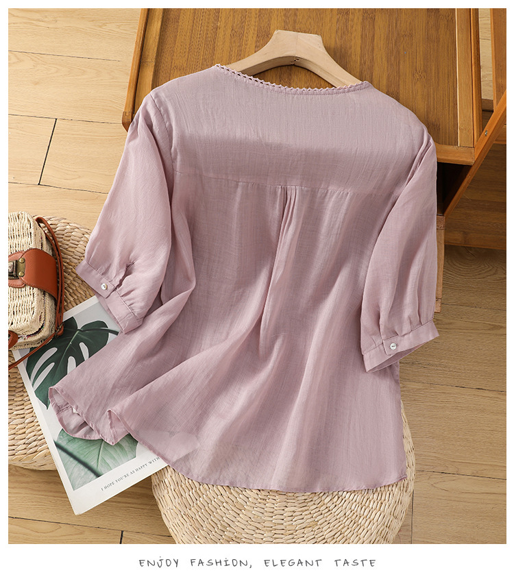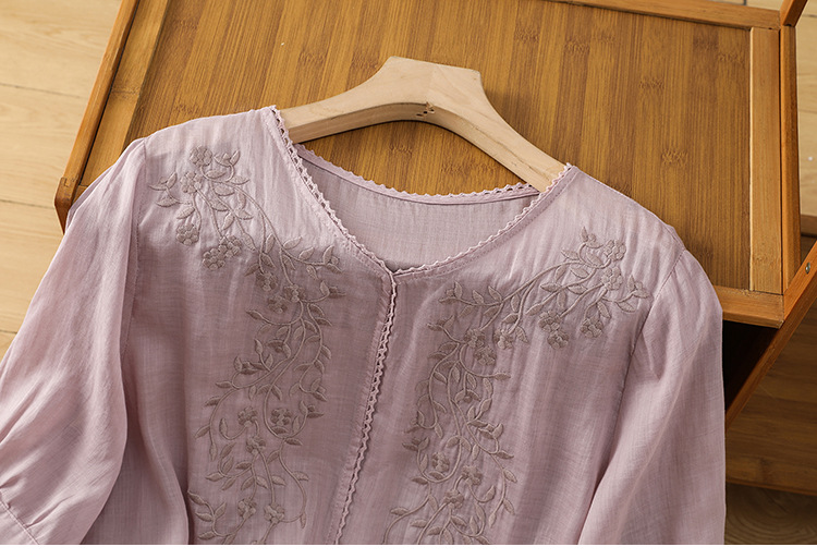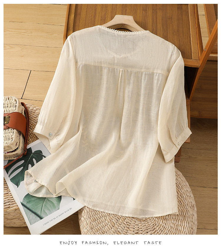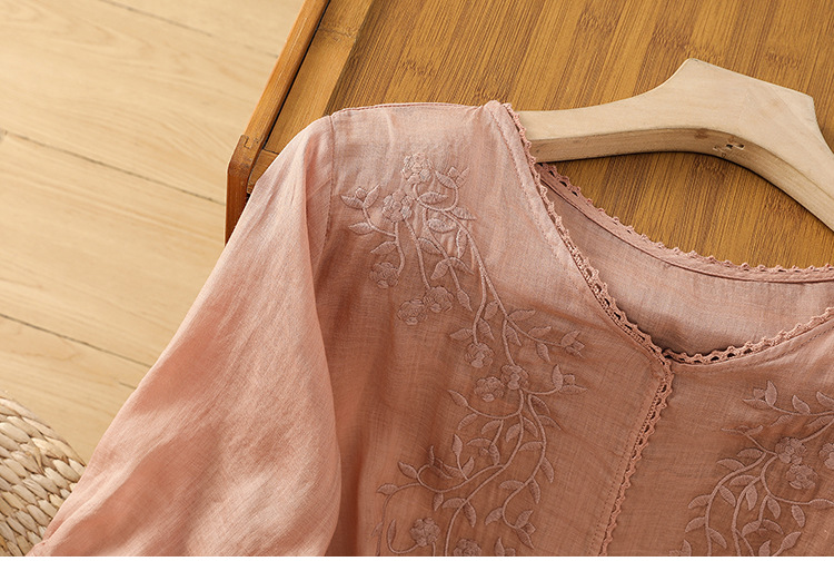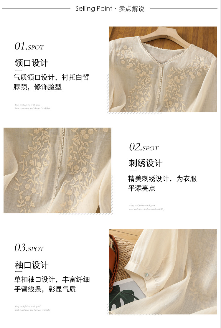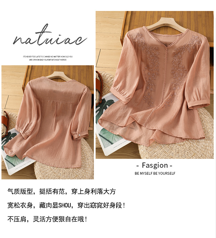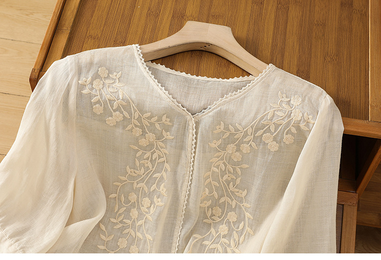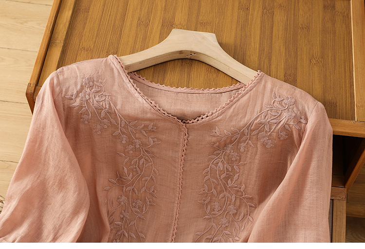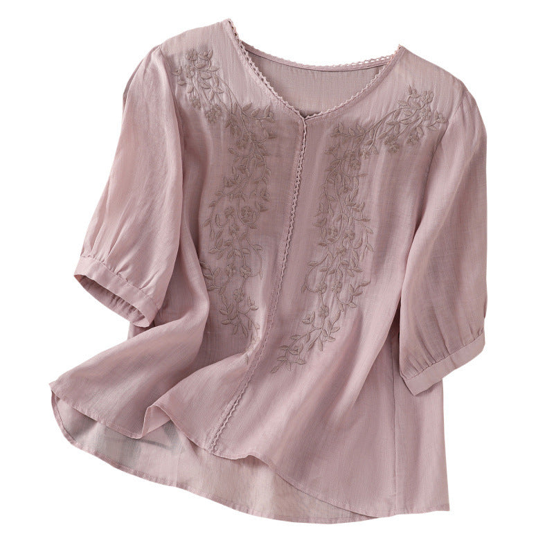 Real shot 2025 summer thin cotton and linen embroidery literary loose V-neck T-shirt shirt top women's clothing