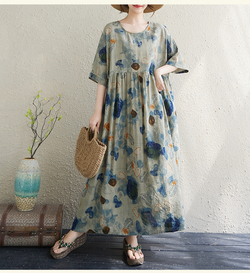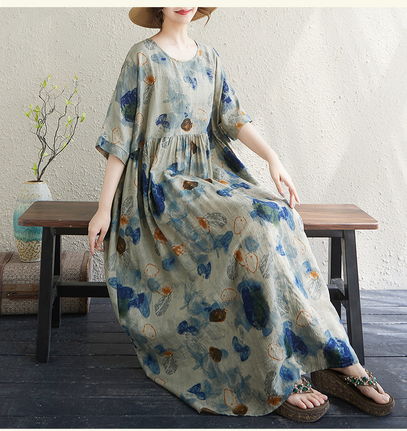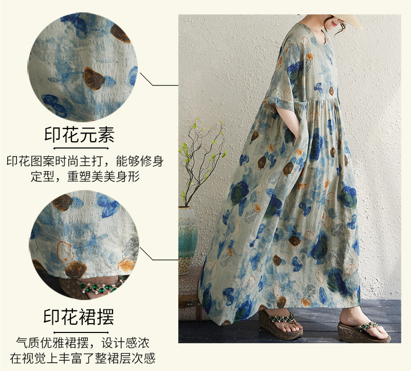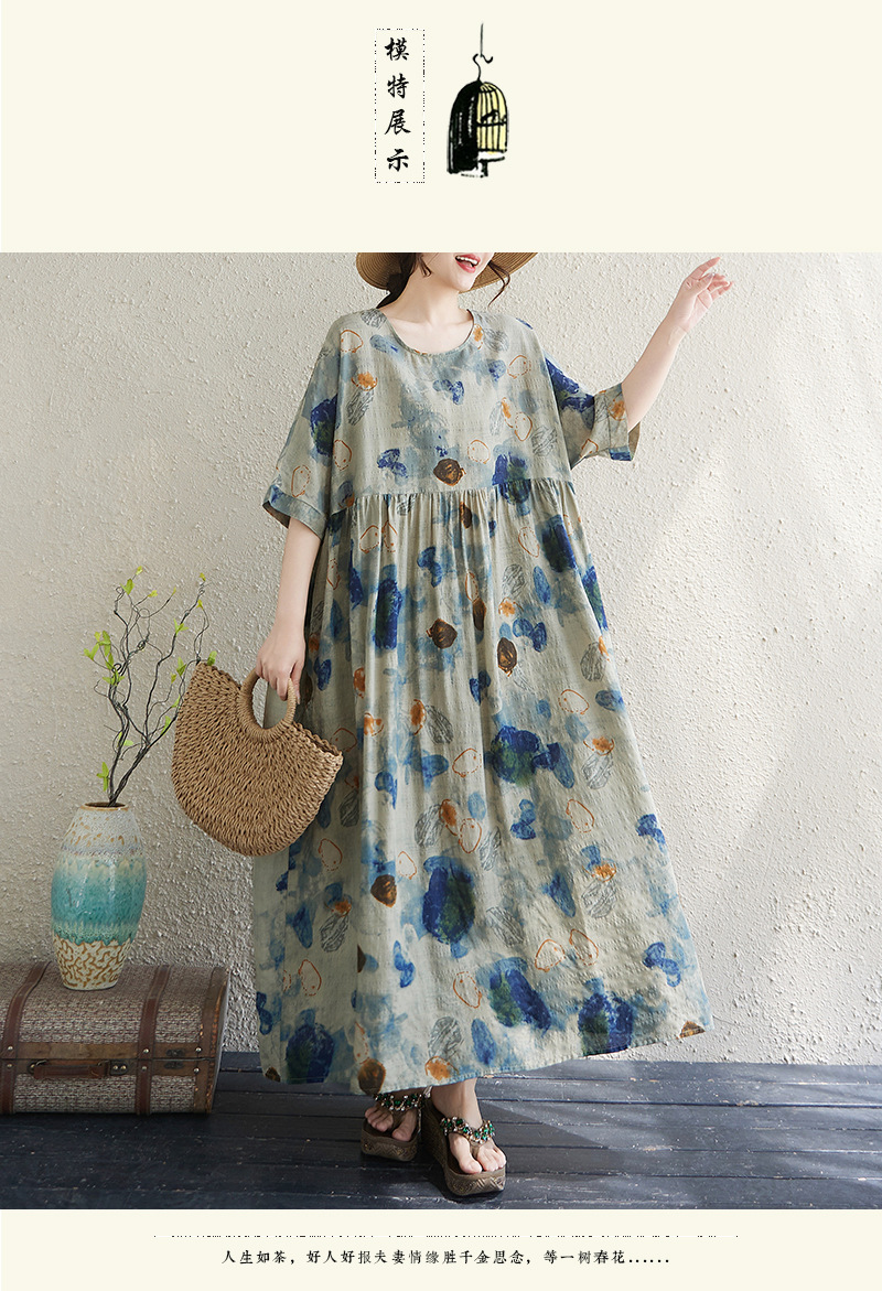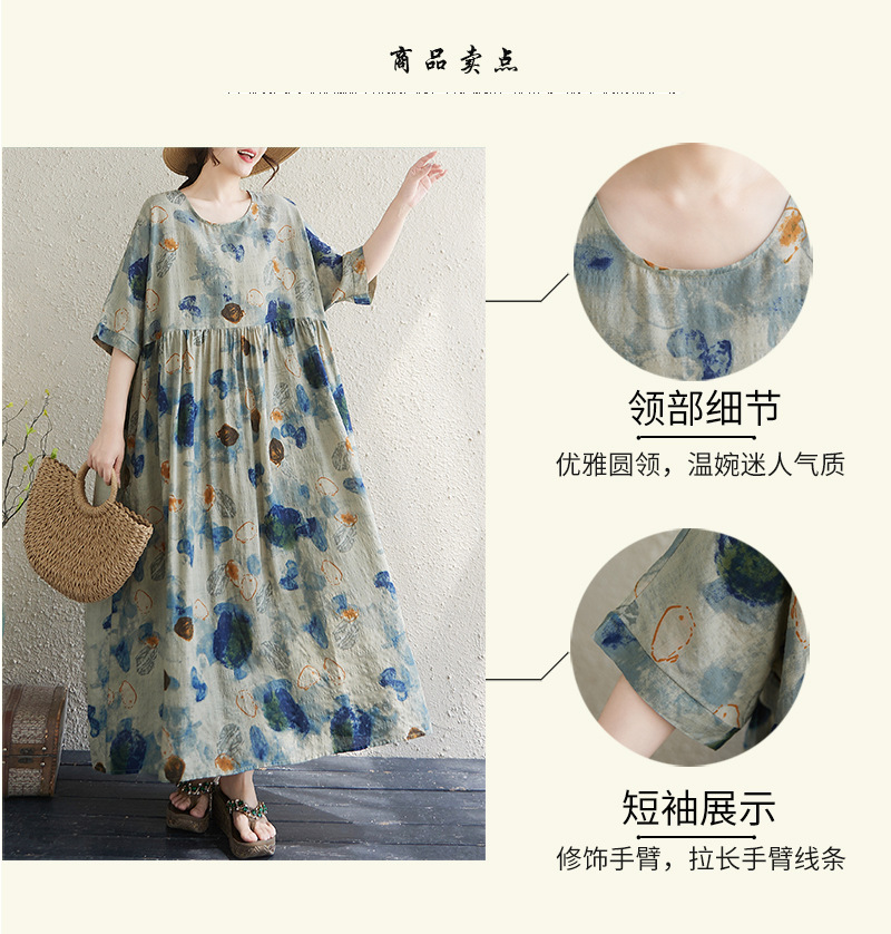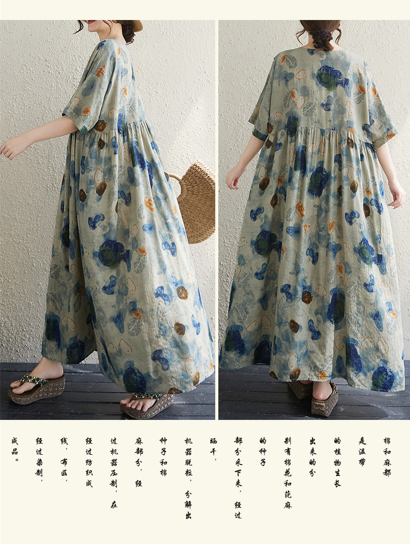 Real shot 2025 summer thin cotton and linen fat mm round neck short-sleeved vacation style loose and simple bohemian swing skirt
