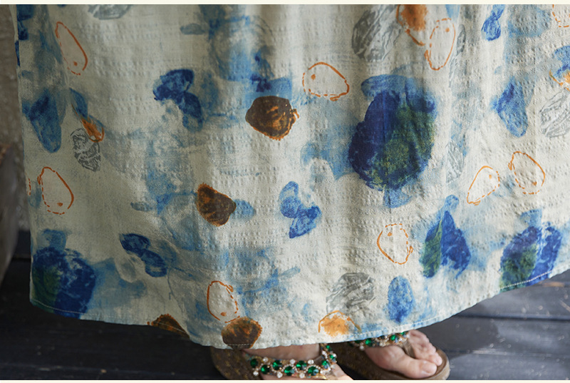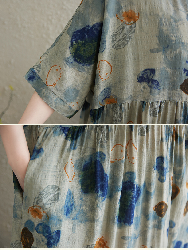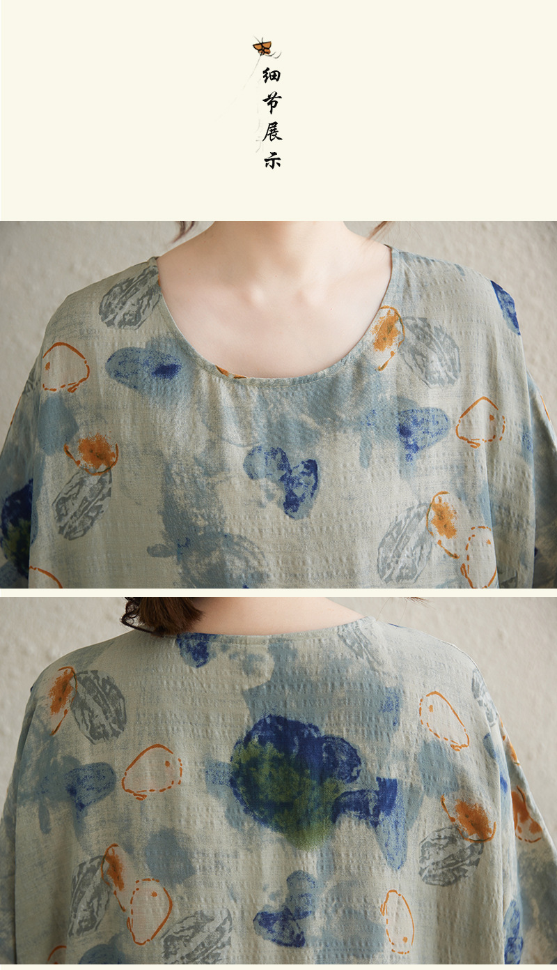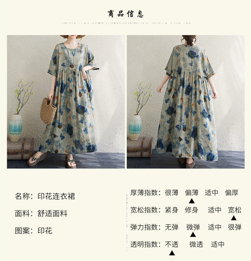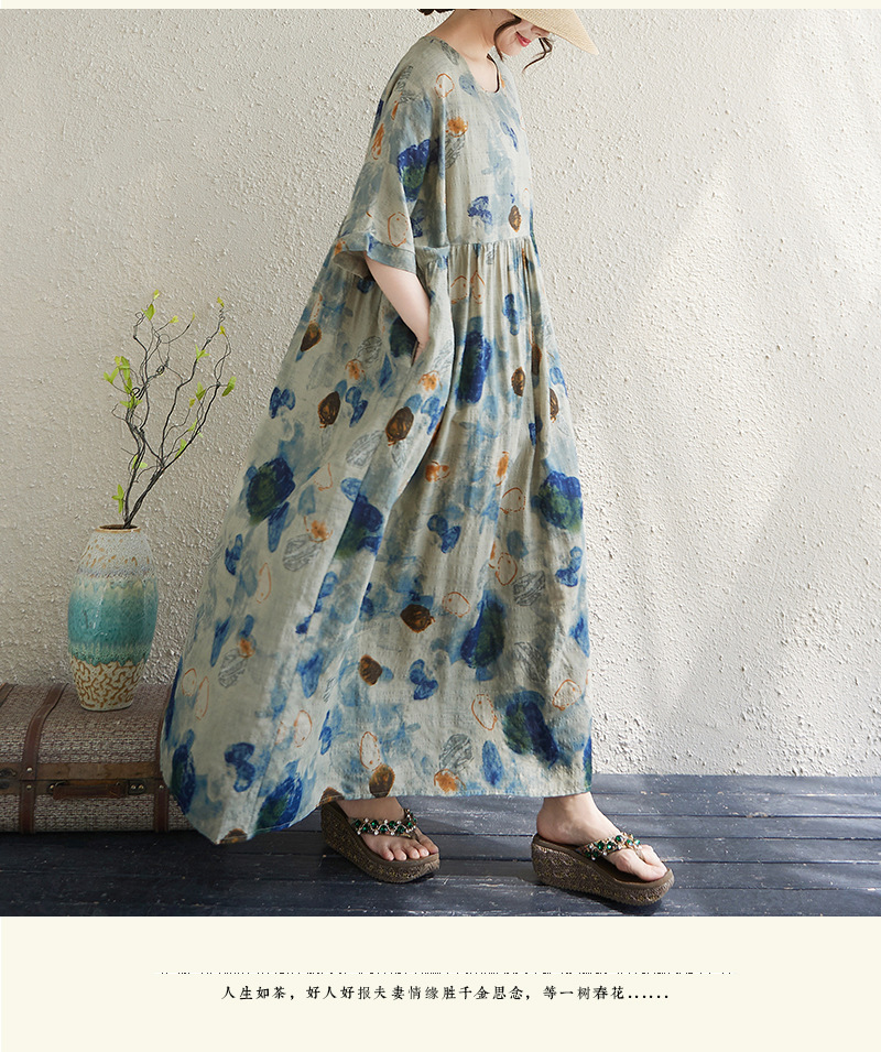 Real shot 2025 summer thin cotton and linen fat mm round neck short-sleeved vacation style loose and simple bohemian swing skirt