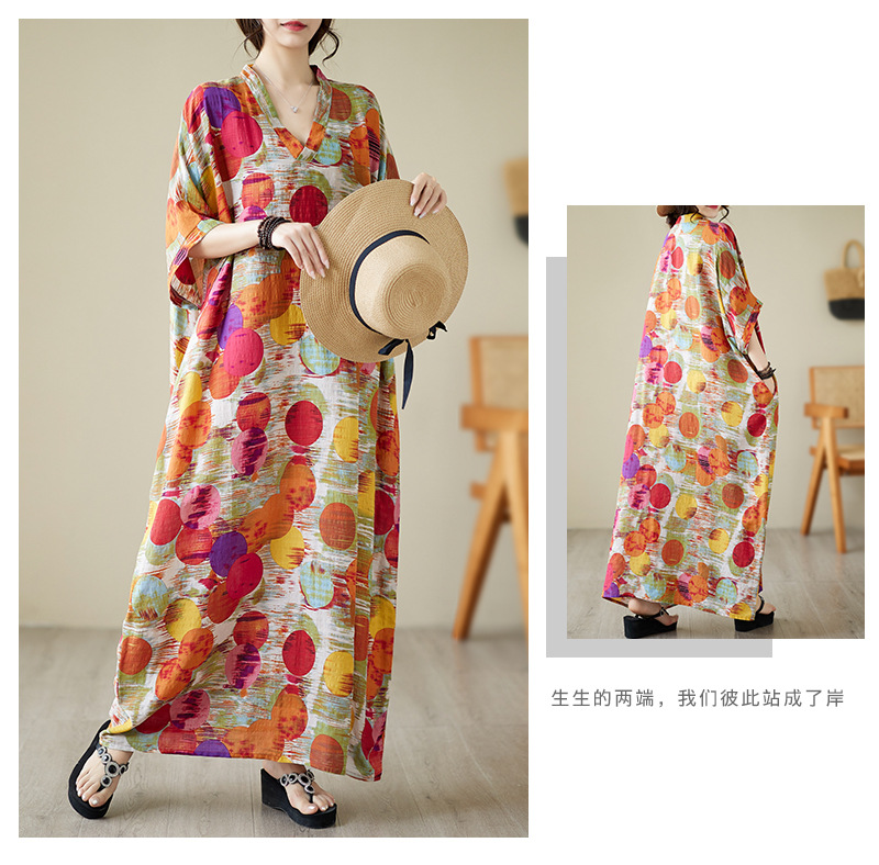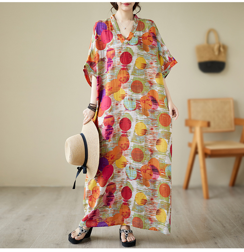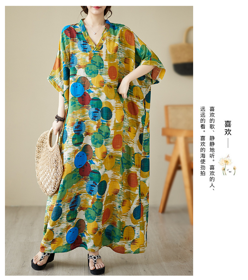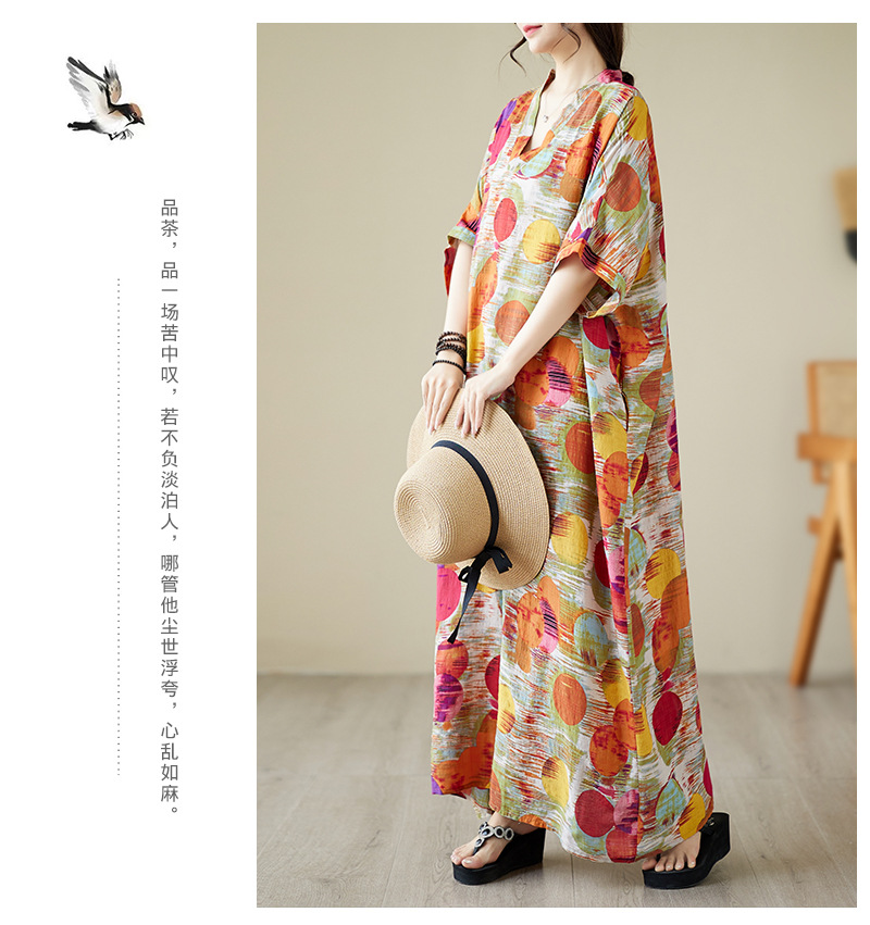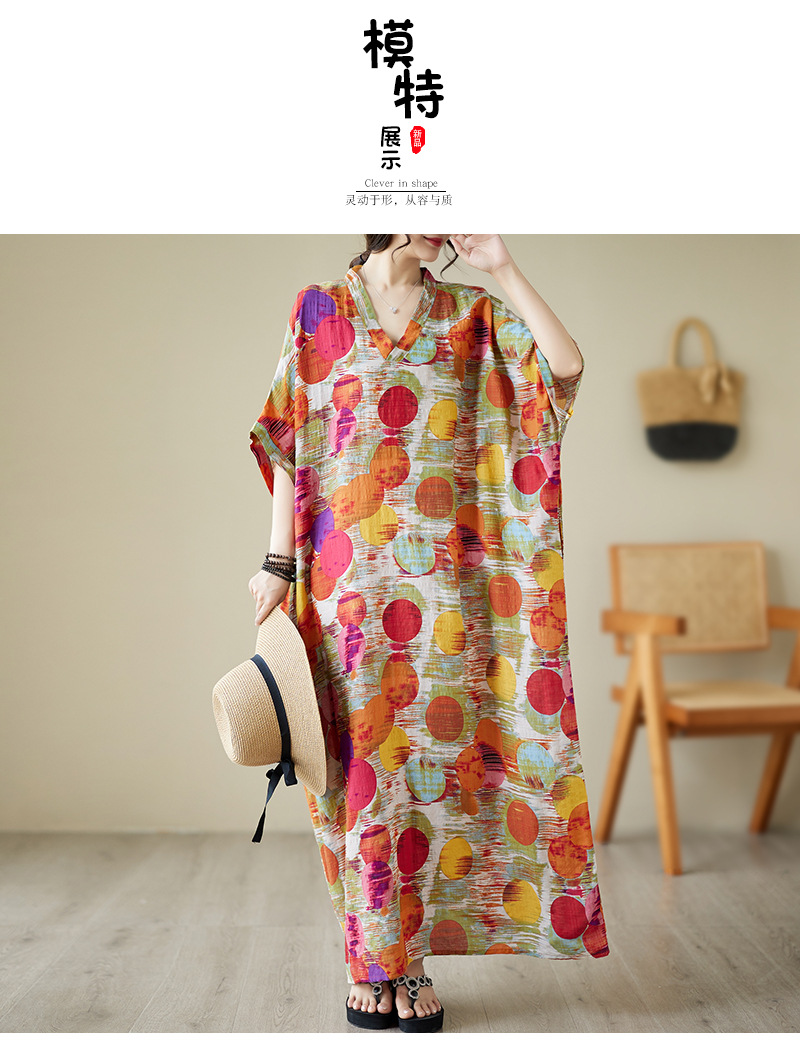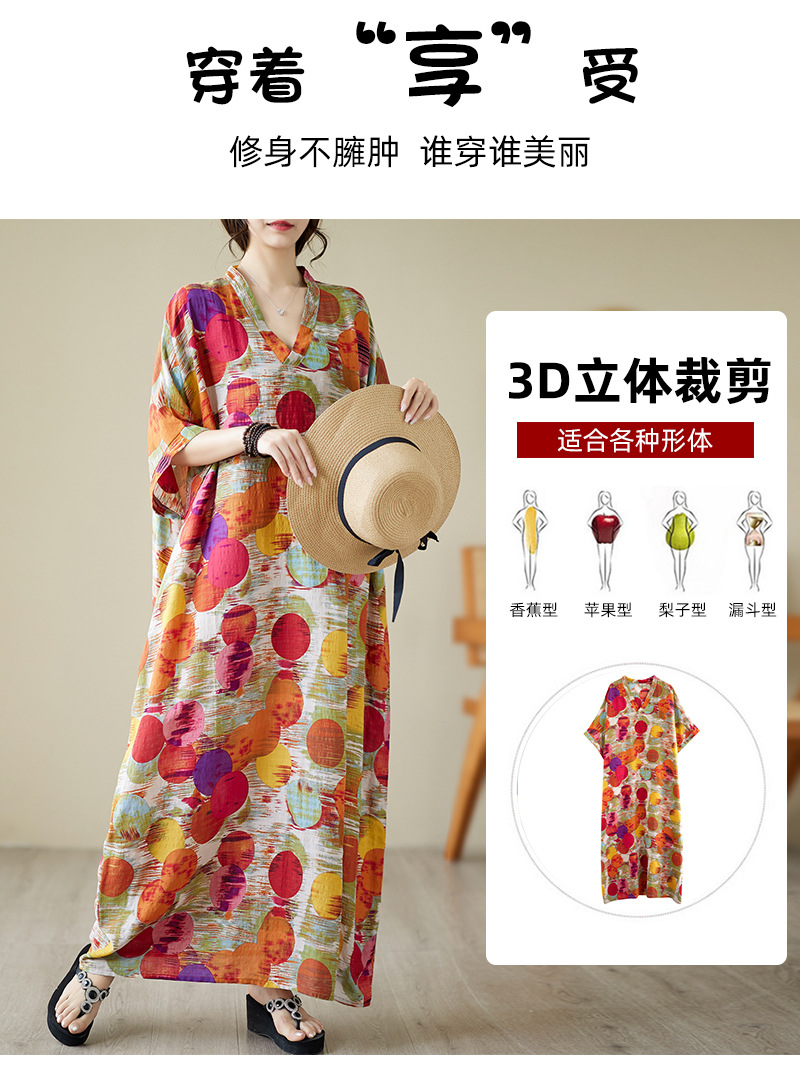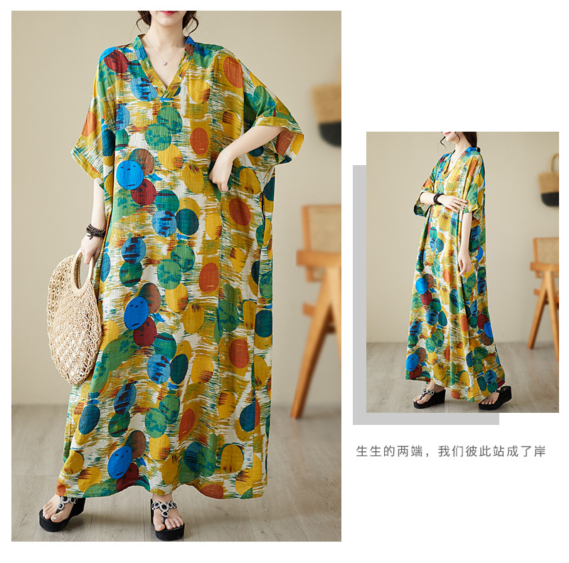 Real shot 2025 summer thin V-neck cotton and linen large size loose literary holiday wind beach dress long women