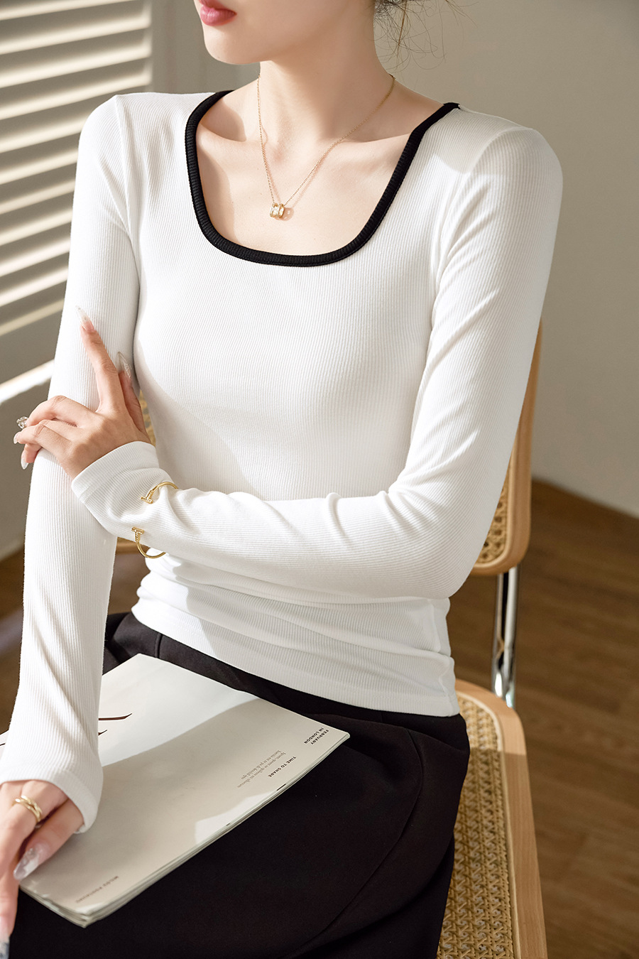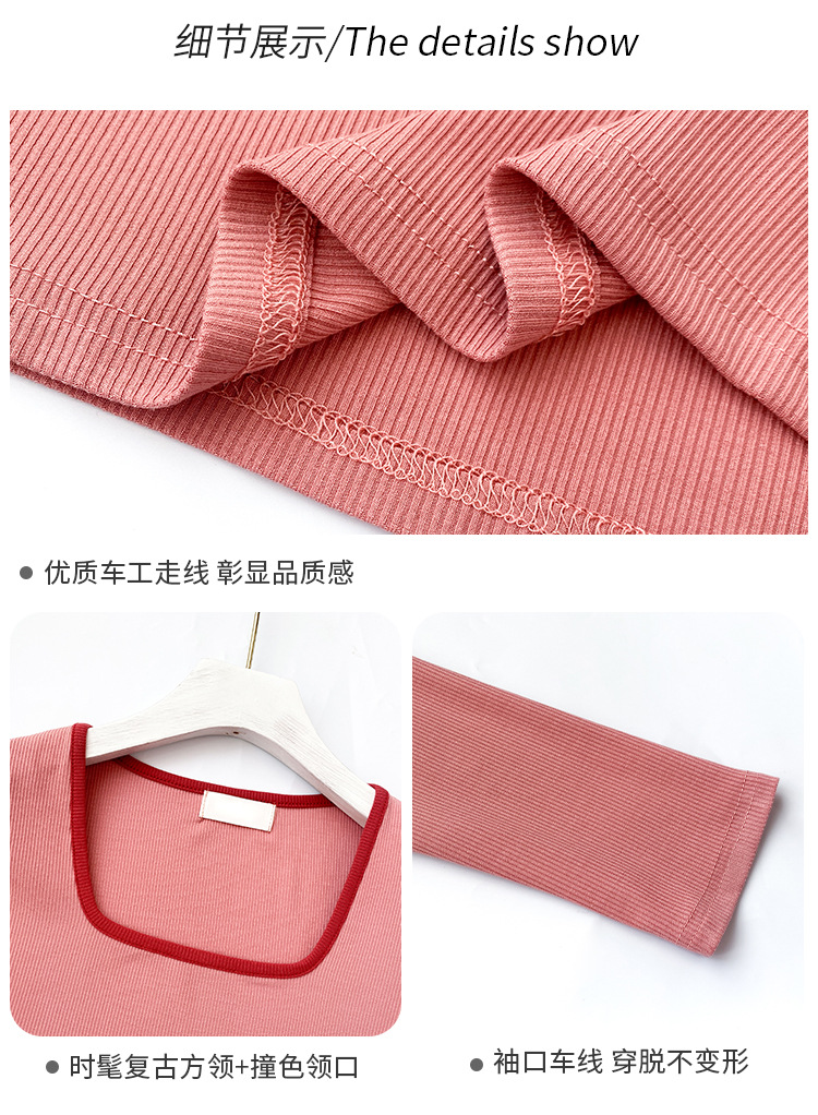 Selection of high elastic thin threaded square neck T-shirt women's long sleeves 2026 autumn and winter new outer wear contrasting color inner bottom top