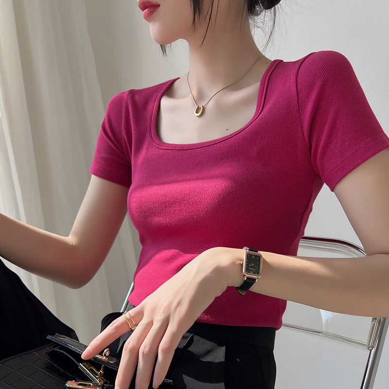 Selection of high-elastic threaded foreign gas square neck T-shirt women's short-sleeved 2026 summer new slim-fitting and thin bottoming shirt