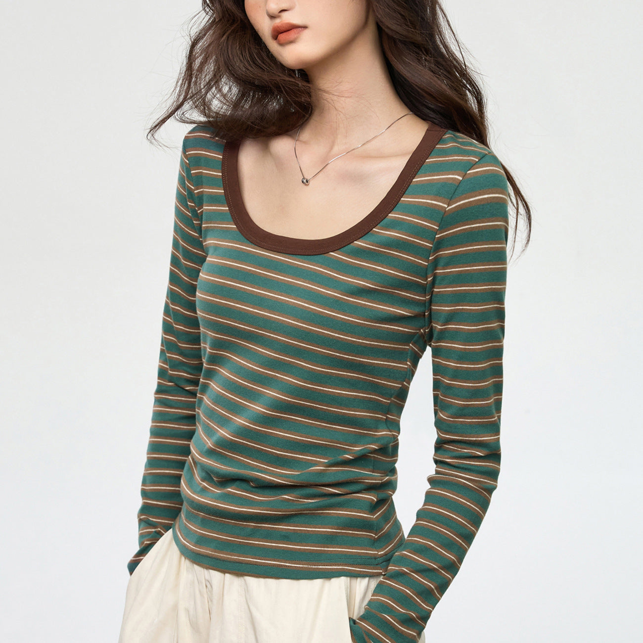 #Selection of pure cotton #Contrasting striped bottoming shirt for women with 2026 new foreign style big round neck long-sleeved T-shirt top