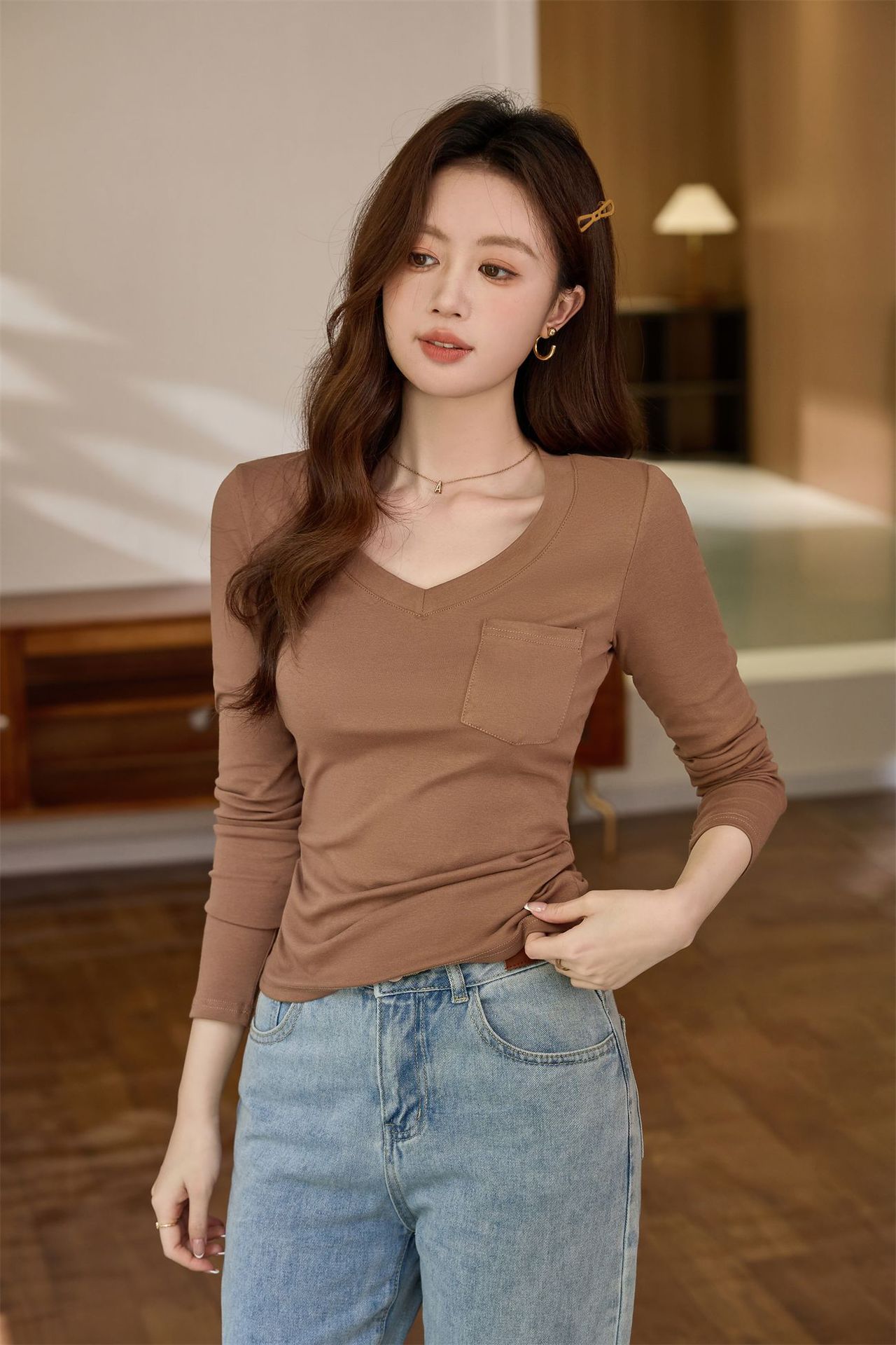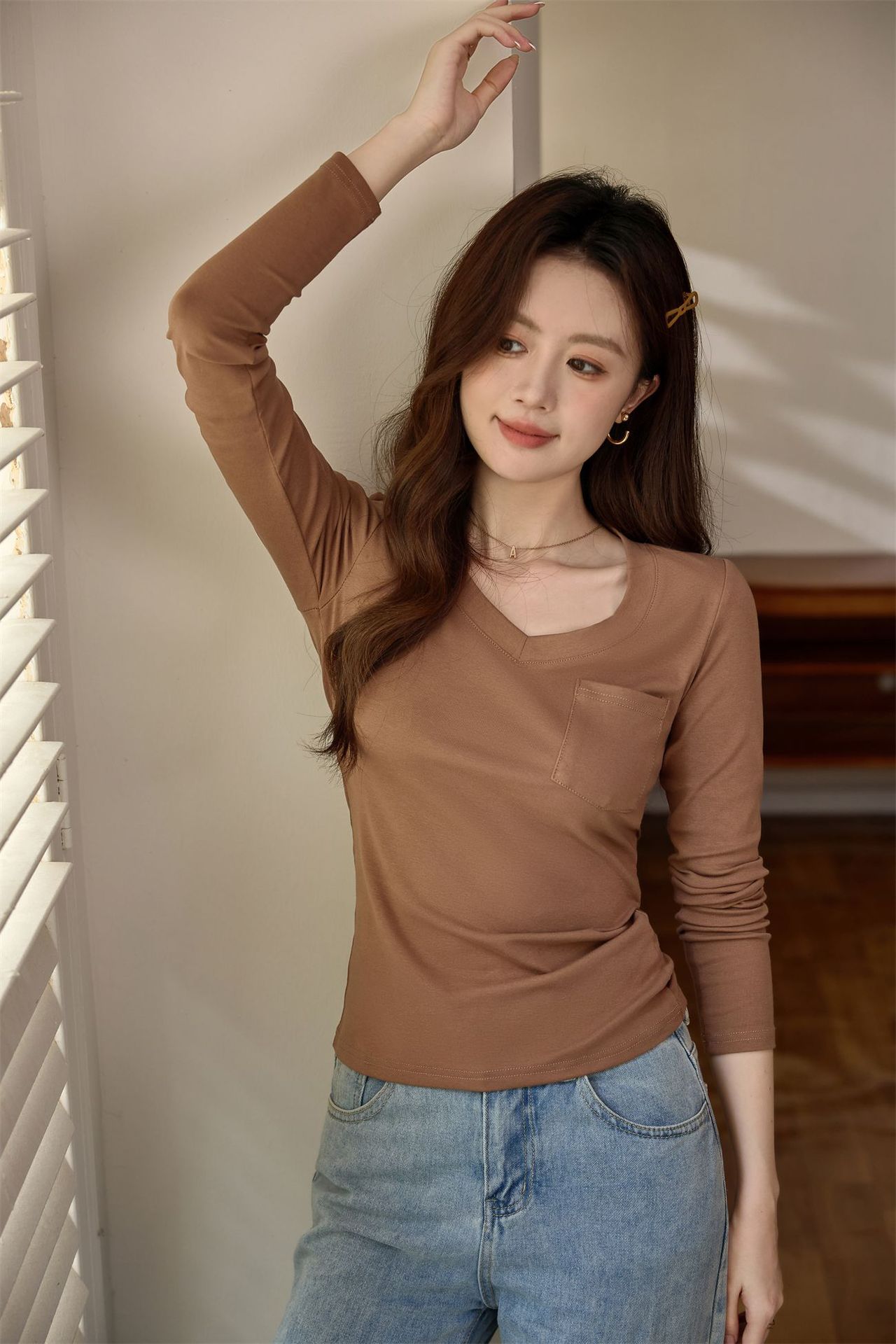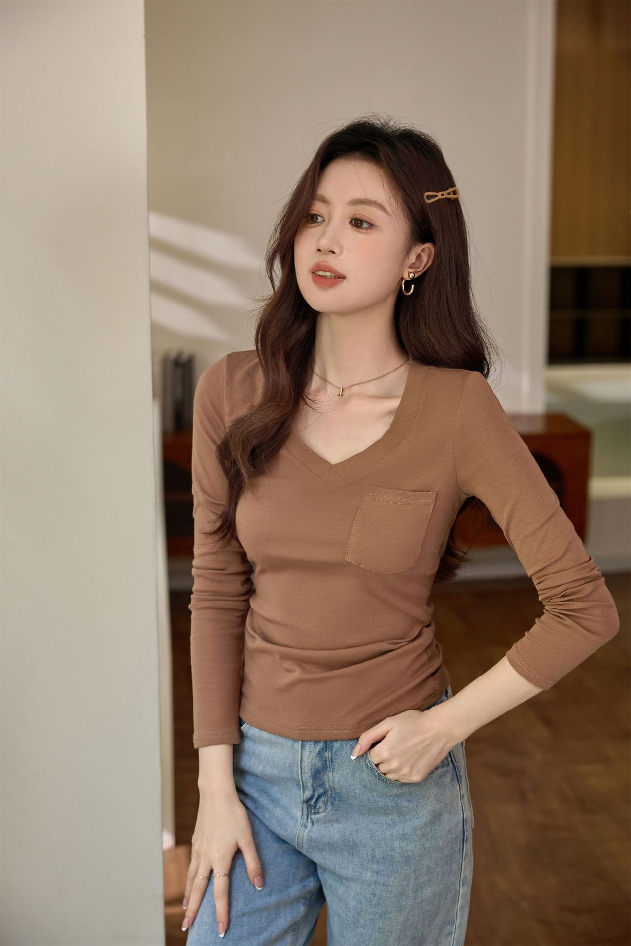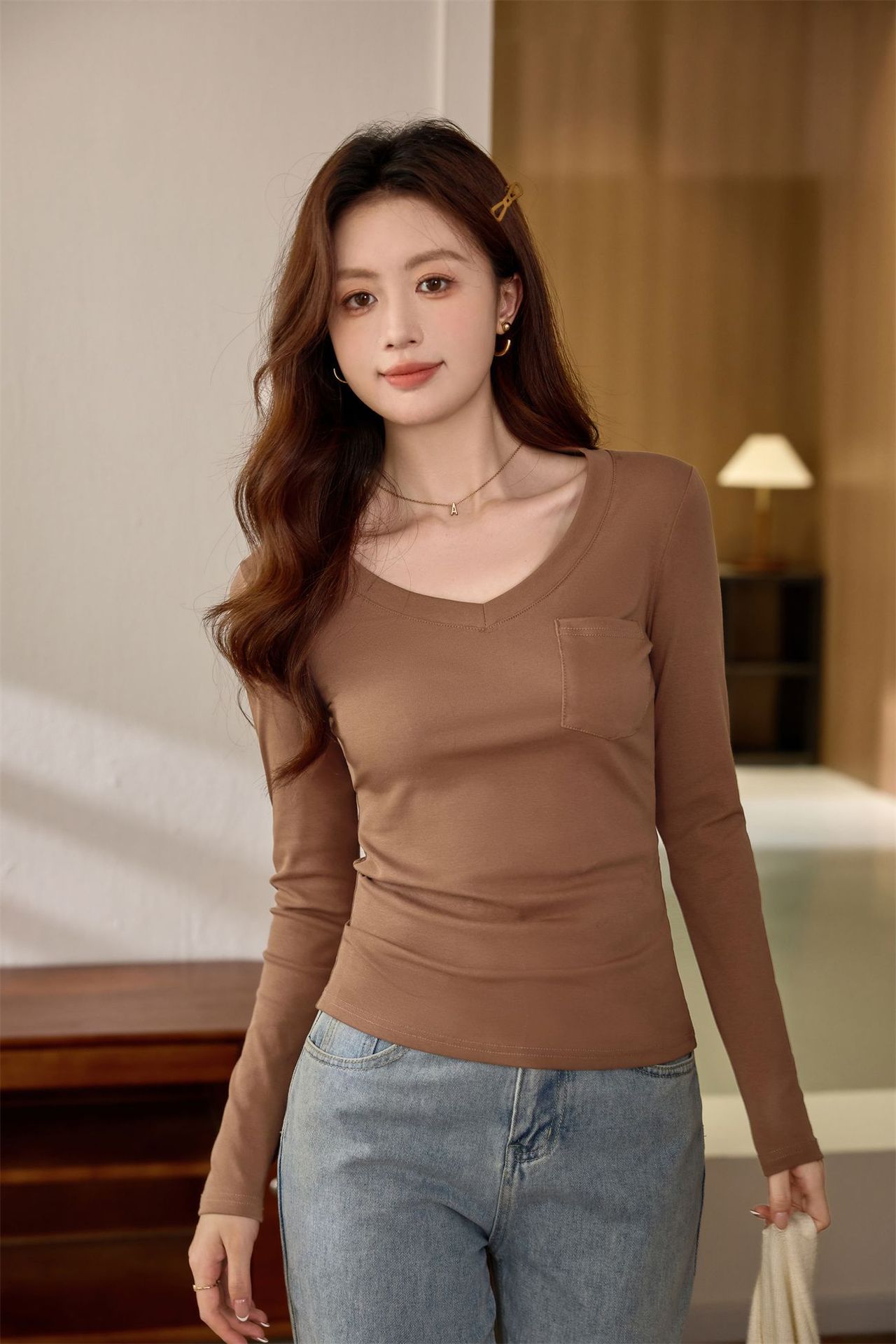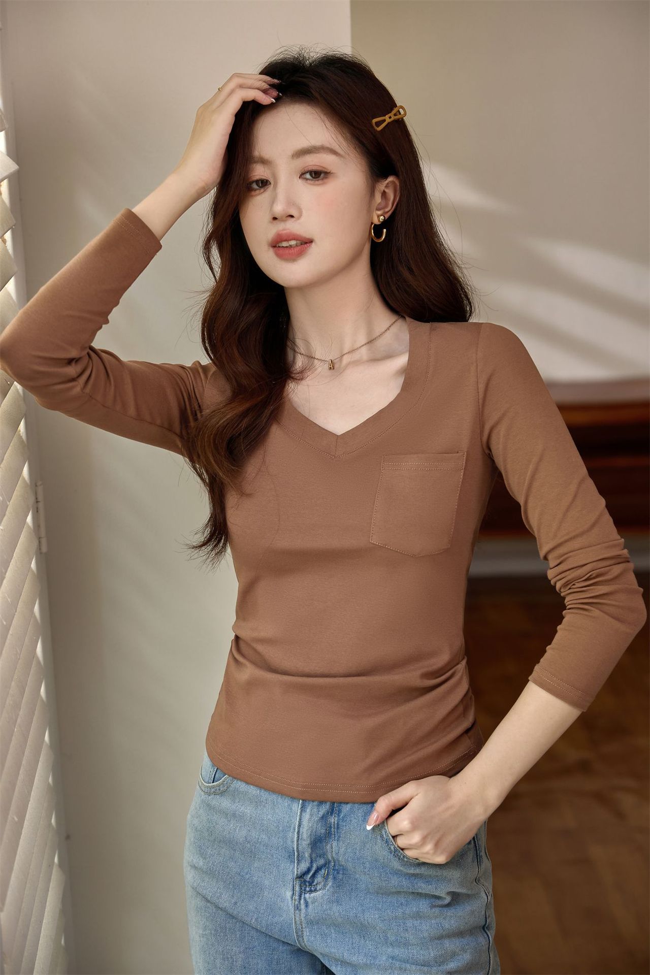 #Selection of pure cotton #Premium sense V-neck bottoming shirt women's long-sleeved t-shirt 2026 autumn new slim-fitting and thin top