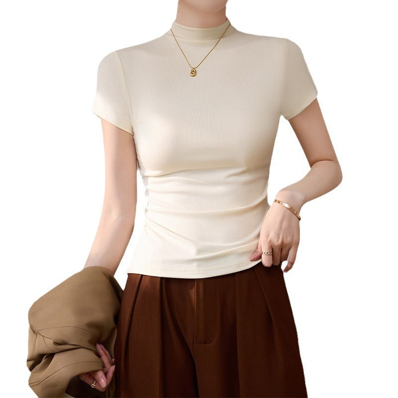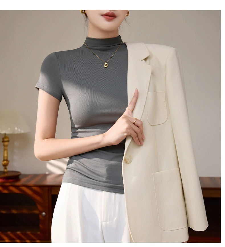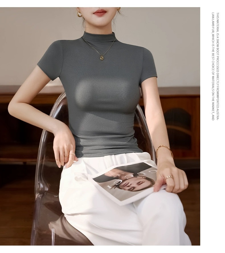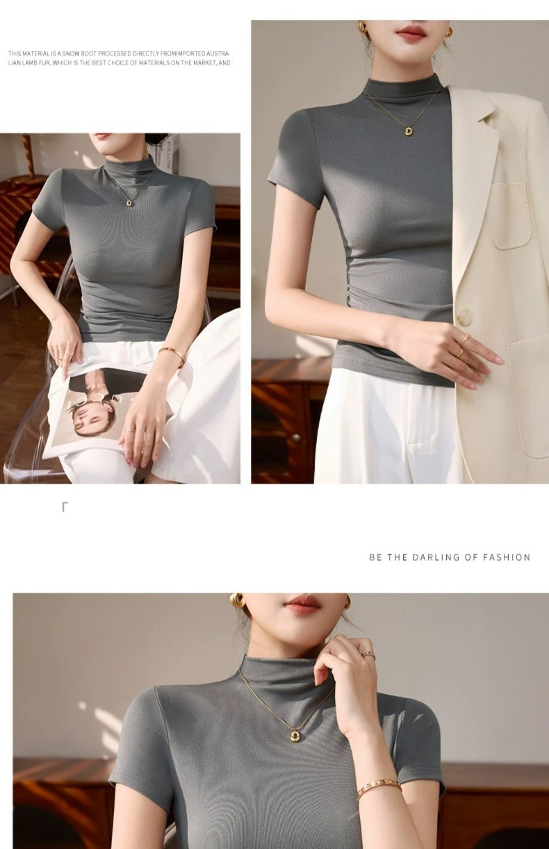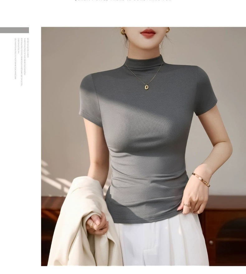 Semi-high-necked short-sleeved T-shirt women's Korean version of daily wear gray top threaded slimming hot girl spring and summer base shirt