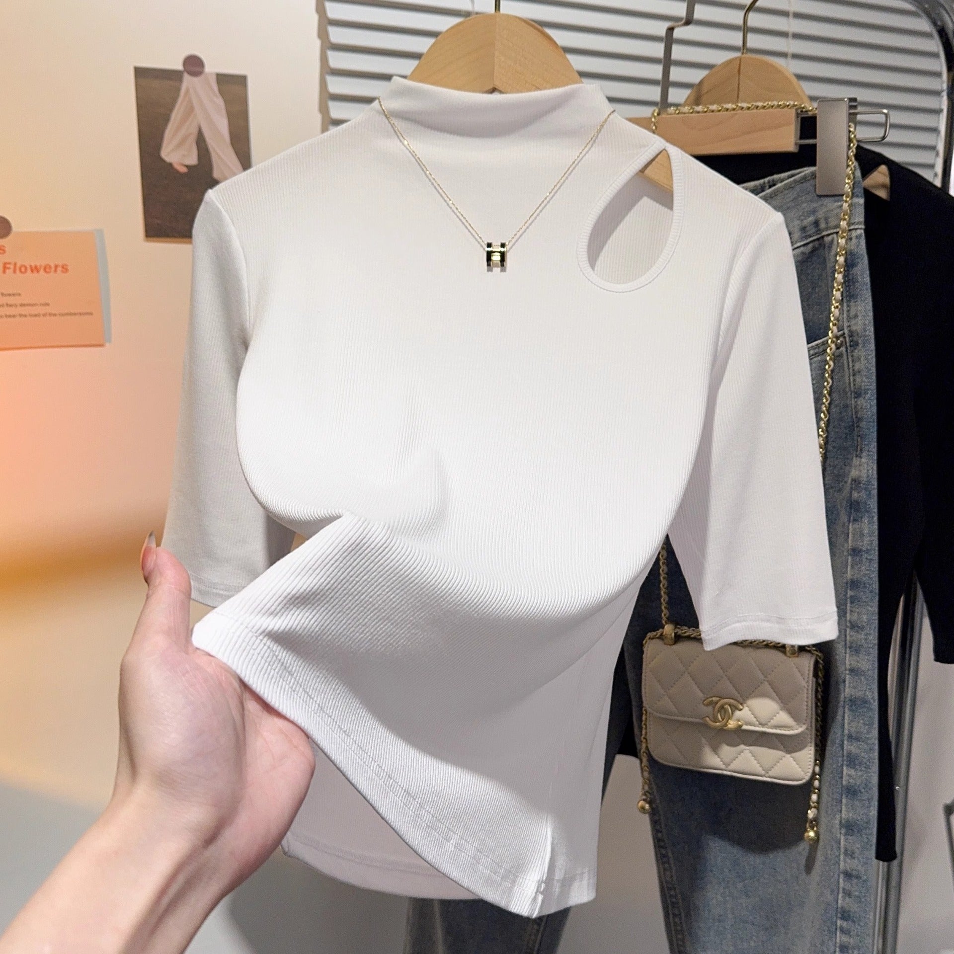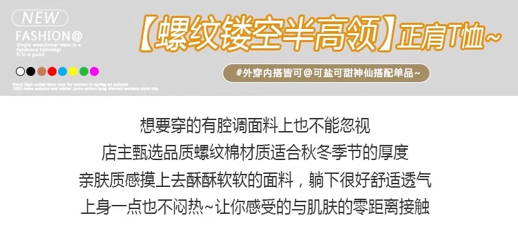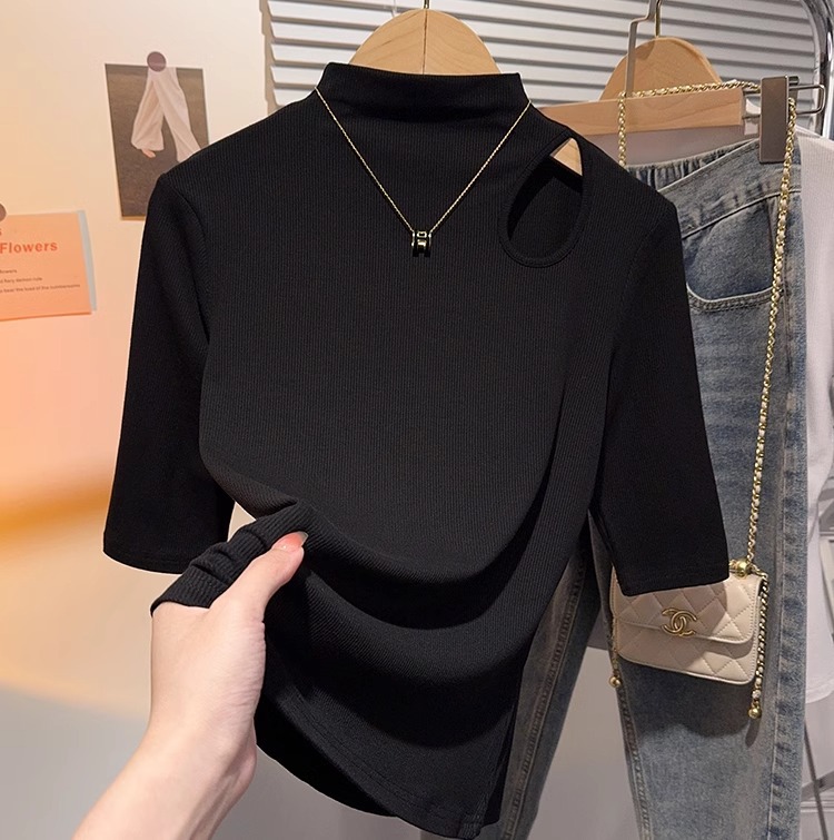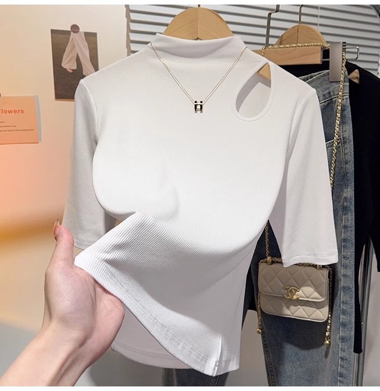 Semi-turtleneck medium-sleeved T-shirt for women's inner wear 2025 spring and summer new threaded hollow bottoming shirt versatile foreign style top