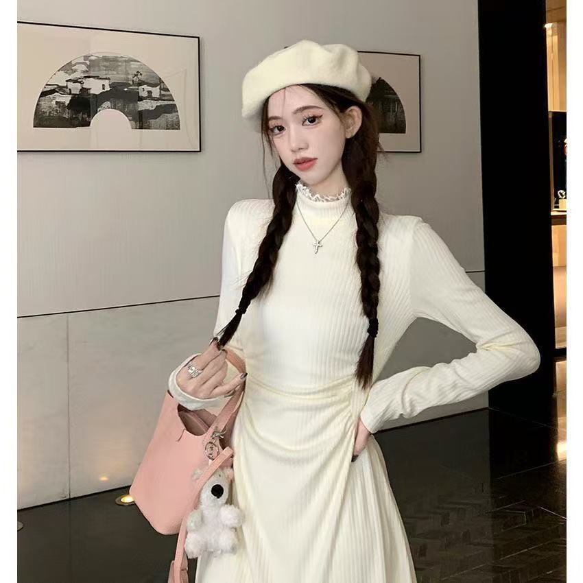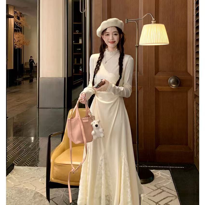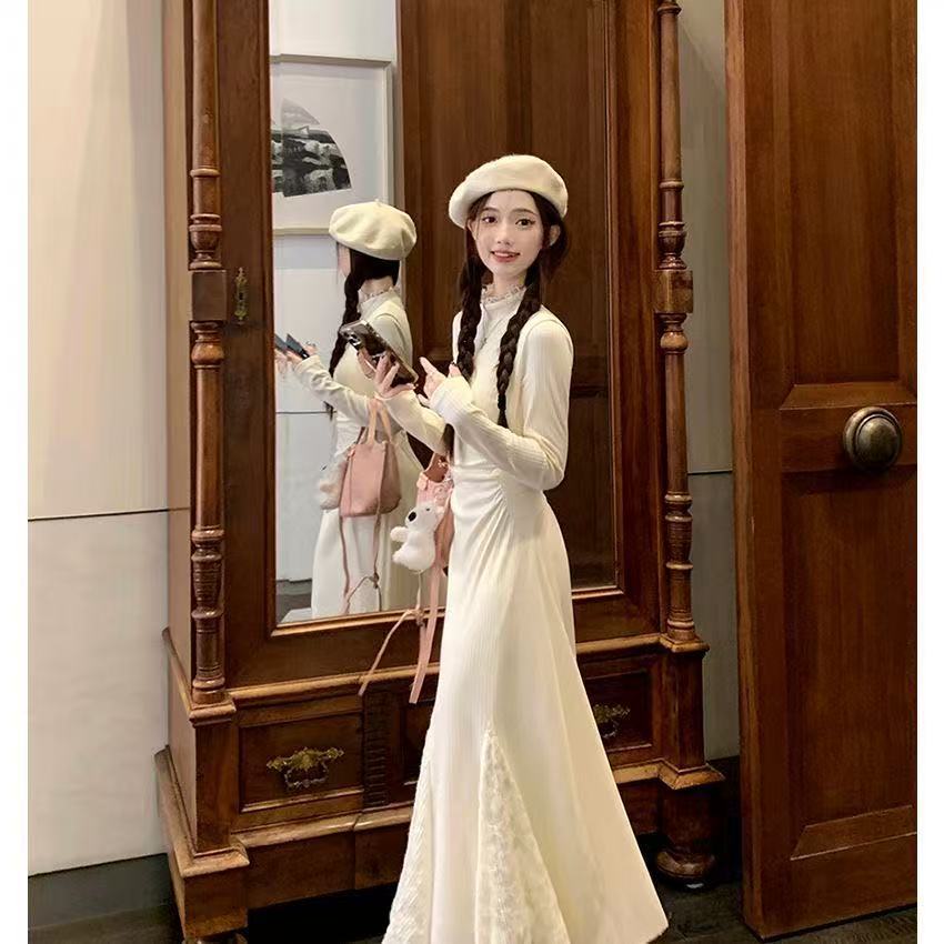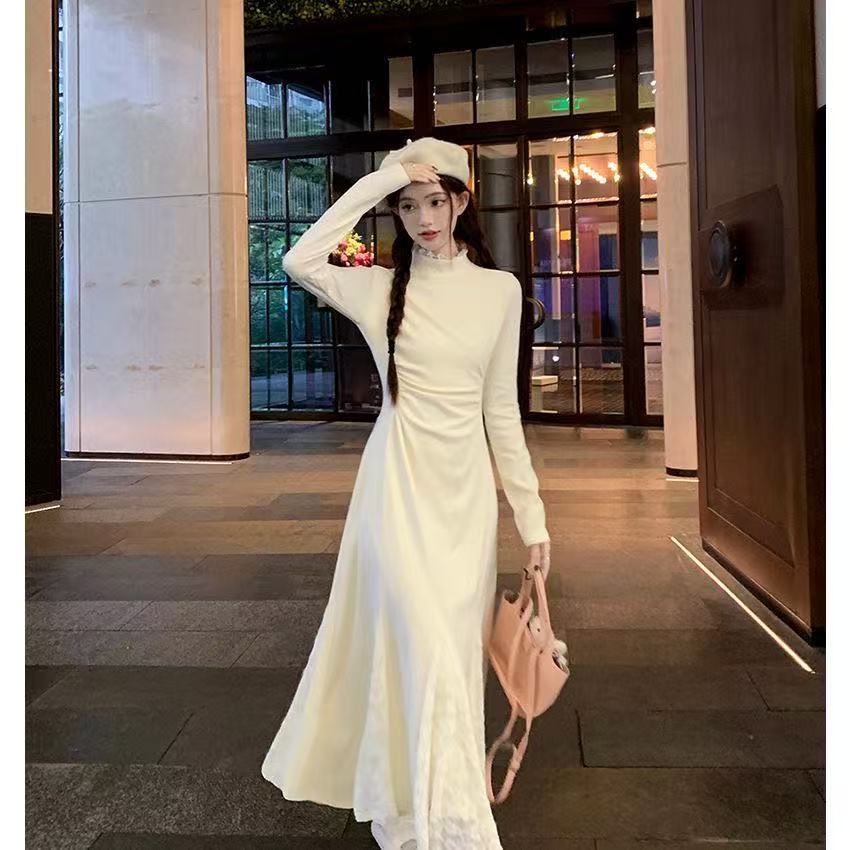 Small knitted dress autumn and winter long-sleeved lace splicing fishtail skirt waist half-high neck inner skirt
