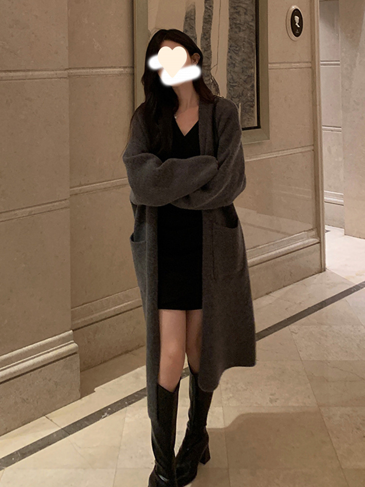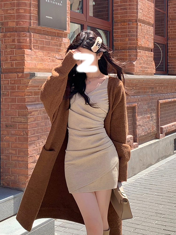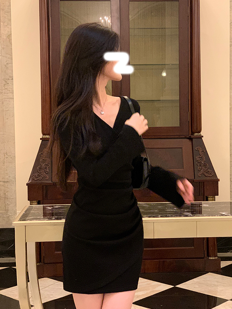Small V-neck waist pleated dress for women's spring and autumn long-sleeved slim-fitting short hip skirt
