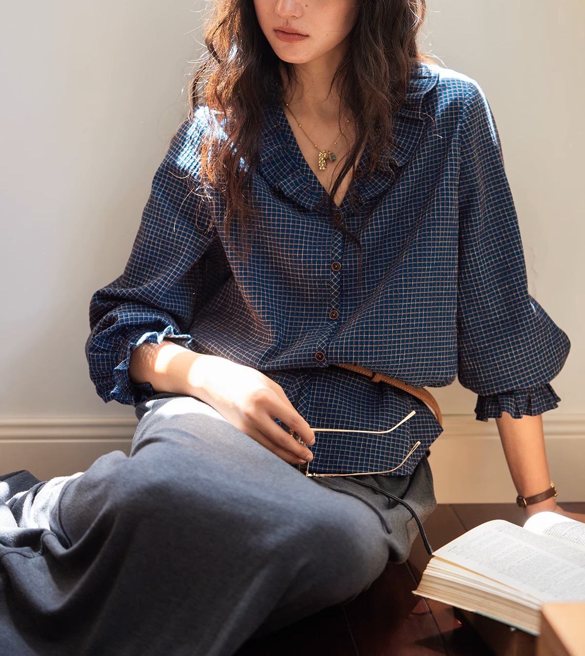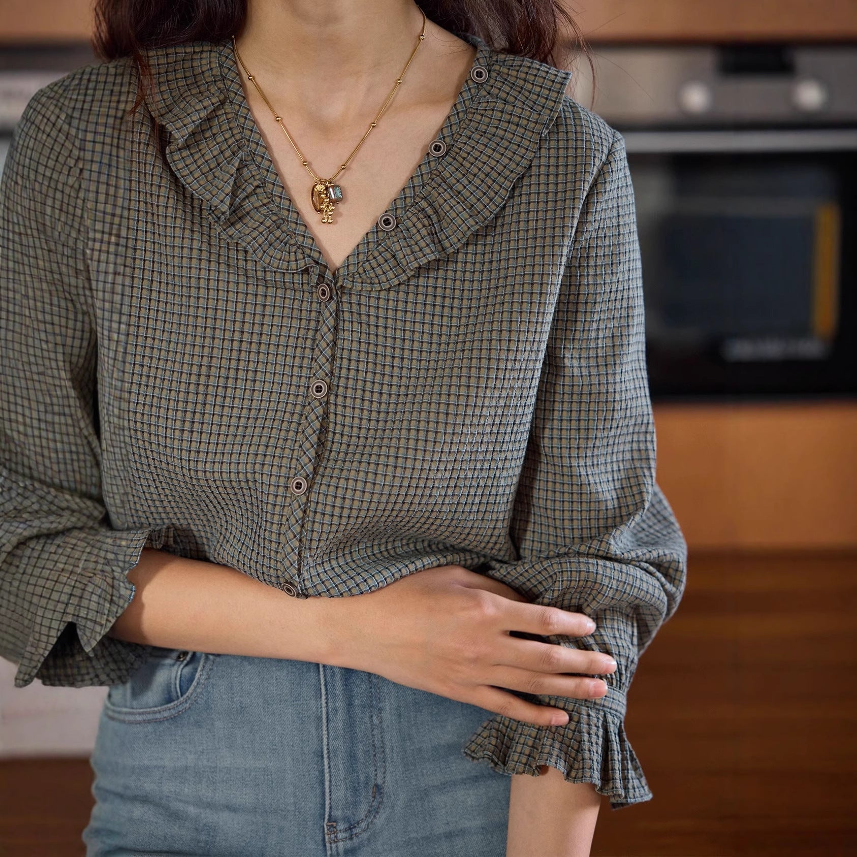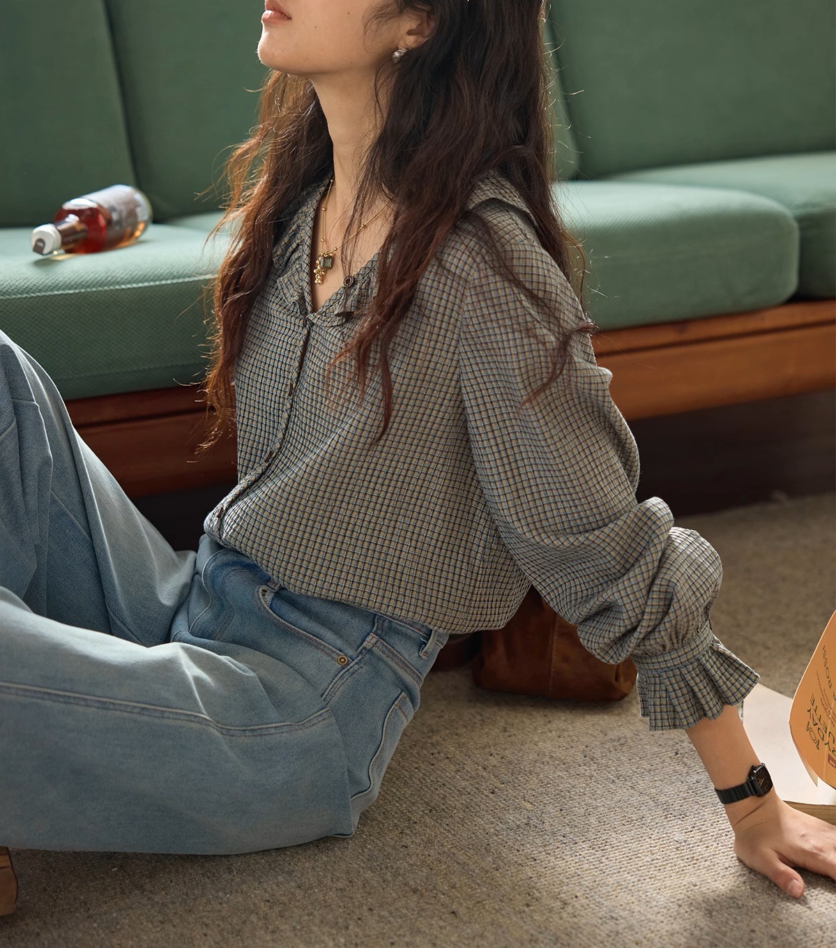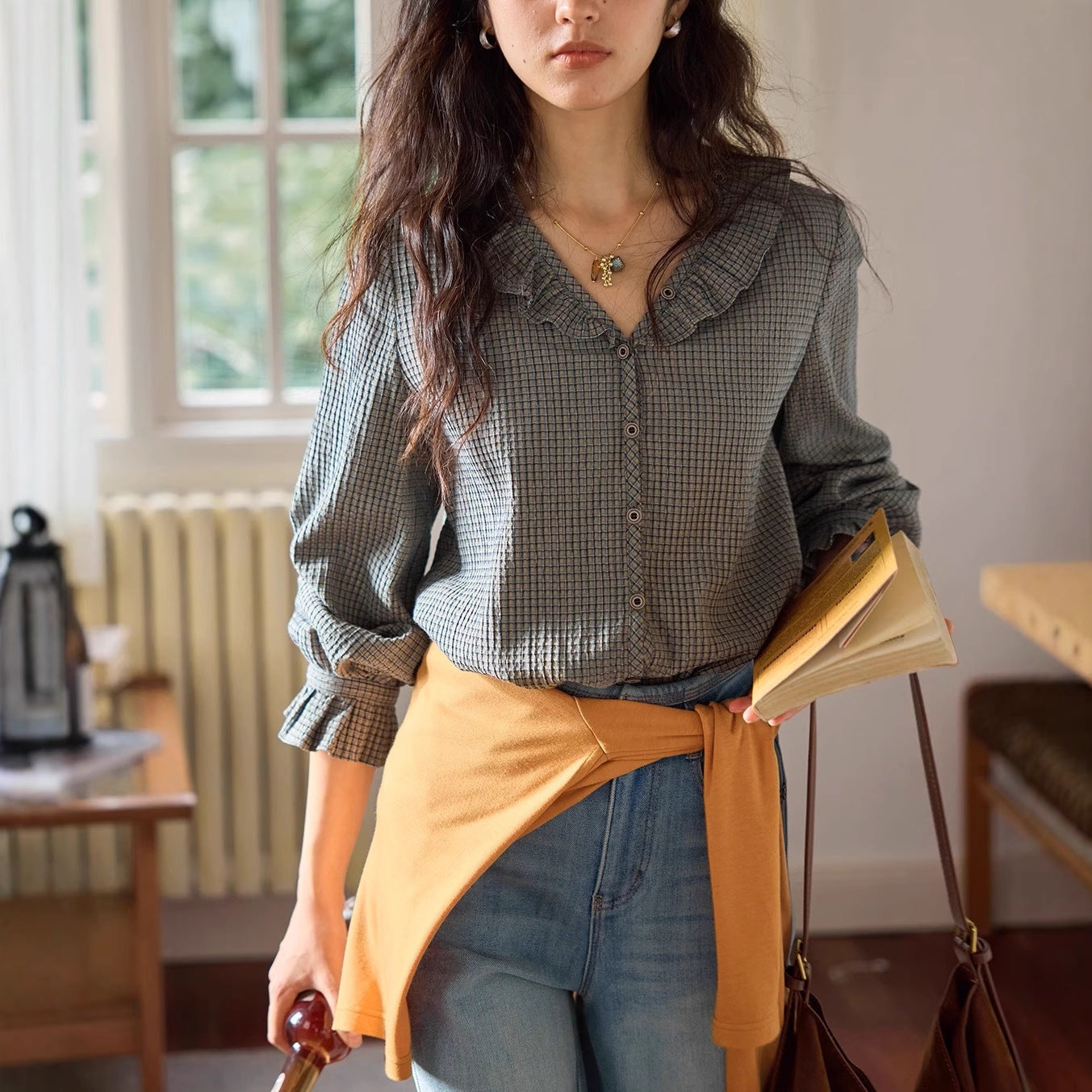 Solighter French Vintage V-Neck Checked Shirt Women's Autumn
